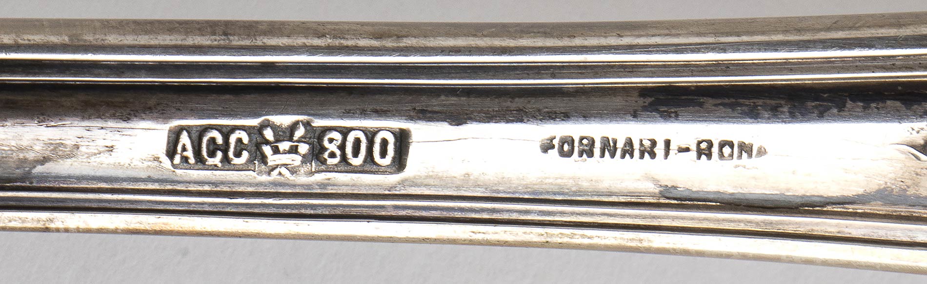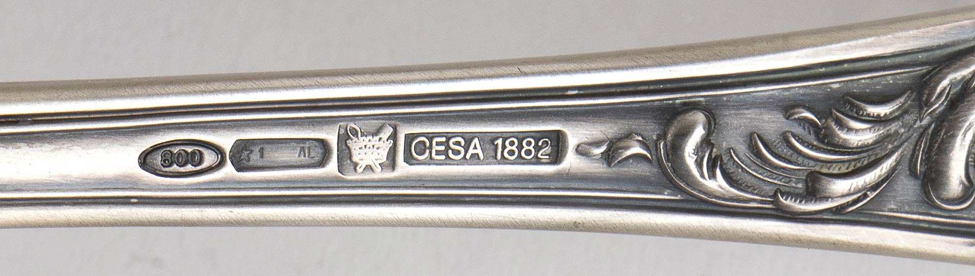 Composto da 36 forchette grandi (20,5 cm), 18 coltelli (25 cm) e 18 cucchiai grandi (21 cm), 18 forchette (17,5 cm) e 18 coltelli da frutta (21 cm), 18 forchette (17 cm) e 18 coltelli da pesce (21,5 cm), 18 cucchiaini te (13 cm), 18 cucchiaini caffè (11 cm), 10 posate da portata e un mestolo. Punzonato "800", argentiere "1AL" CESA 1882. Peso lordo incluso le lame dei coltelli in acciaio 13.240 gr, peso netto 11.070 gr circa. Stato di conservazione: **** buono.