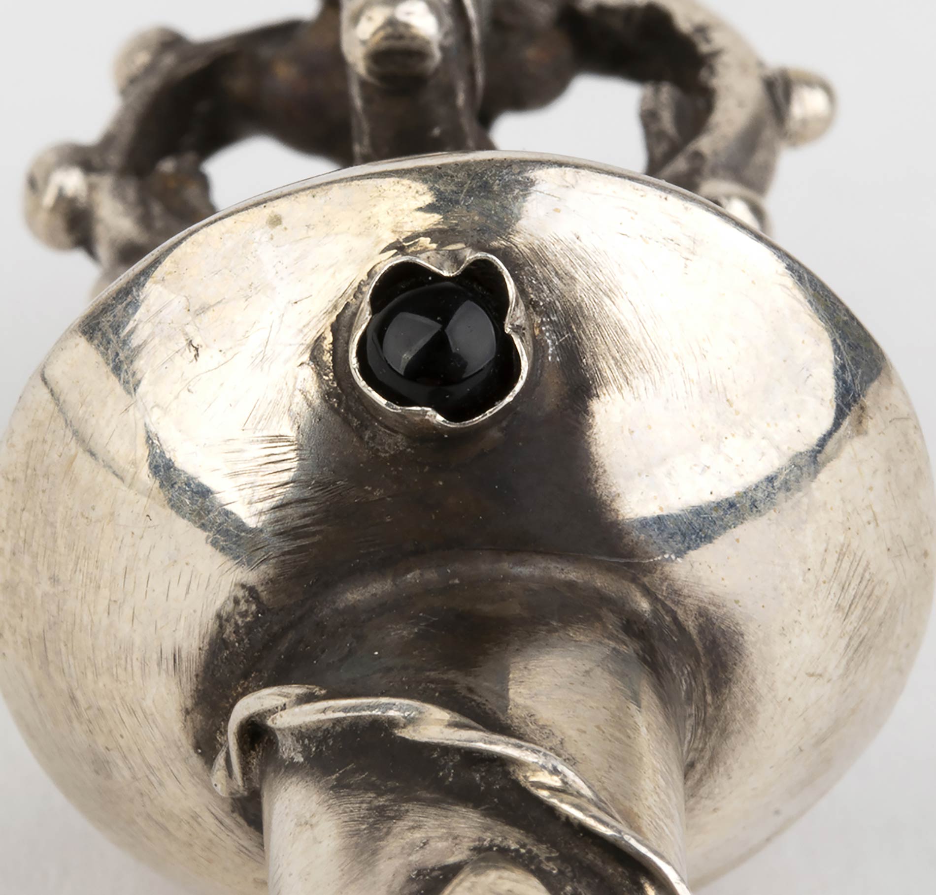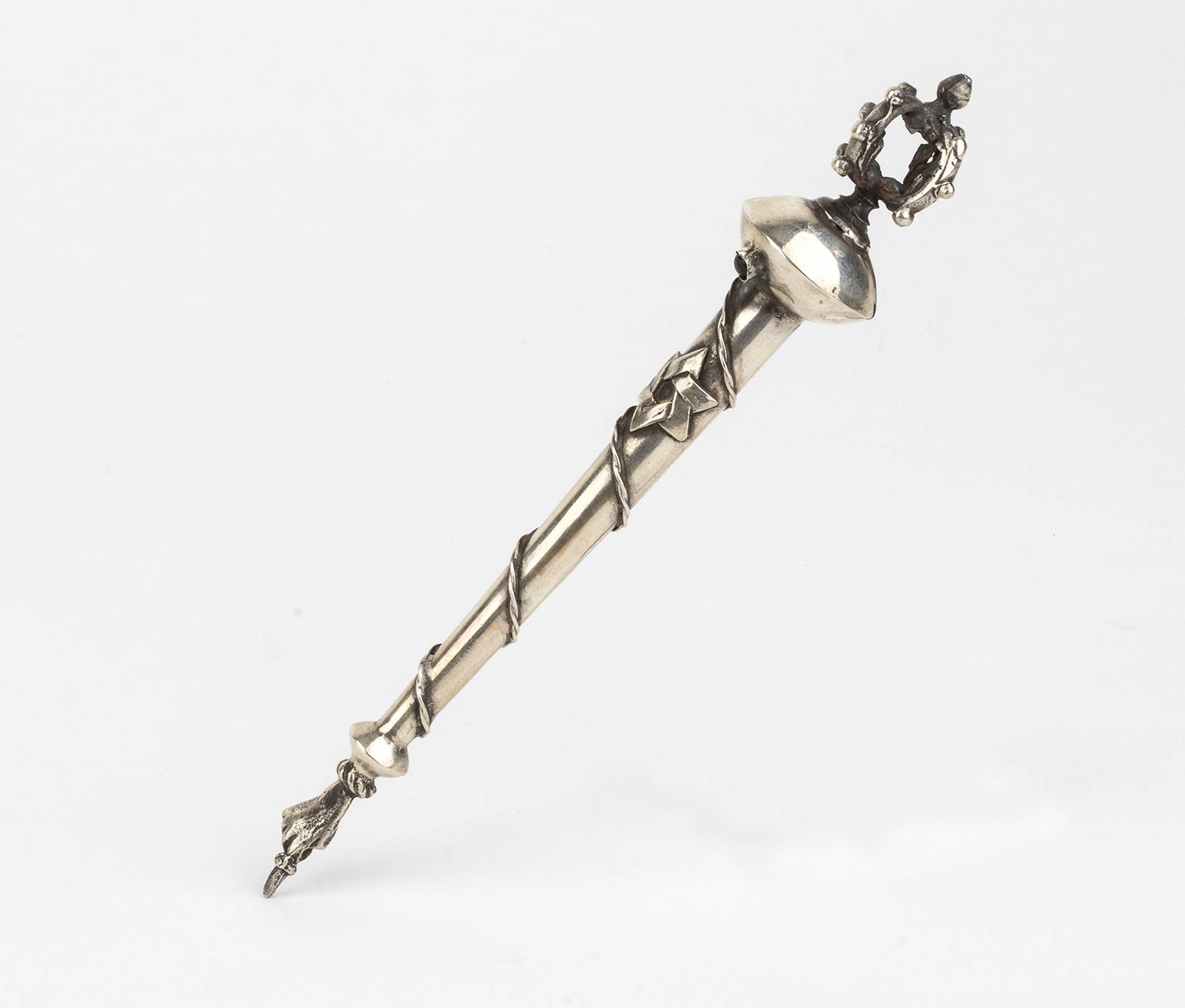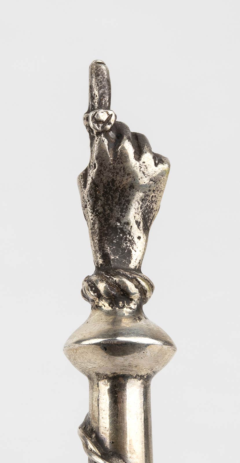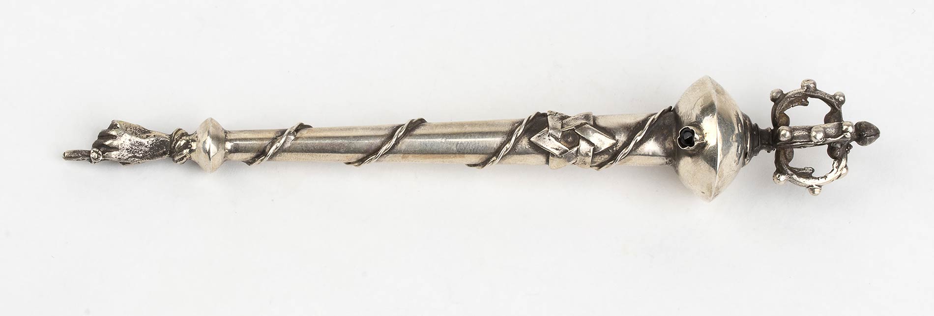puntatore usato per guidare le letture pubbliche del testo dei rotoli della Torah. Punzonato con marchi Russi apocrifi del 1884 per l'argento al titolo di 84 zolotniks. Lunghezza 16 cm. Peso 27 gr. Stato di conservazione: **** buono.