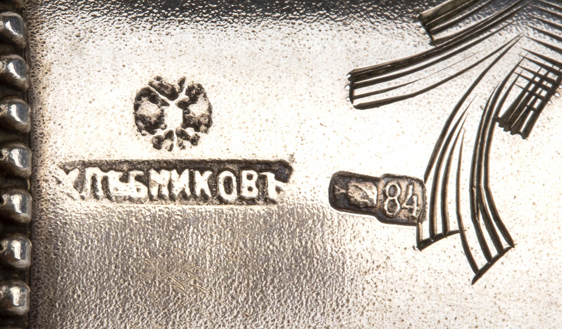 con pordi perlinati, entrambe incisi con fiori. Serie completa di marchi per l'argento al titolo di 84 zolotniks (875/1000) in uso a Mosca nel periodo 1908-1927, argentieri Partnership Ivan Khlebnikov, Sons & Co. Diametro 4,1 cm. Peso 54 gr. Stato di conservazione: **** buono.