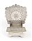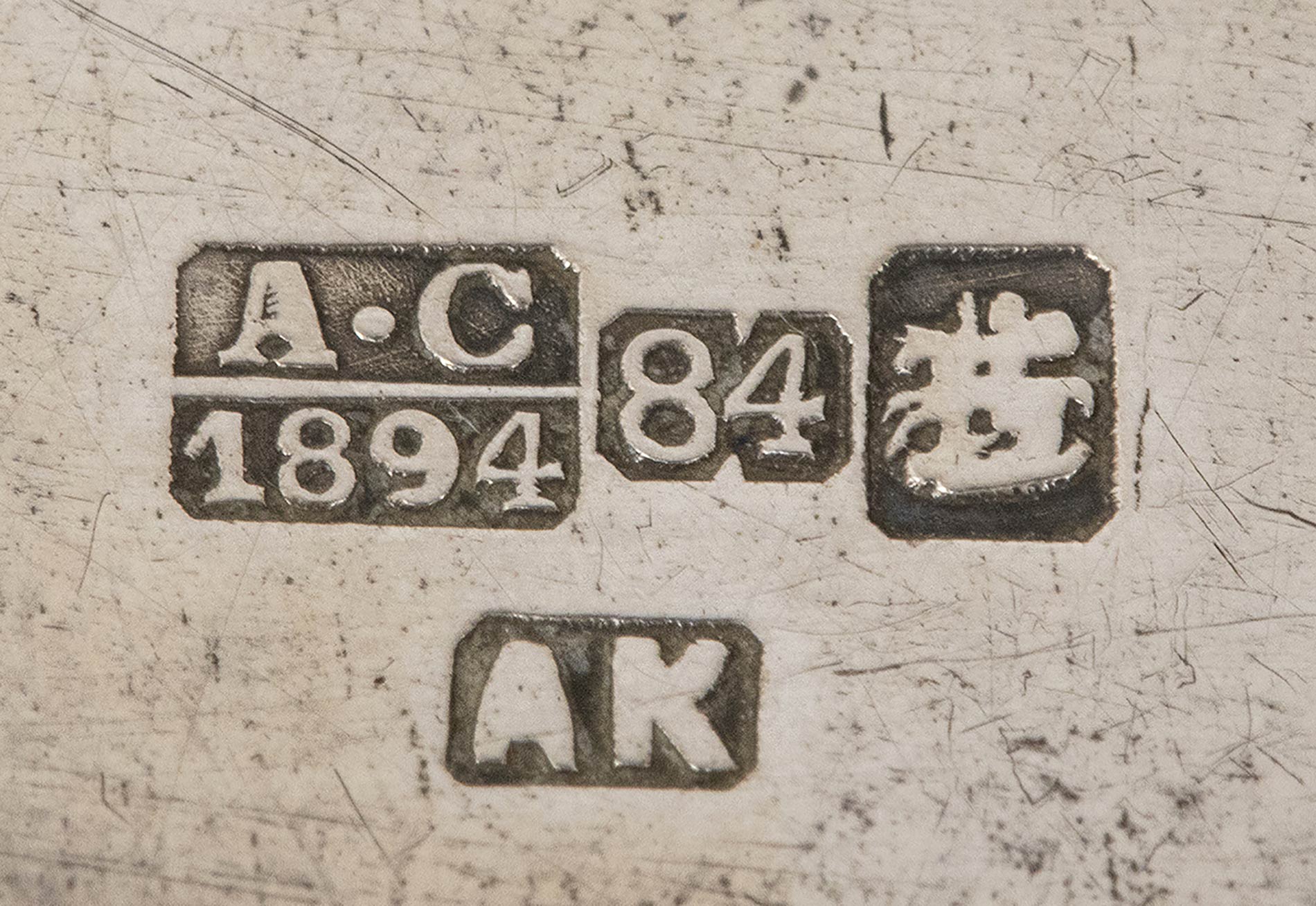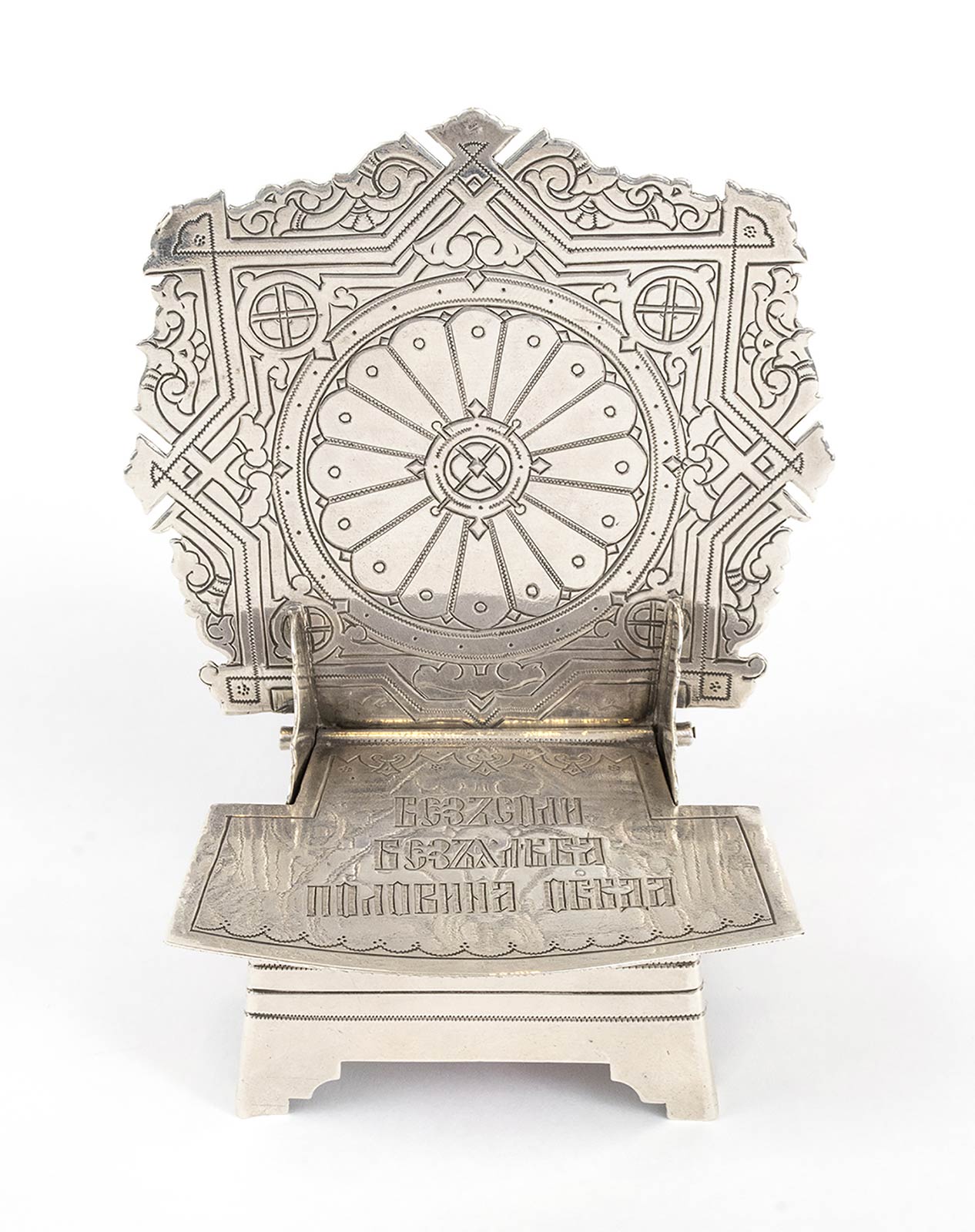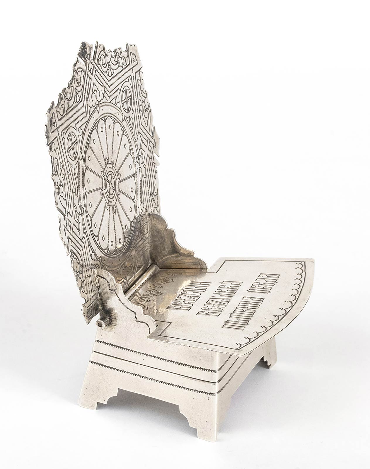di forma tradizionale, su piedi a mensola, con schienale trapezoidale e base con seduta incernierata. Serie completa di marchi per l'argento al titolo di 84 zolotniks (875/1000) in uso a Mosca nel 1894, assaggiatore Aleksandr Alekseyevch Smirnov, argentiere Antip Kuzmichev. Dimensioni 8.5 x 8.5 x 10.5 cm. Peso 120 gr.. Stato di conservazione: **** buono.