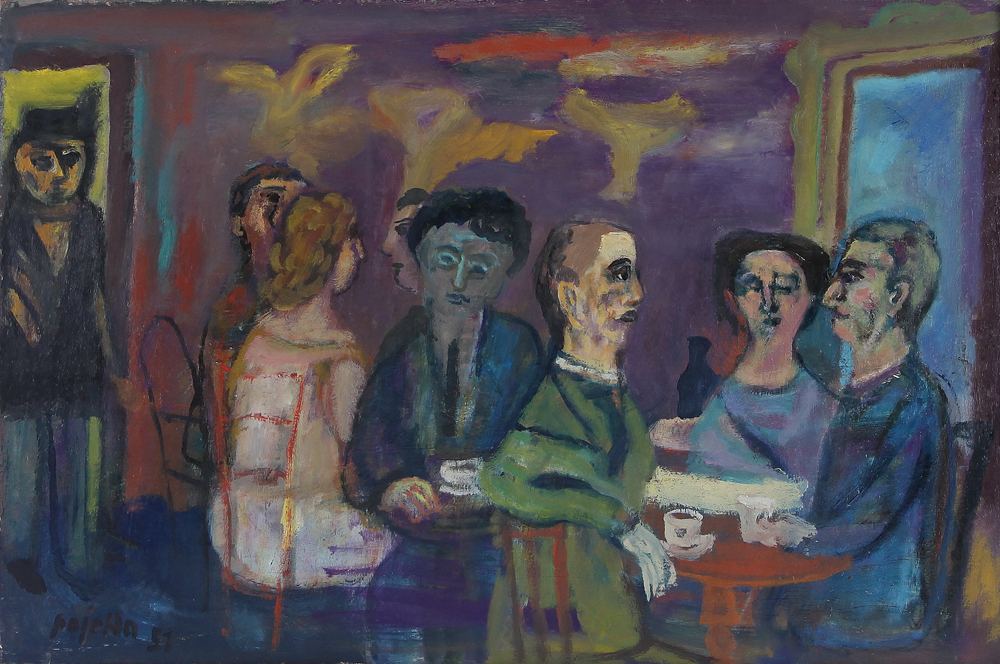 GUIDO PAJETTA Monza (Mi) 08/02/1898 - Milano 15/02/1987 Personaggi in osteria, 1951 olio su tela cm. 54x82, firma e anno in basso a sinistra, opera registrata presso l'Archivio Guido Pajetta al numero 2323 come da dichiarazione dell'Arch. Giorgio Pajetta su foto, pubblicato su "Guido Pajetta, catalogo generale ragionato dei dipinti", volume primo, 1914-1963, a cura di Enrico Crispolti, Edizioni Mazzotta, pagina 418 al numero 1951/7.