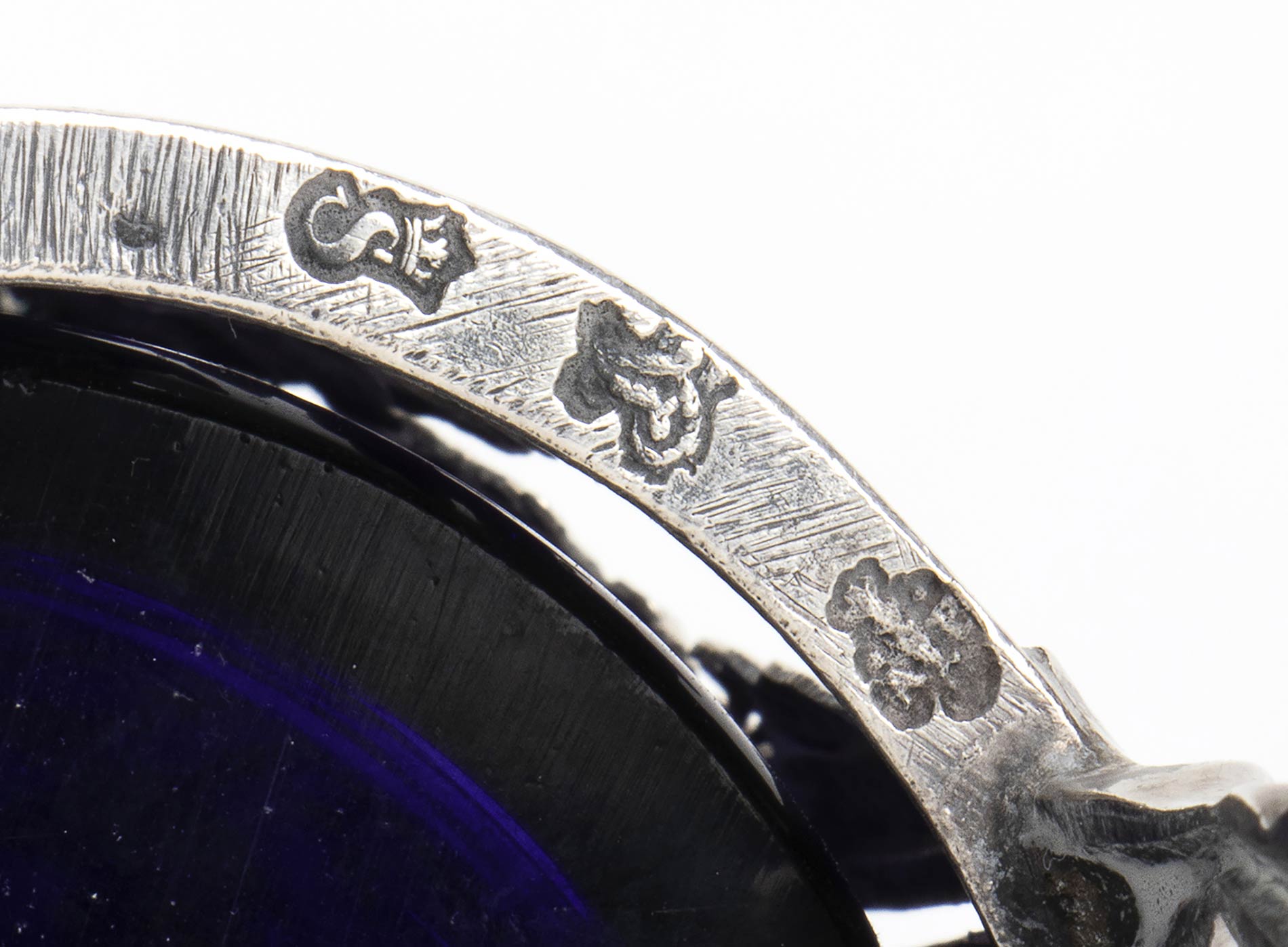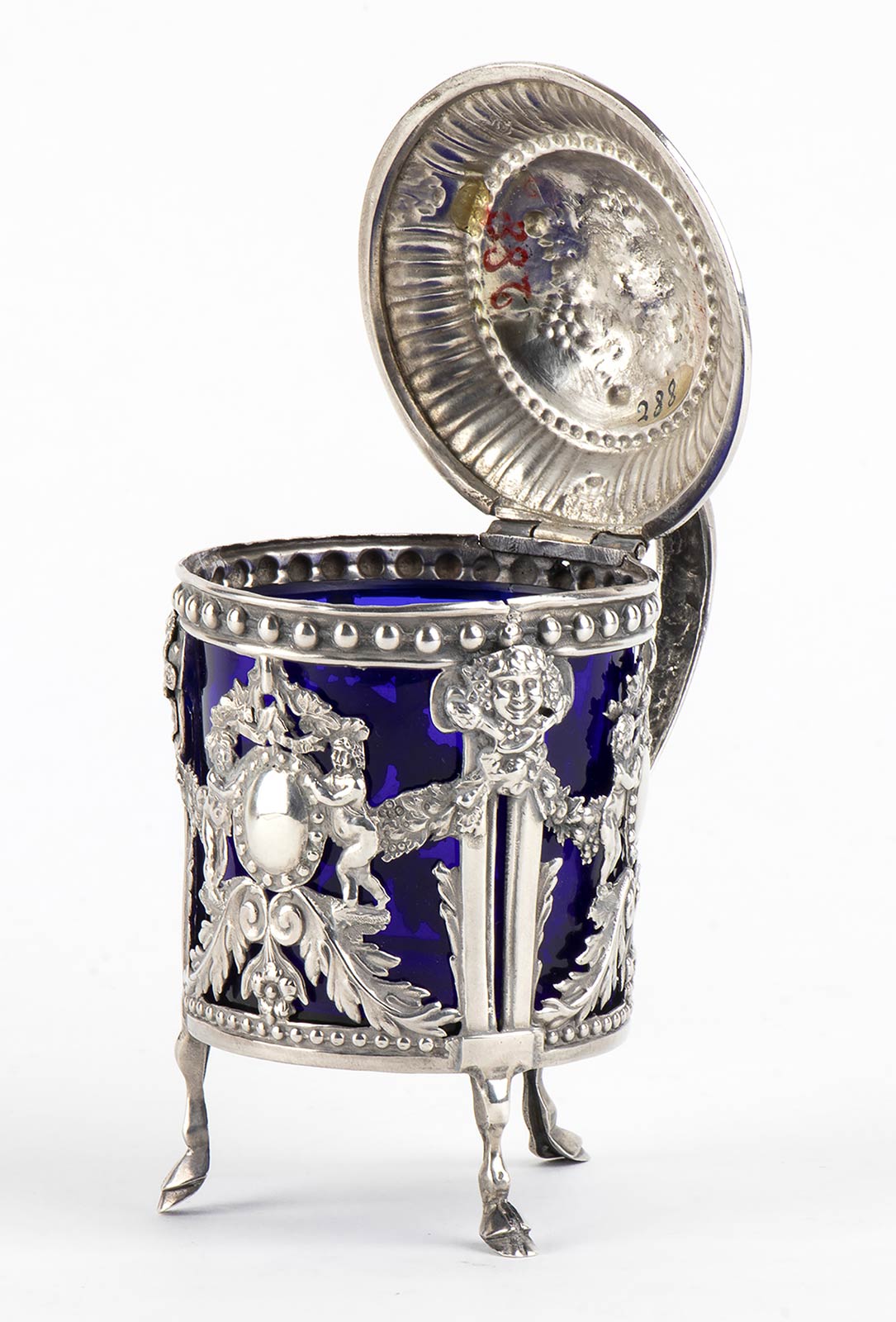 in argento sbalzato e cesellato, coperchio incernierato con contenitore in vetro blu coevo. Serie completa di marchi in uso a Parigi nel 1781, argentiere non identificato. Diametro 6,2 cm, altezza 11,5 cm. Peso 206 gr. Stato di conservazione: **** buono.