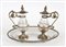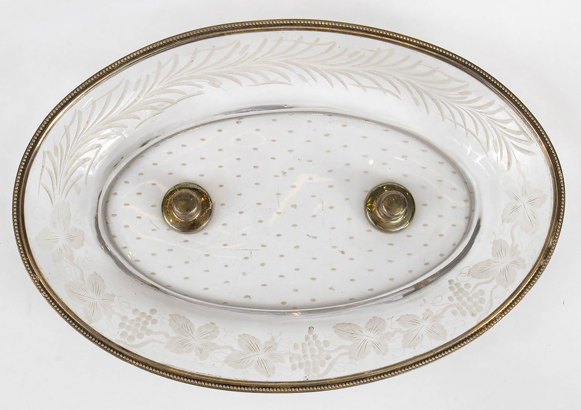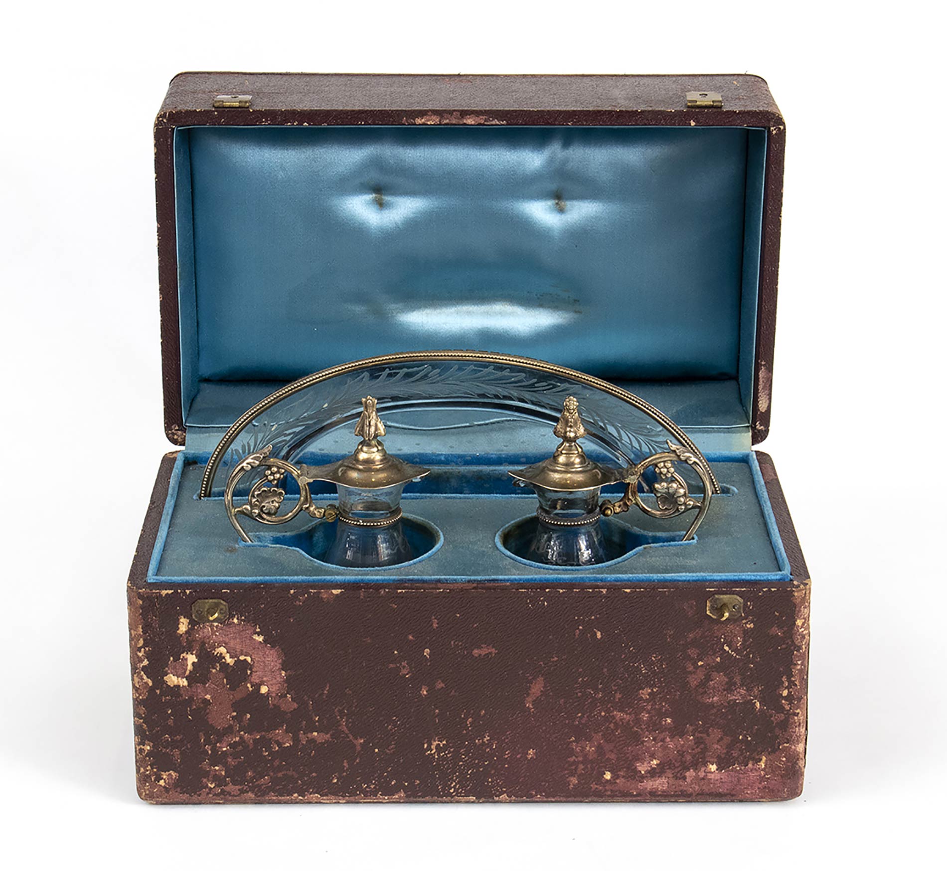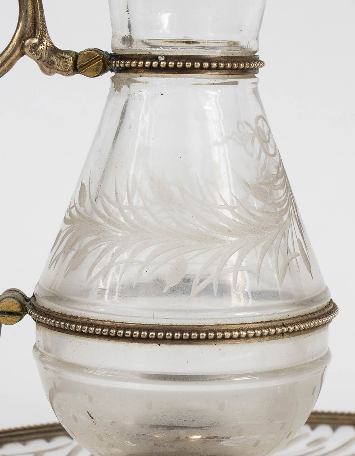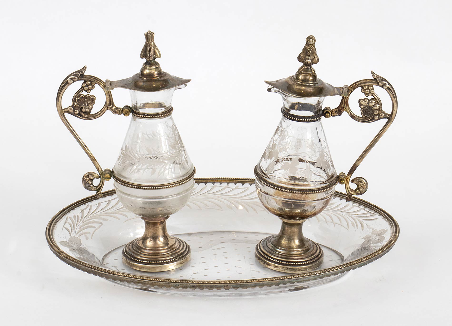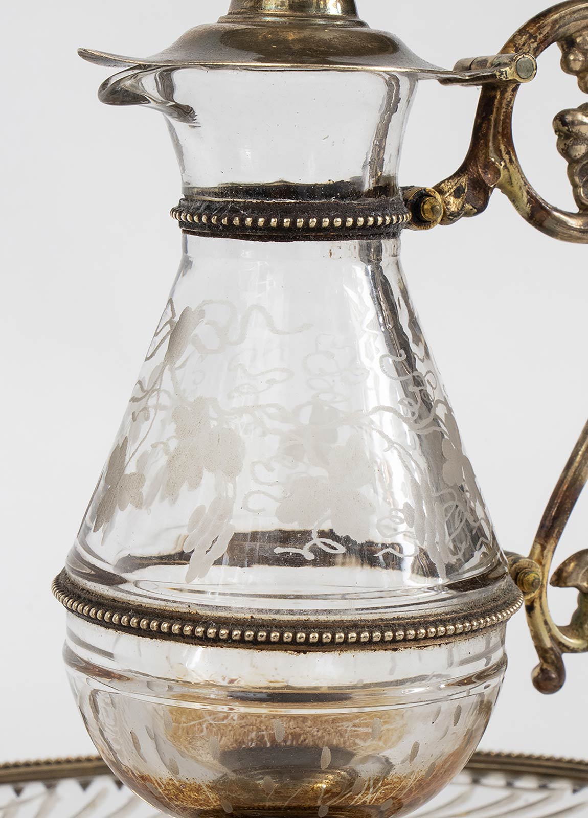 in cristallo a decori floreali e argento dorato. Completa di custodia originale. Punzonata con marchi francesi post 1838 in uso a Parigi per l'argento 950/1000, argentiere Demarquet frères operante a Parigi dal 1863. Dimensioni 24 x 16 cm, altezza 16 cm. Peso 1030 gr. Stato di conservazione: **** buono.
