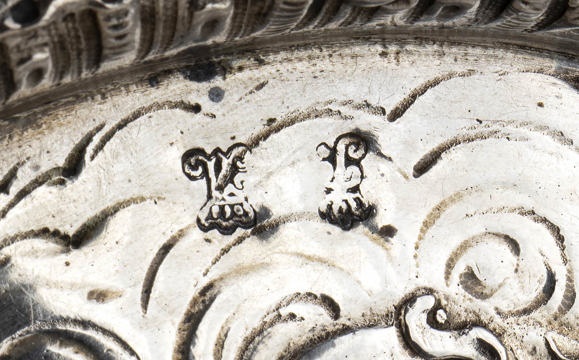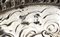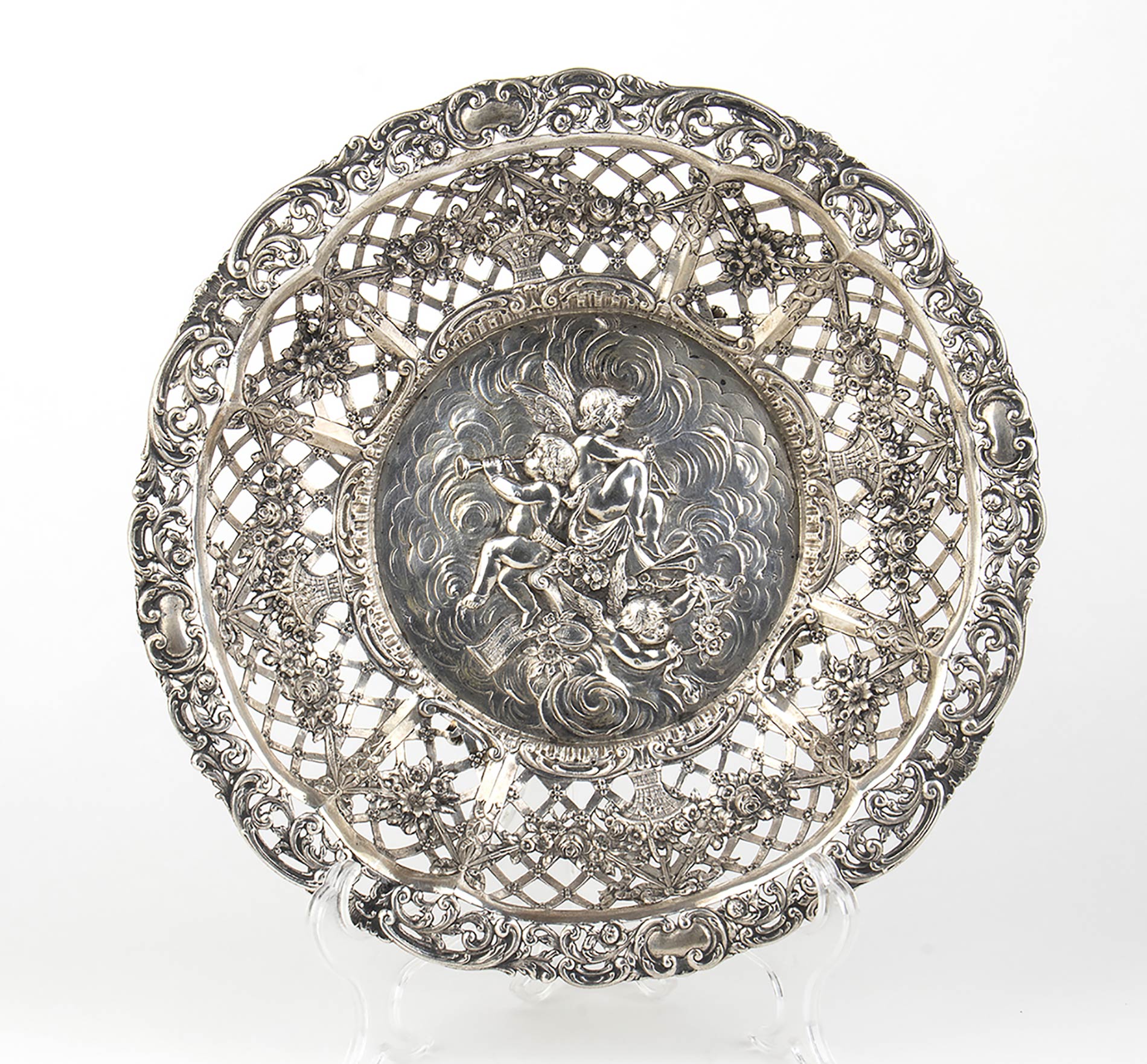 di forma rotonda traforata, con decorazioni a festoni fiorati e tre Putti nella parte centrale. Punzonato con pseudo marchi di Hanau in uso nella fine del XIX secolo. Diametro 28,5 cm, altezza 6 cm. Peso 274 gr. Stato di conservazione: **** buono.