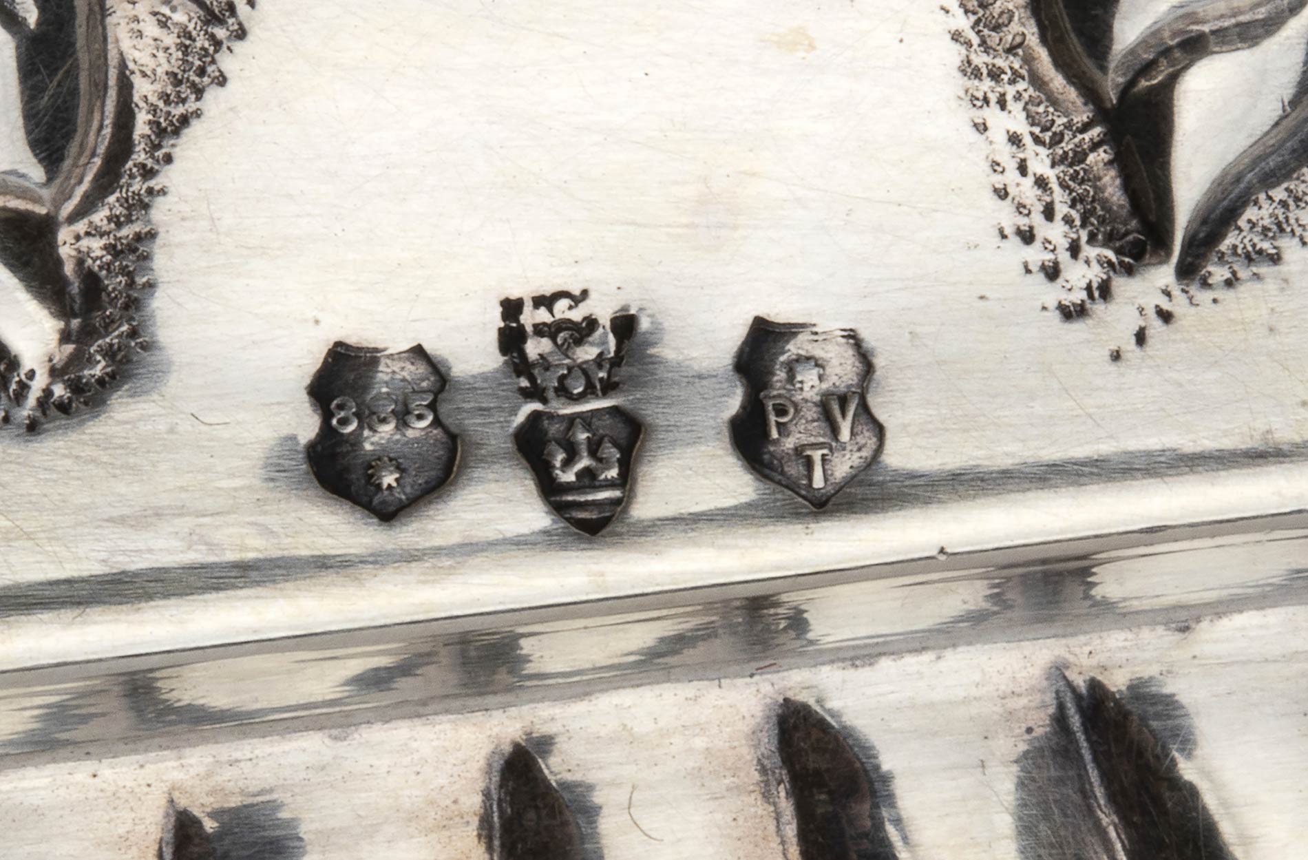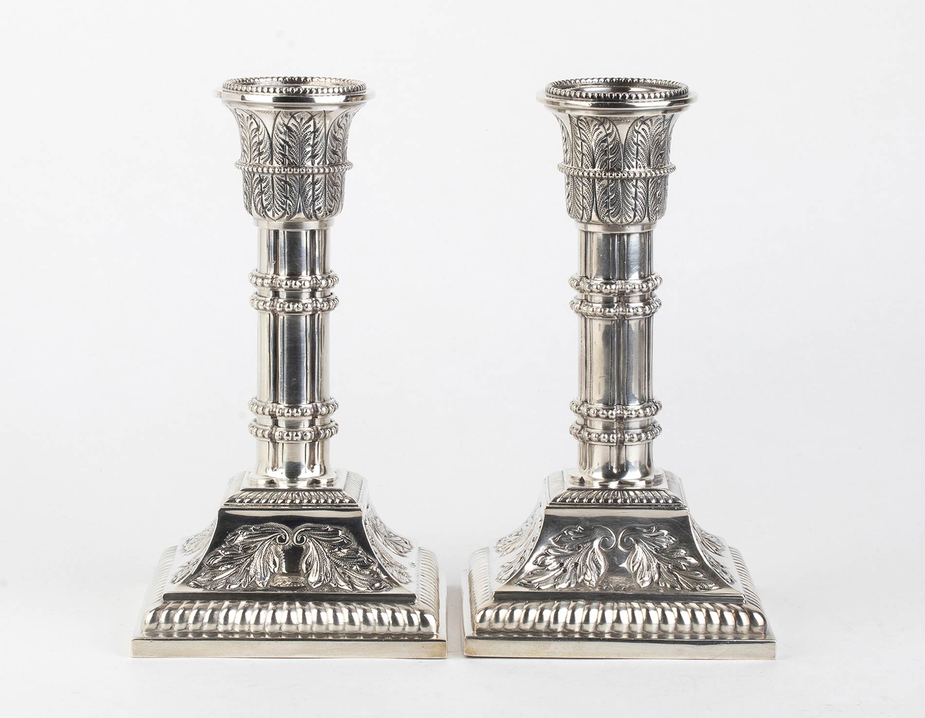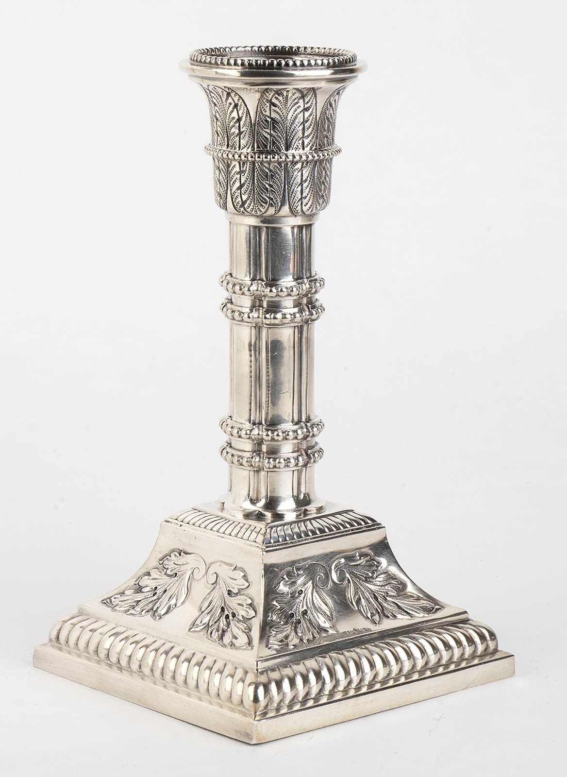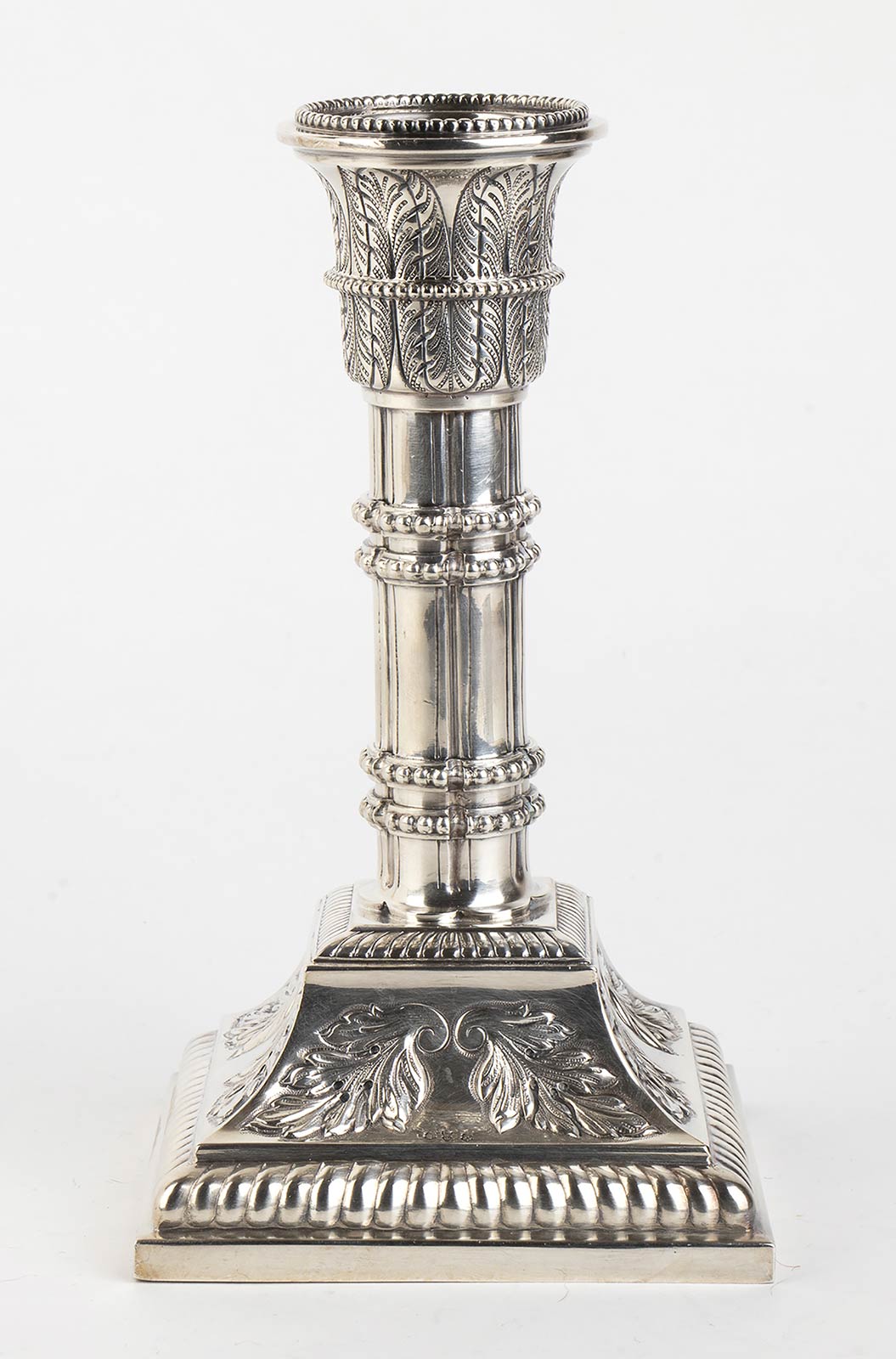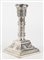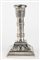con basi quadrate gradinate, i capitelli delle colonne decorati a palmete e il portacandela perlinato. Punzonati 835. Base 10,5 cm, altezza 19 cm. Peso 665 gr. Stato di conservazione: **** buono.