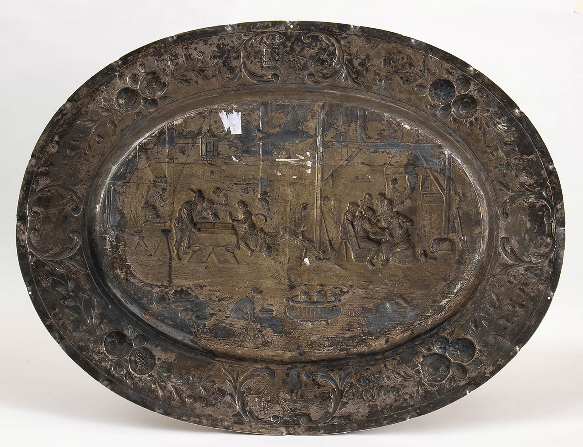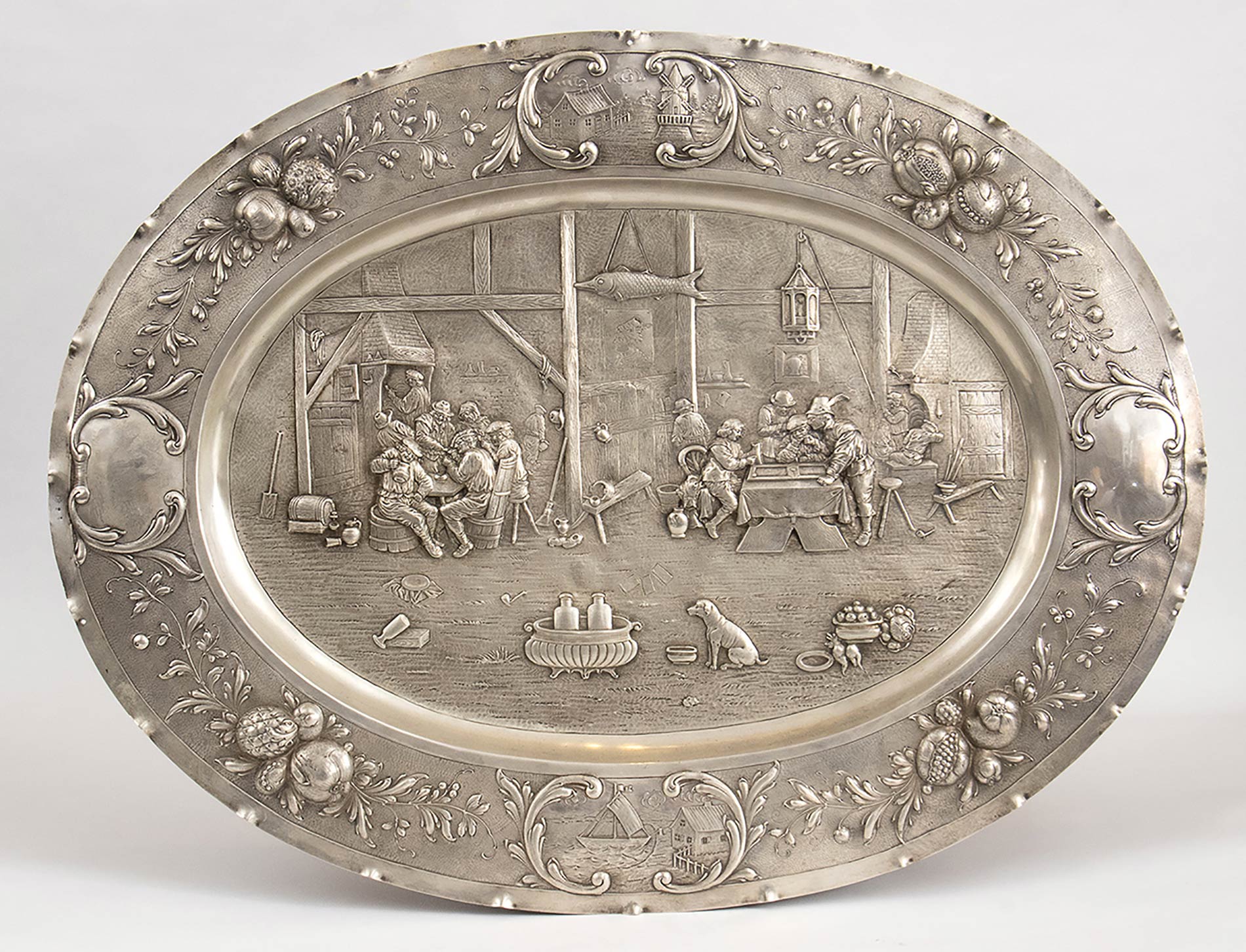 di forma ovale in argento 800/1000 decorato con scene di taverna. Serie completa di marchi Germania post 1888, argentiere Simon Rosenau operante a Bad Kissingen dal 1862 al 1932 circa. Dimensioni 67 x 51,3 cm. Peso 2118 gr. Stato di conservazione: **** buono.