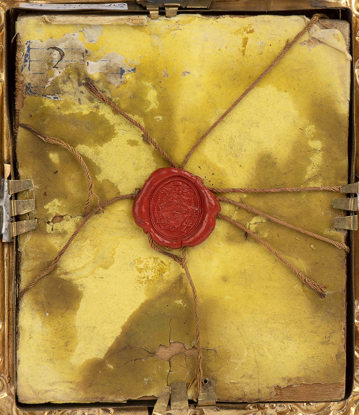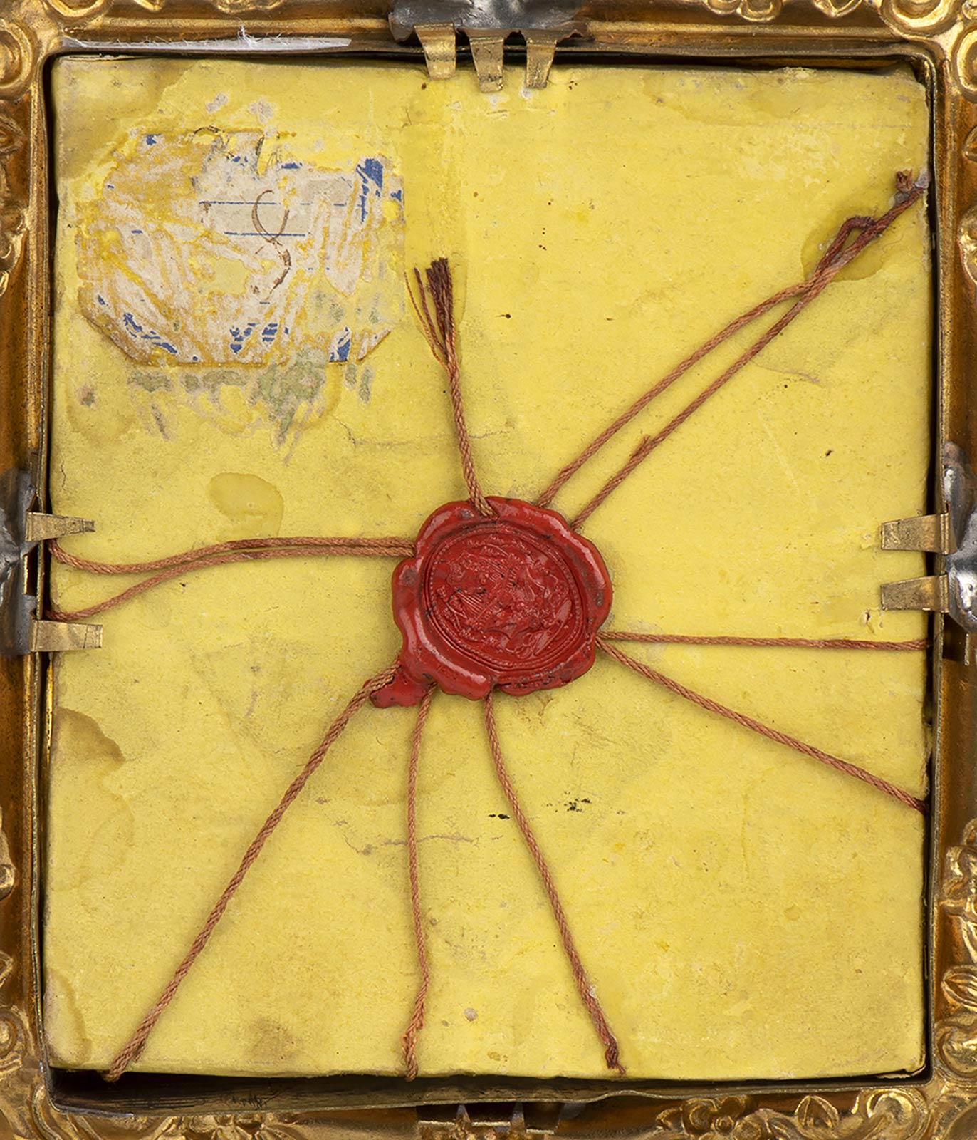 entro cornici in metallo dorato e sbalzato. Al verso sigillo in cera lacca dello Stato Ponificio. Dimensioni 16 x 14 cm. Pesi 103/100 gr. Stato di conservazione: **** buono.