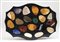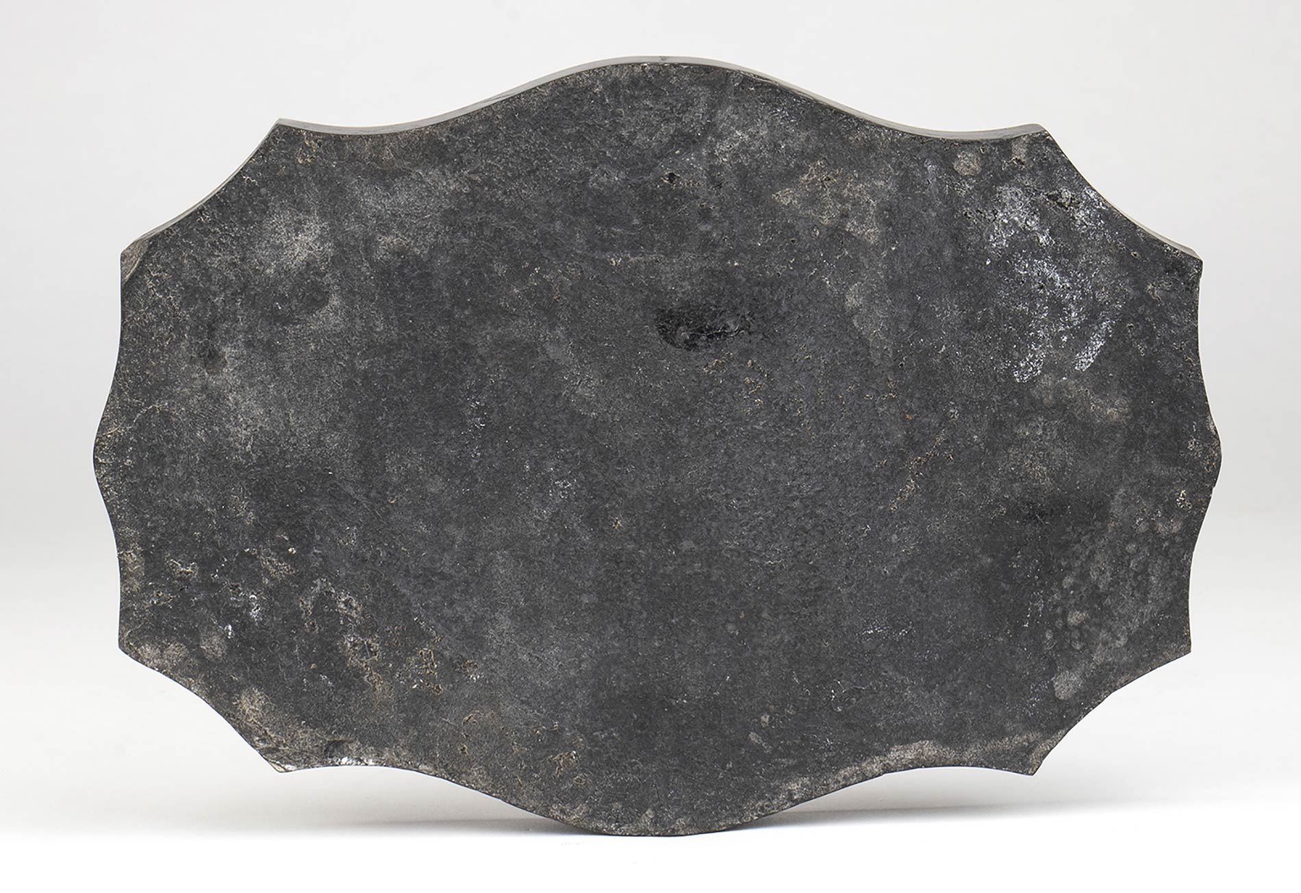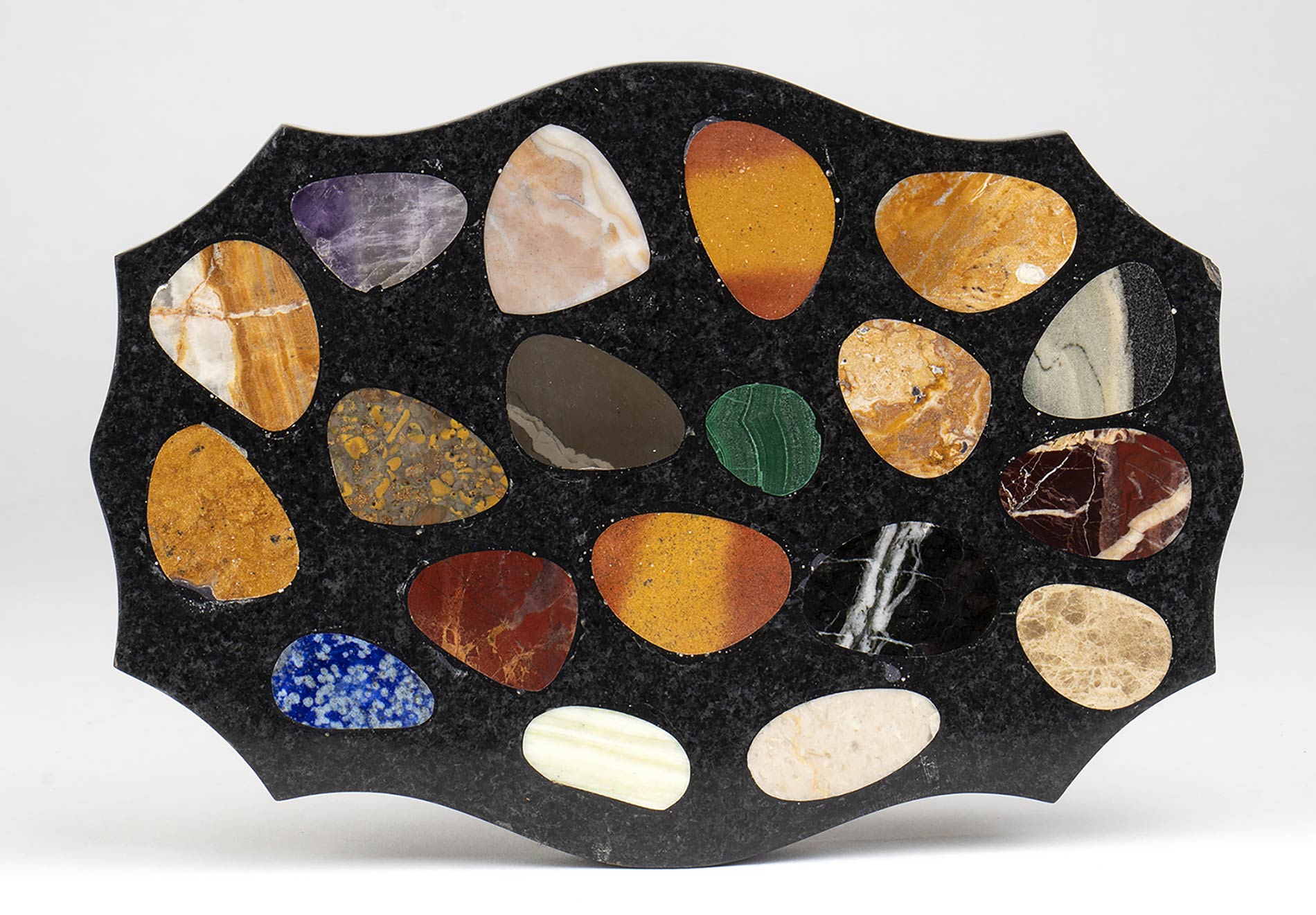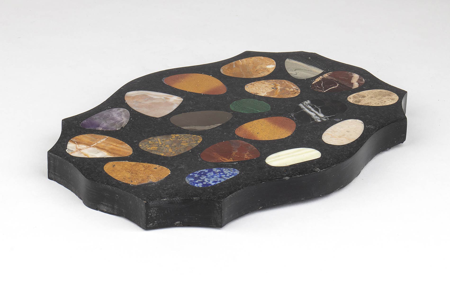 in marmo nero di forma sagomata con campionatura di marmi. Dimensioni 19,8 x 13,9 cm, altezza 1,5 cm. Peso 864 gr. Stato di conservazione: **** buono (piccola sbeccatura).