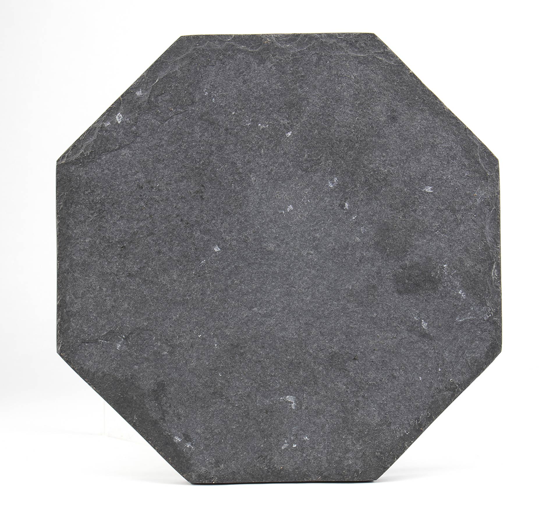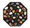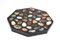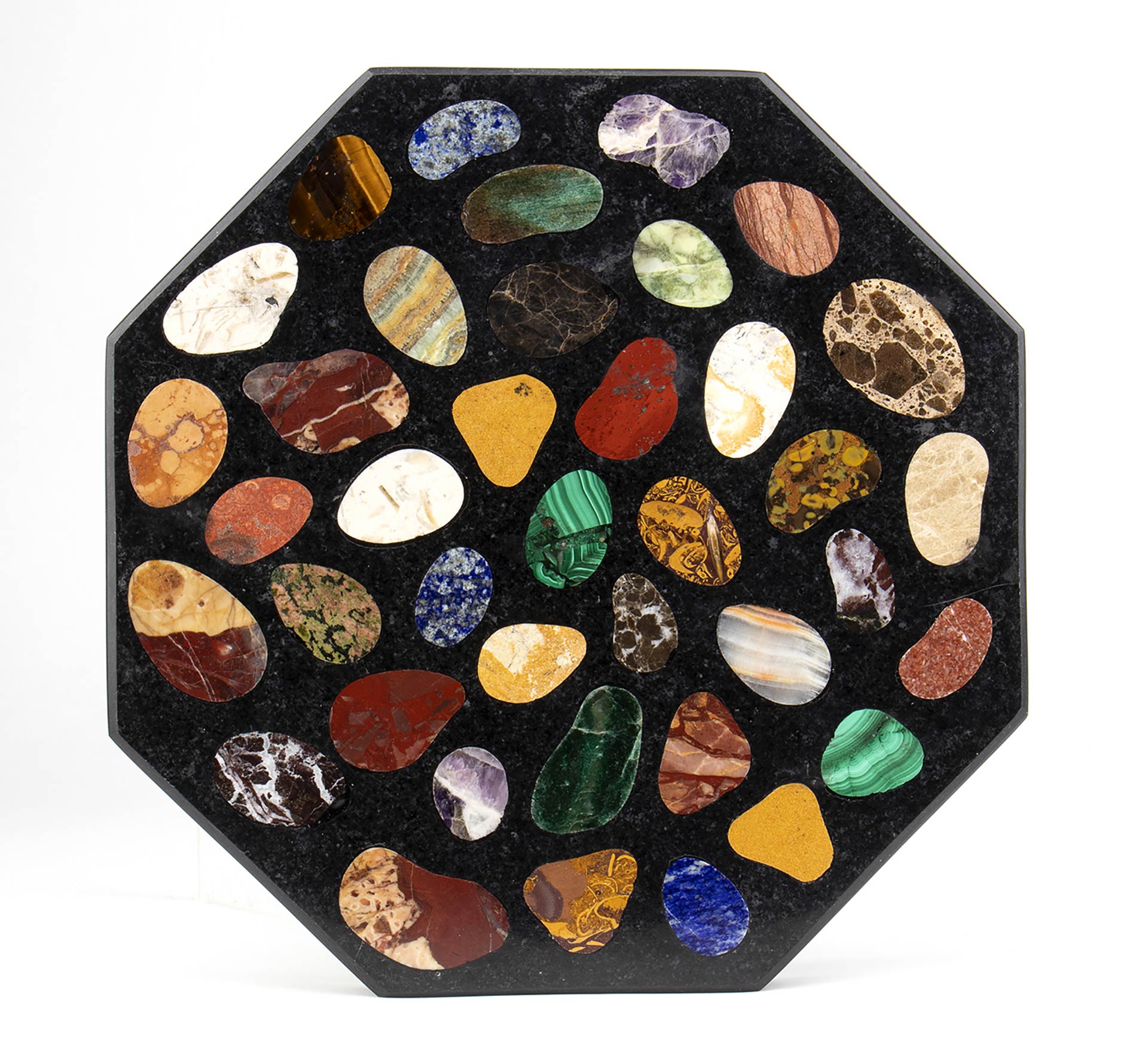in marmo nero di forma ottagonale con campionatura di marmi. Diametro 25,7 , altezza 2 cm. Peso 2920 gr. Stato di conservazione: **** buono.