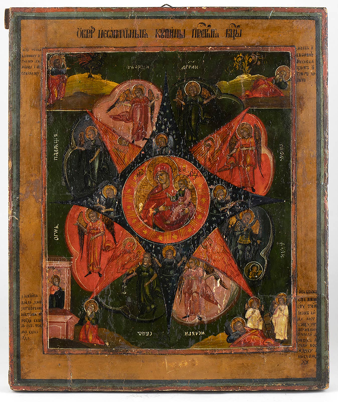 tempera su tavola, raffigurante "Vergine del roveto ardente" (Neopalimaya Kupina). Dimensioni 35,5 x 29,5 x 3,2 cm. Stato di conservazione: **** buono (difetti).