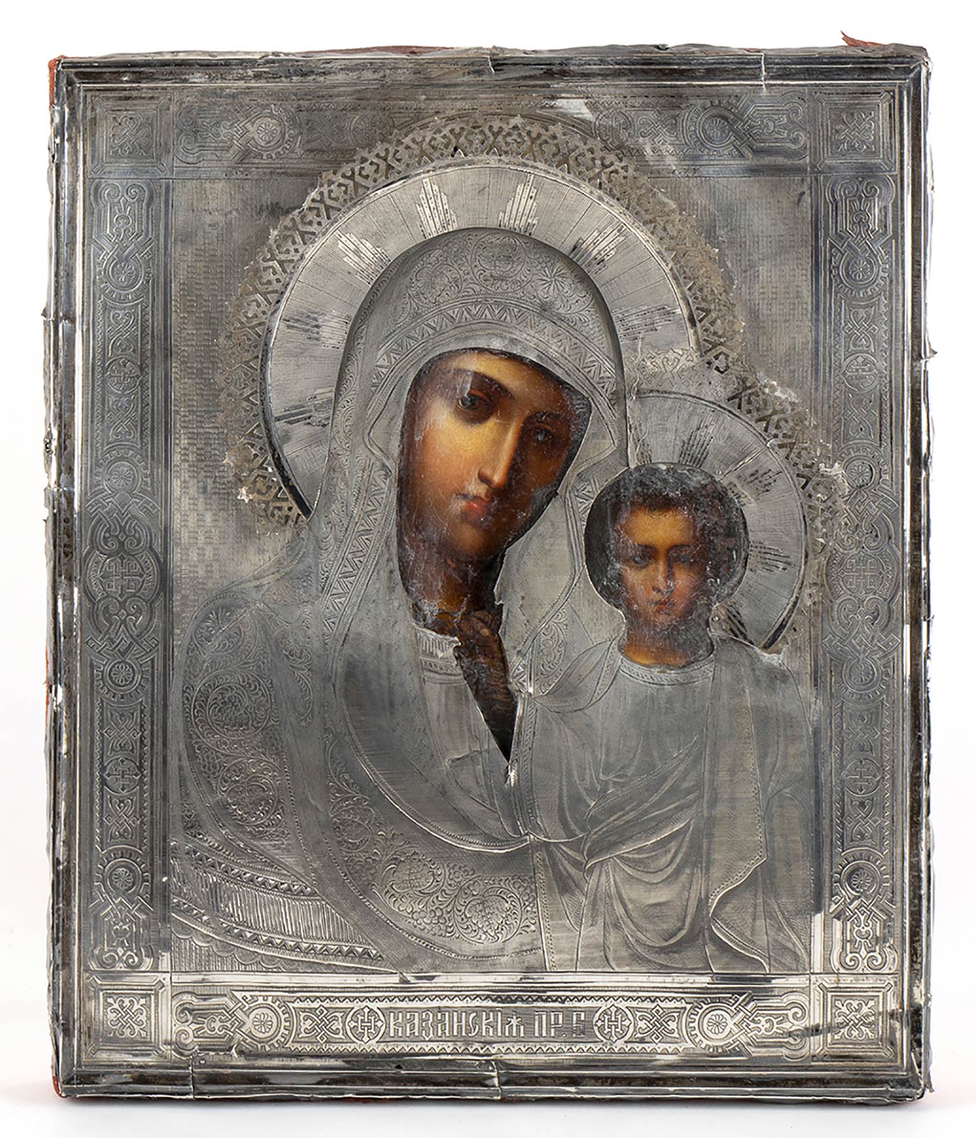 Icona russa con riza in argento raffigurante Madonna con bambino - Mosca 1890