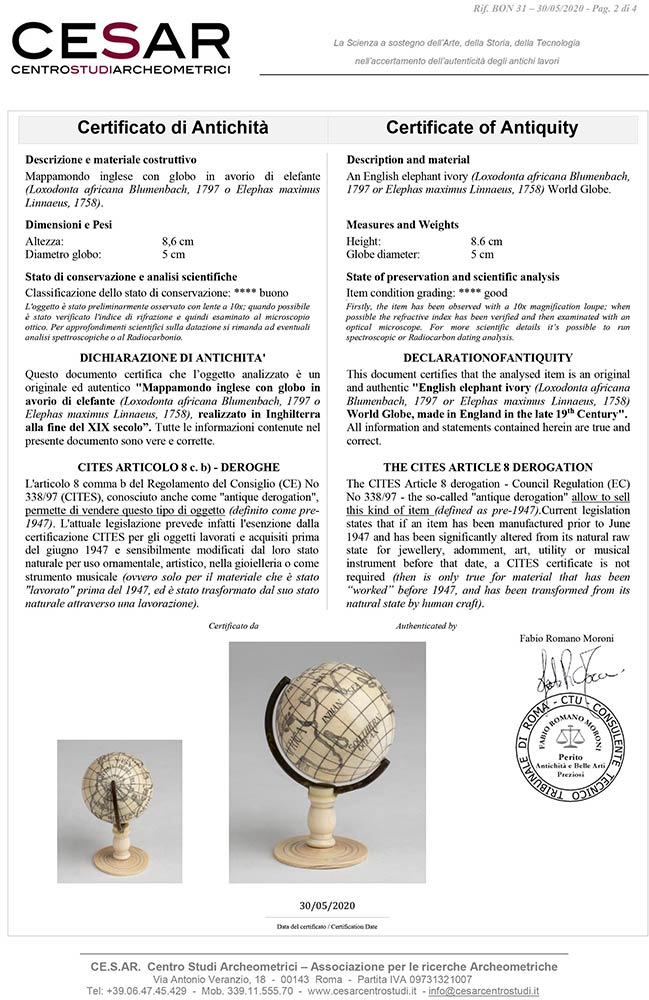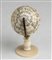 in avorio di elefante (Loxodonta africana Blumenbach, 1797 o Elephas maximus Linnaeus, 1758) Diametro globo 5 cm, altezza 8,6 cm. Stato di conservazione: **** buono. Certificato di Antichità Ce.S.Ar. (pre-1947).