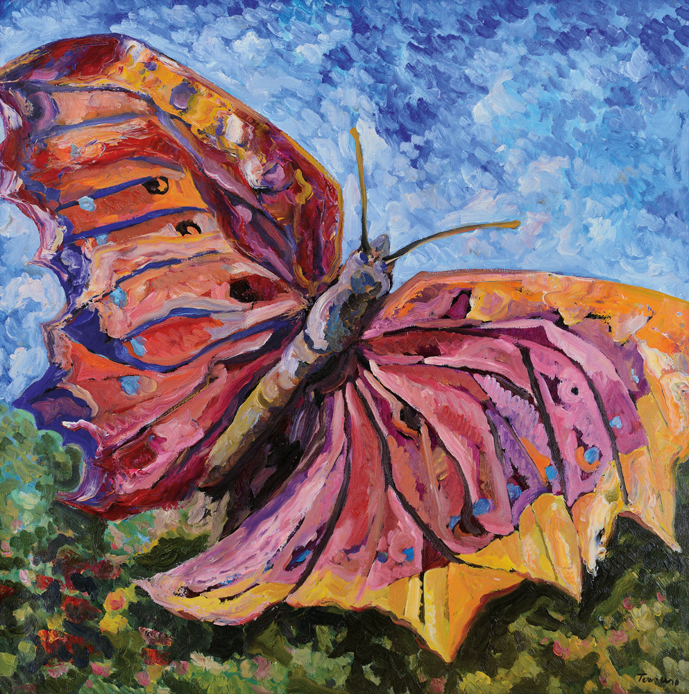 SAVERIO TERRUSO Monreale (Pa) 11/01/1939 - Milano 03/03/2003 Farfalla olio su tela cm. 100x100, firma in basso a destra, titolo e firma al retro, dichiarazione d'autenticità e archivio dell'artista su foto.
