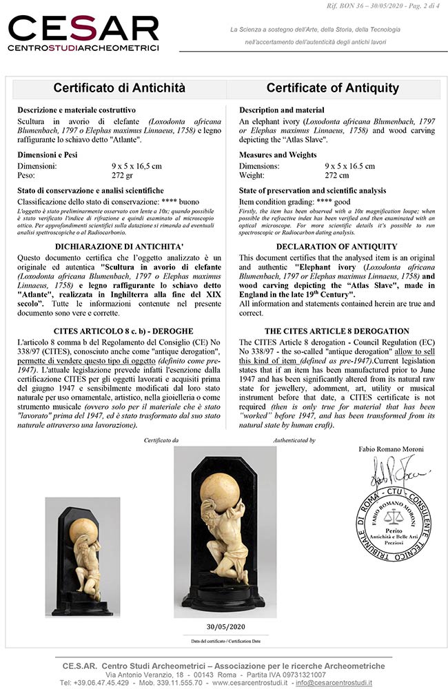 in avorio di elefante (Loxodonta africana Blumenbach, 1797 o Elephas maximus Linnaeus, 1758) raffigurante lo schiavo detto "Atlante". Altezza 16,5 cm, larghezza 9 cm, profondita 5 cm. Peso totale 272 gr. Stato di conservazione: **** buono. Certificato di Antichità Ce.S.Ar. (pre-1947).