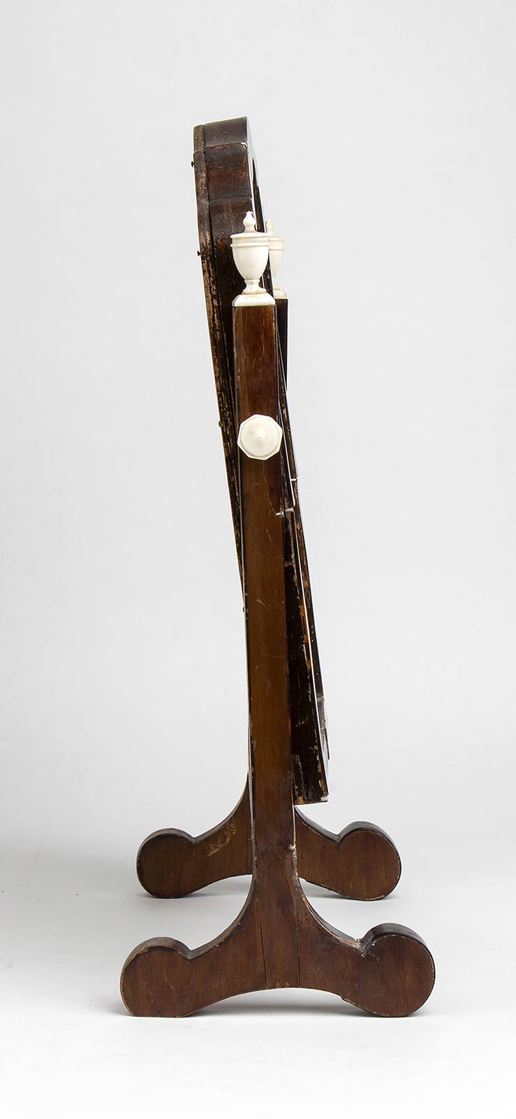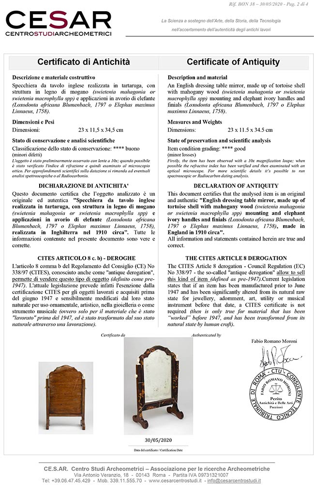 realizzata in tartaruga, con struttura in legno di mogano (swietenia mahagonia or swietenia macrophylla spp) e applicazioni in avorio di elefante (Loxodonta africana Blumenbach, 1797 o Elephas maximus Linnaeus, 1758.) Dimensioni 23 x 11,5 cm, altezza 34,5 cm. Stato di conservazione: **** buono (minori difetti). Certificato di Antichità Ce.S.Ar. (pre-1947).