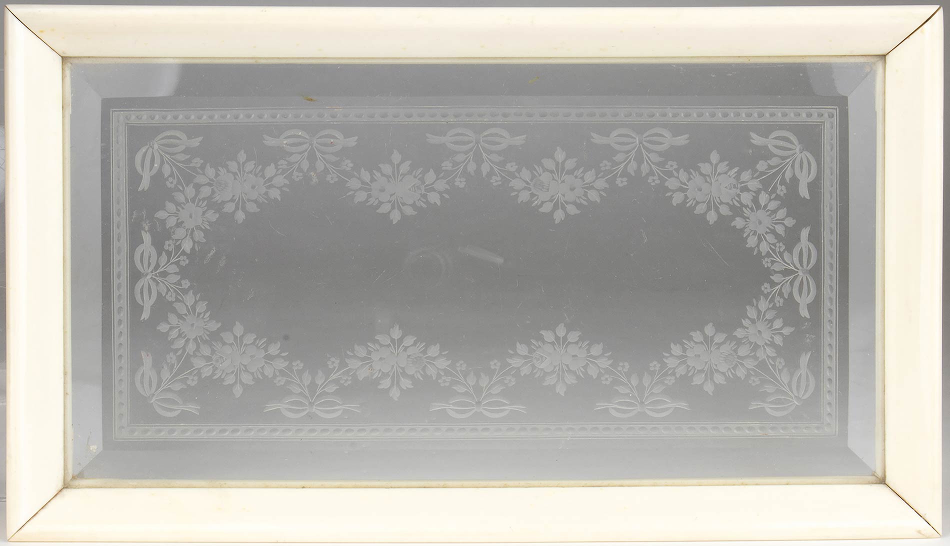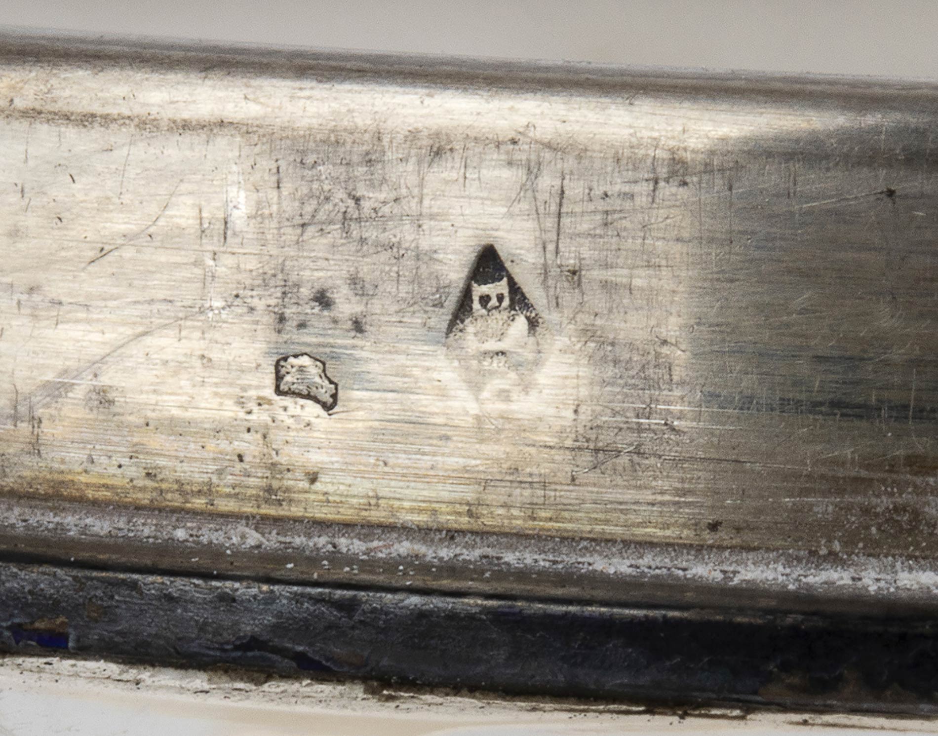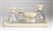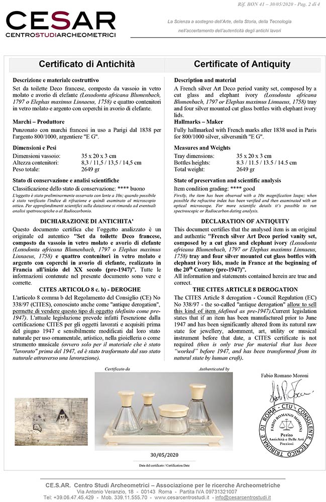 composto da vassoio in vetro molato e avorio di elefante (Loxodonta africana Blumenbach, 1797 o Elephas maximus Linnaeus, 1758) e quattro contenitori in vetro molato e argento con coperchi in avorio di elefante. Punzonato con marchi francesi post 1838 per l'argento 800/1000, argentiere "E G". Vassoio 35 x 20 x 3 cm, altezza contenitori 8,3 / 11,5 / 13,5 / 14,5 cm. Peso totale 2649 gr. Stato di conservazione: **** buono. Certificato di Antichità Ce.S.Ar. (pre-1947).