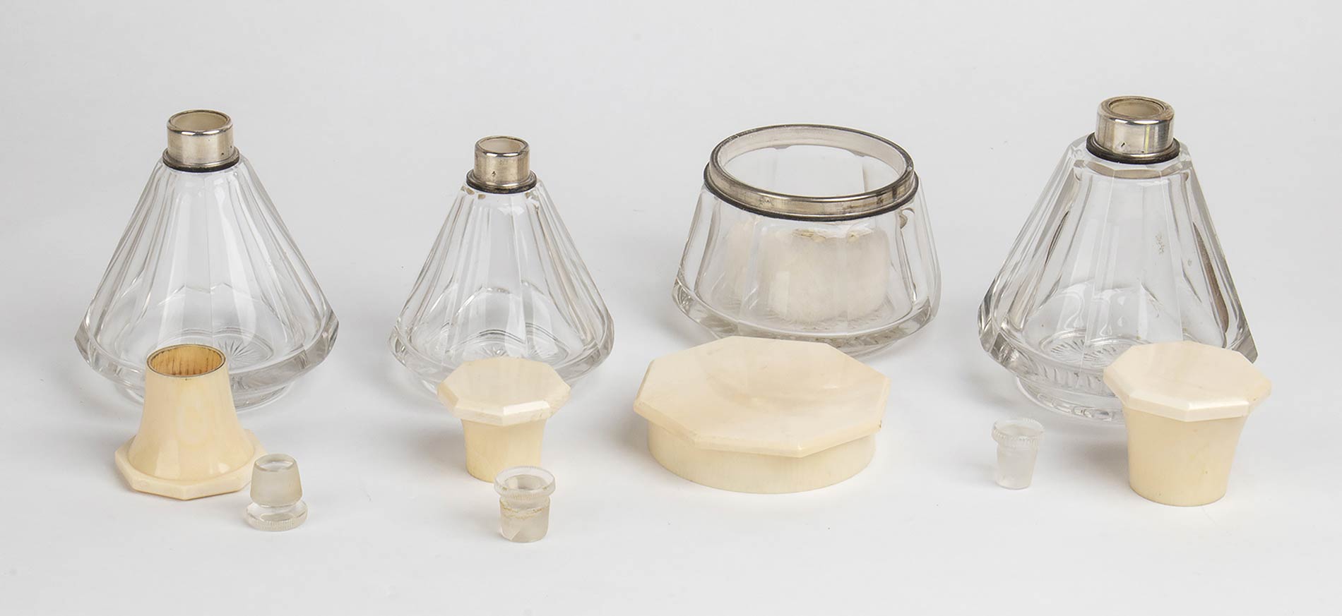 Set da toilette francese in vetro molato, avorio e argento - periodo Deco, inizio XX secolo
