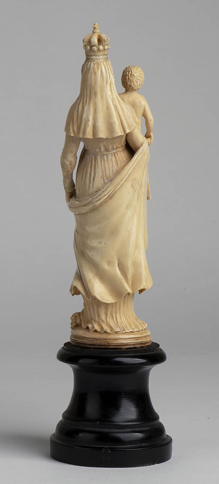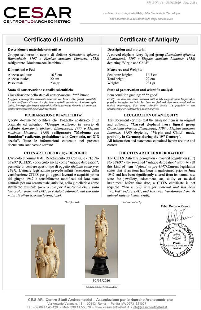 gruppo scultoreo in avorio di elefante (Loxodonta africana Blumenbach, 1797 o Elephas maximus Linnaeus, 1758) raffigurante "Madonna con Bambino". Altezza scultura 16,3 cm, con base 22 cm. Peso totale 234 gr. Stato di conservazione: **** buono. Certificato di Antichità Ce.S.Ar. (pre-1947).