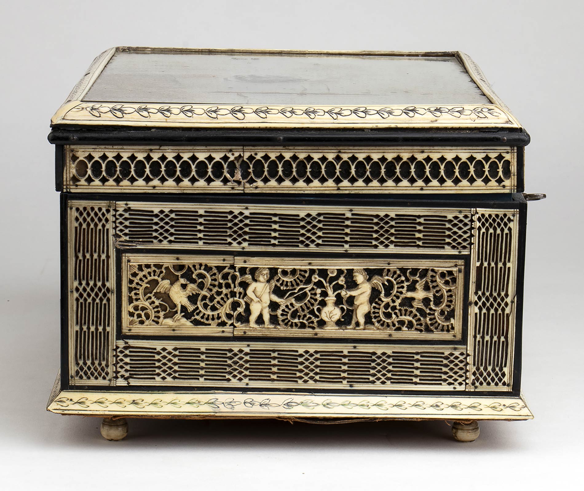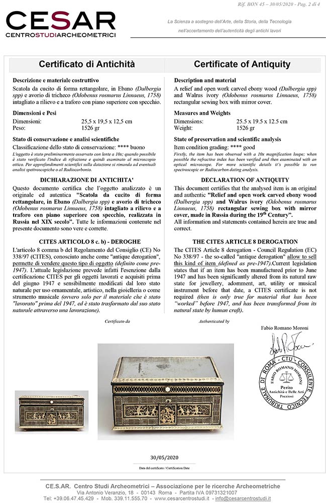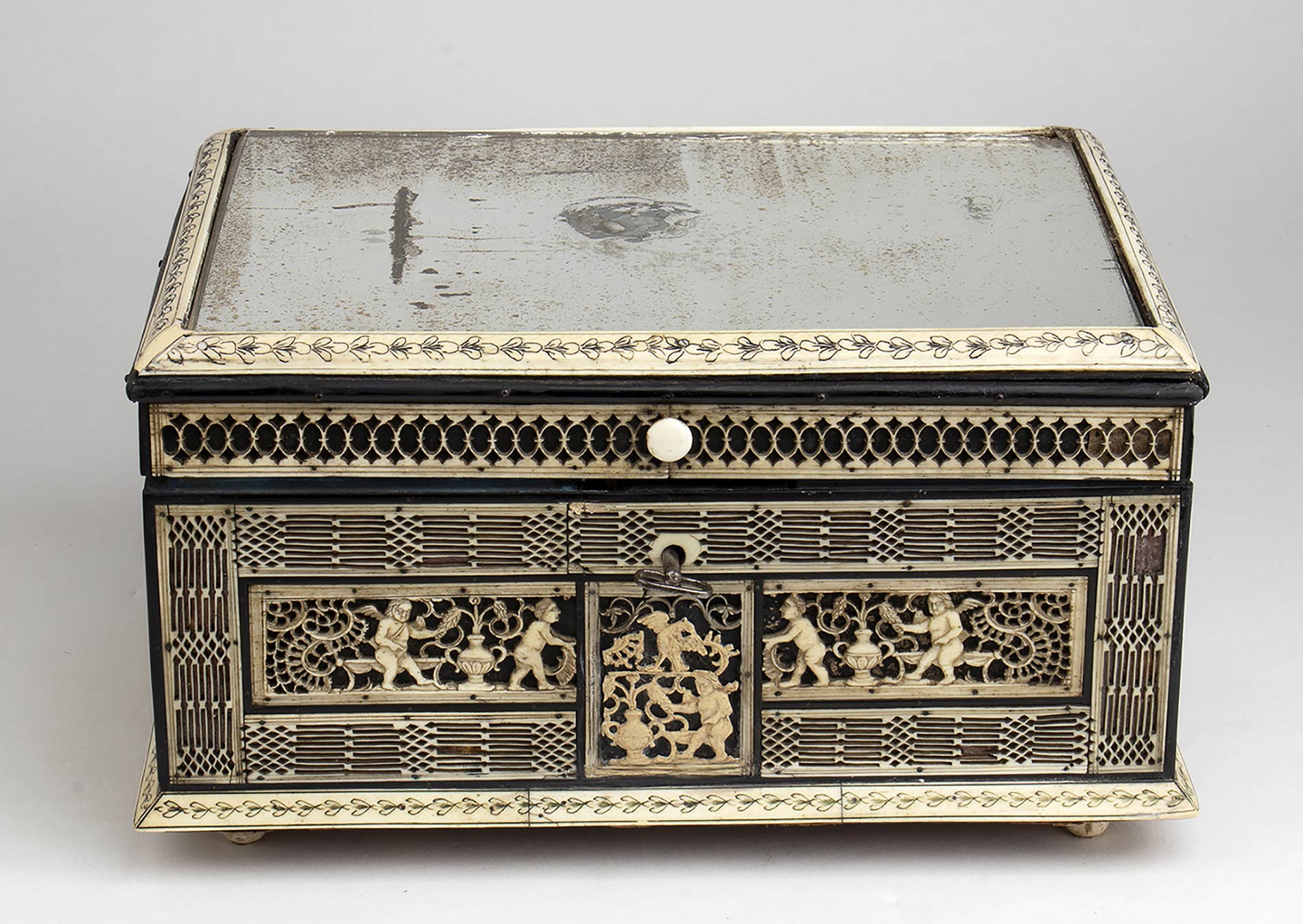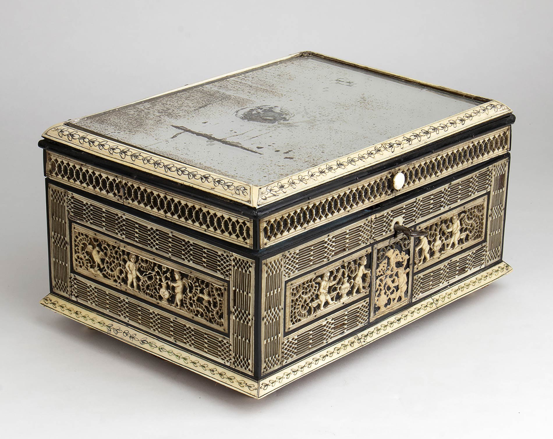 di forma rettangolare, in Ebano (Dalbergia spp) e avorio di tricheco (Odobenus rosmarus Linnaeus, 1758) intagliato a rilievo e a traforo. Piano superiore con specchio. Altezza 12,5 cm, base 25,5 x 19,5 cm. Peso 1526 gr. Stato di conservazione: **** buono. Certificato di Antichità Ce.S.Ar. (pre-1947)
