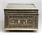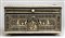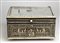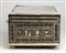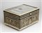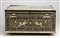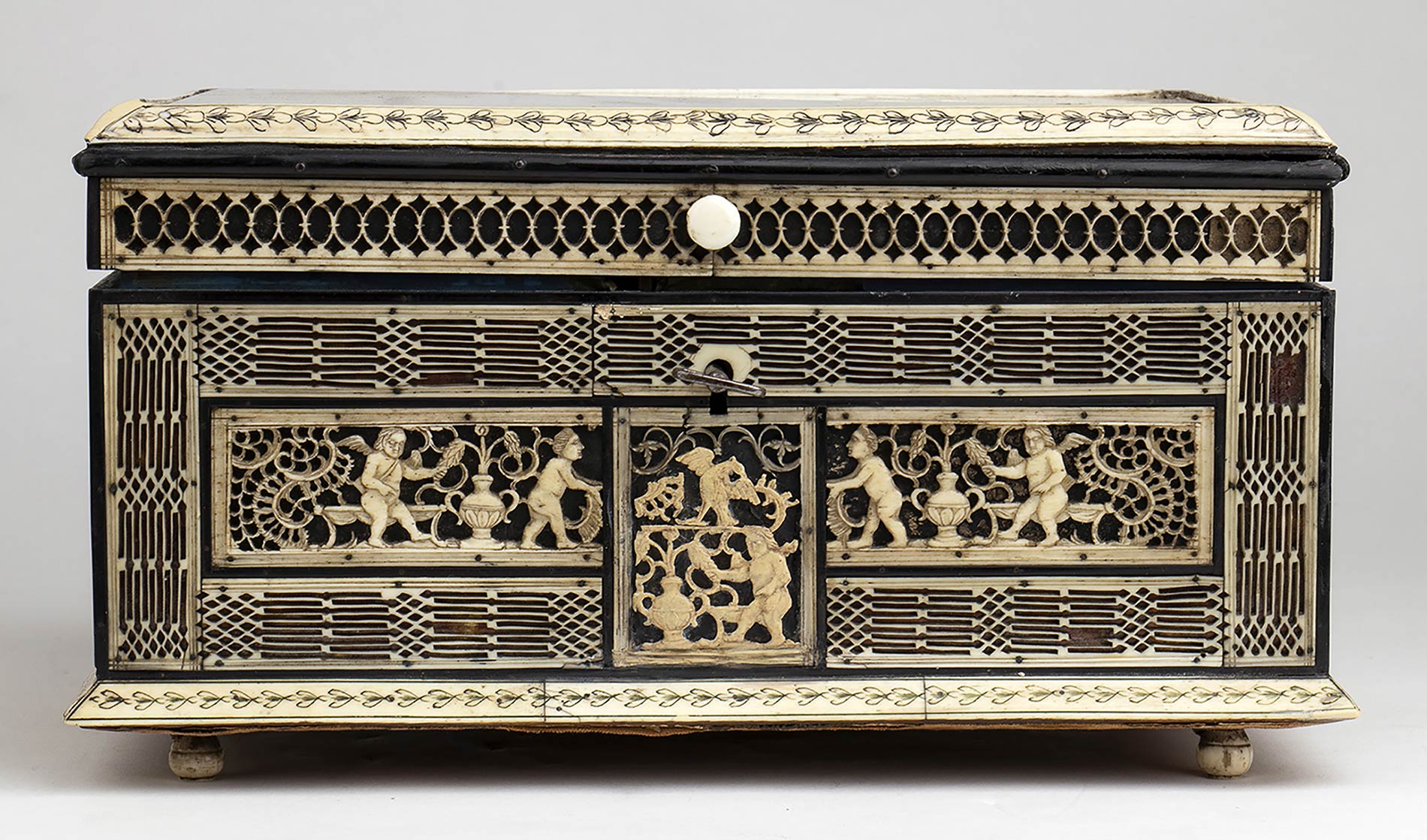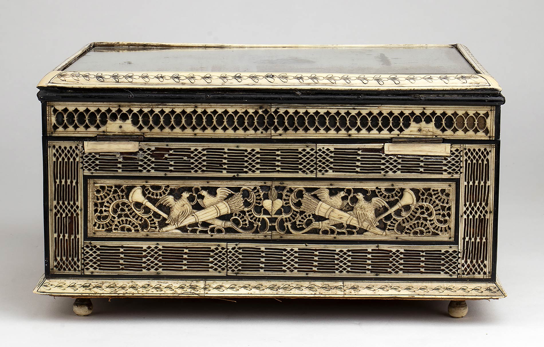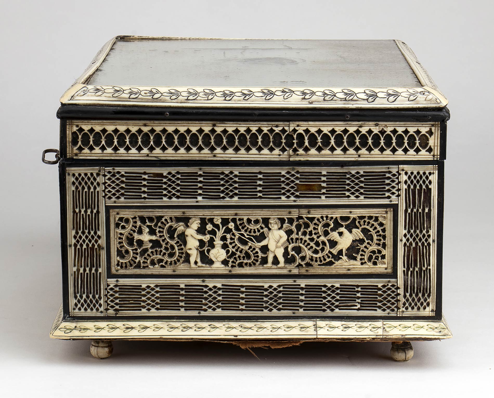 di forma rettangolare, in Ebano (Dalbergia spp) e avorio di tricheco (Odobenus rosmarus Linnaeus, 1758) intagliato a rilievo e a traforo. Piano superiore con specchio. Altezza 12,5 cm, base 25,5 x 19,5 cm. Peso 1526 gr. Stato di conservazione: **** buono. Certificato di Antichità Ce.S.Ar. (pre-1947)