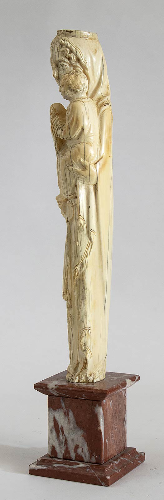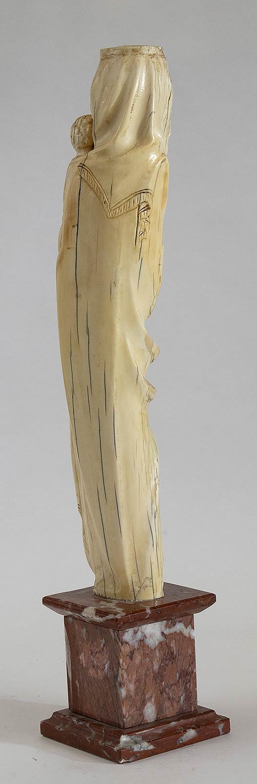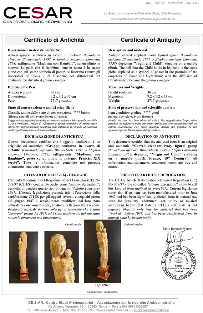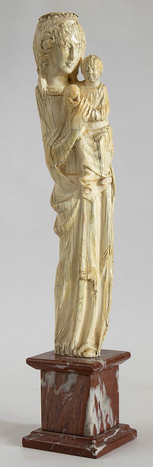 in avorio di elefante (Loxodonta africana Blumenbach, 1797 o Elephas maximus Linnaeus, 1758) raffigurante "Madonna con Bambino", posta su un plinto in marmo. La palla che il Bambino tiene in mano è lo stesso globo con cui, come simbolo di potere, si facevano ritrarre gli imperatori di Roma e di Bisanzio; col diffondersi del cristianesimo diventò il globus cruciger. Dimensioni 9,2 x 9,2 x 45 cm, altezza scultura 36 cm. Peso 2717 gr (con base). Stato di conservazione: **** buono. Certificato di Antichità Ce.S.Ar. (pre-1947).