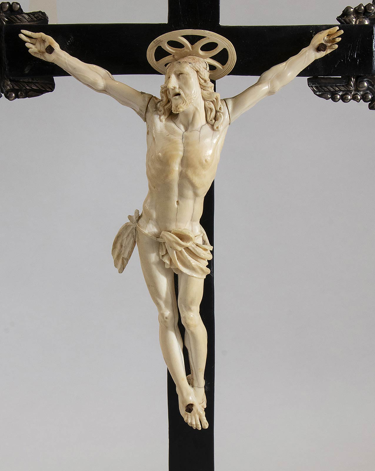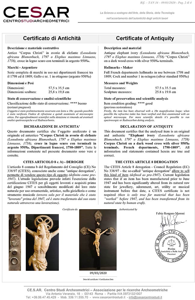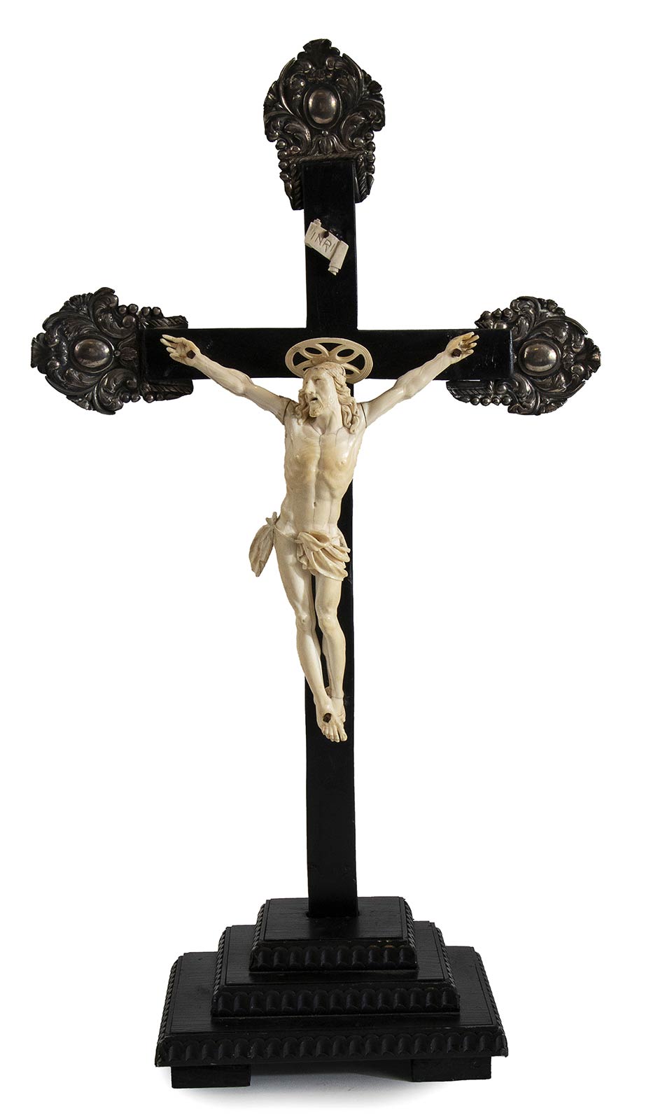 “Corpus Christi” in avorio di elefante scolpito (Loxodonta africana Blumenbach, 1797 o Elephas maximus Linnaeus, 1758) con croce in legno scuro con terminali in argento 950/1000. Serie completa di marchi in uso nei dipartimenti francesi tra il 1798 ed il 1809; Gallo e nr. 1 in ottagono per l'argento 950/1000. Dimensioni 57,5 x 35,5 cm, scultura 25,8 x 19,8 cm. Stato di conservazione: **** buono. Certificato di Antichità Ce.S.Ar. (pre-1947).