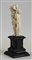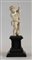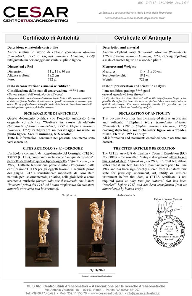 in avorio di elefante (Loxodonta africana Blumenbach, 1797 o Elephas maximus Linnaeus, 1758) raffigurante un personaggio maschile su plinto ligneo. Dimensioni 11 x 11 x 30 cm, altezza scultura 18,2 cm. Peso 722 gr. Stato di conservazione: **** buono. Certificato di Antichità Ce.S.Ar. (pre-1947).