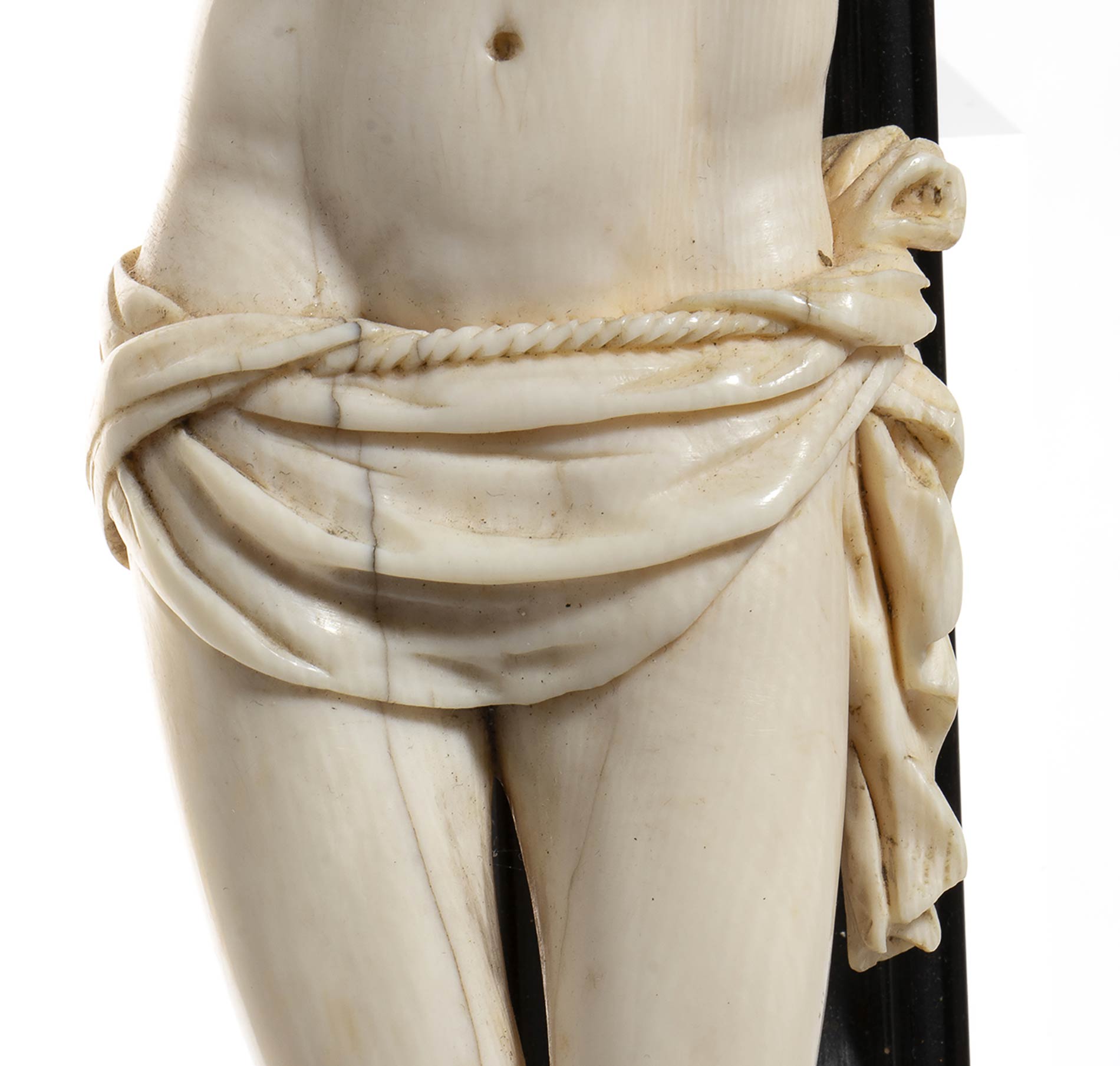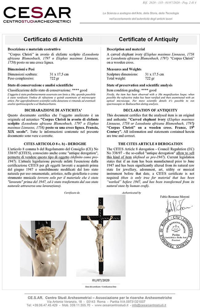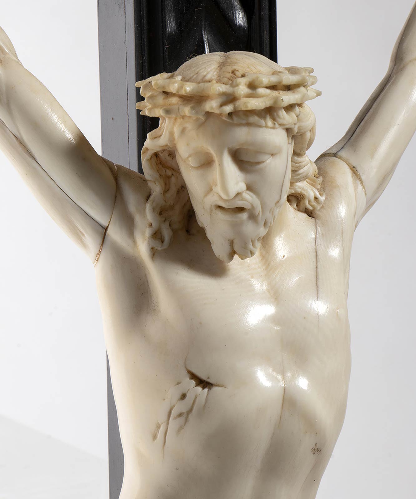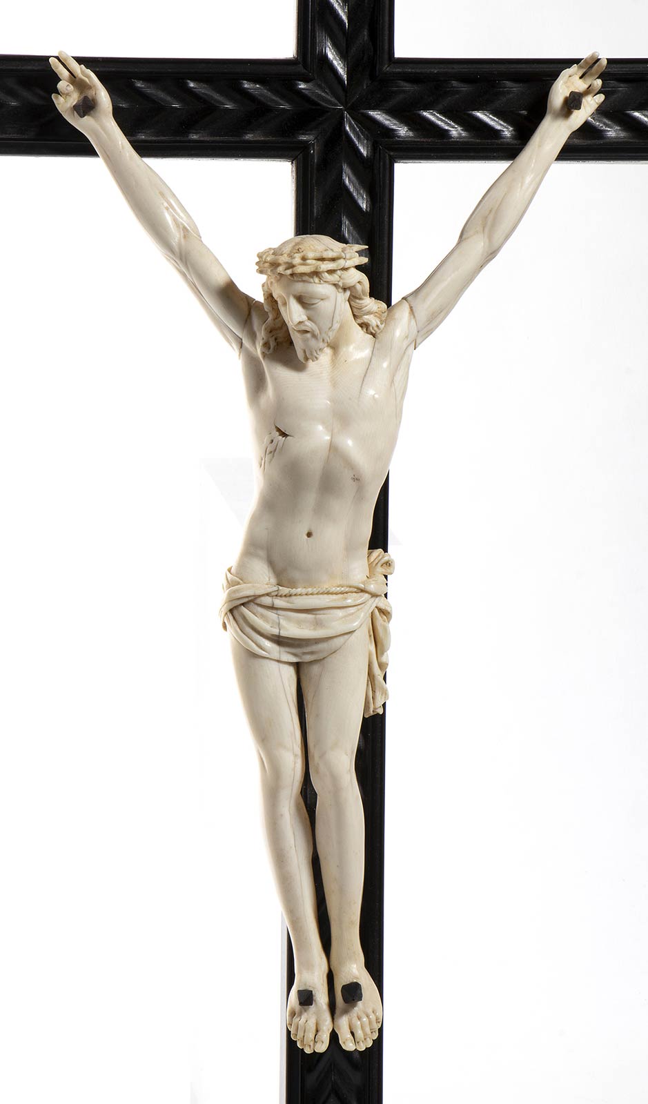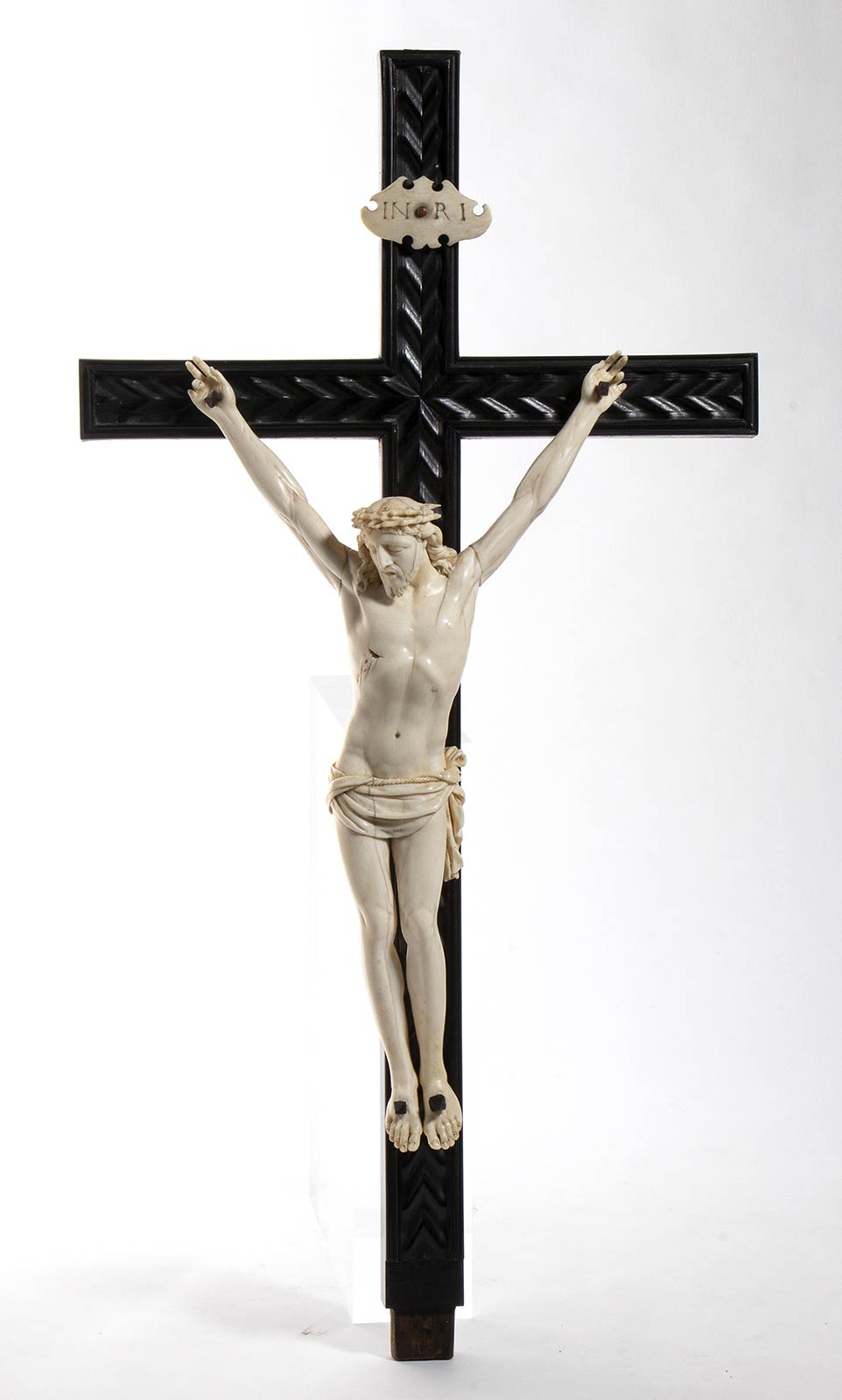 in avorio di elefante (Loxodonta africana Blumenbach, 1797 o Elephas maximus Linnaeus, 1758) con croce lignea. Dimensioni 31 x 17,5 cm. Peso totale 722 gr. Stato di conservazione: **** buono. Certificato di Antichità Ce.S.Ar. (pre-1947).