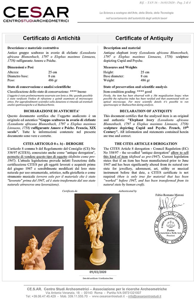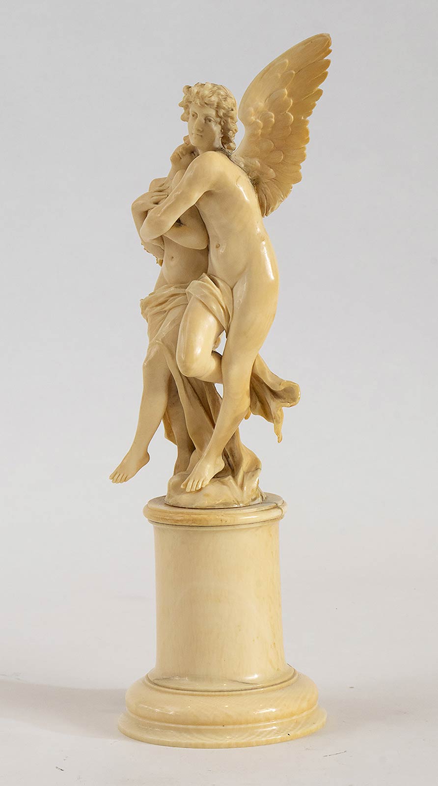 in avorio di elefante scolpito (Loxodonta africana Blumenbach, 1797 o Elephas maximus Linnaeus, 1758) raffigurante Amore e Psiche. Diametro base 8 cm, altezza 25 cm. Peso 486 gr. Stato di conservazione: **** buono. Certificato di Antichità Ce.S.Ar. (pre-1947).