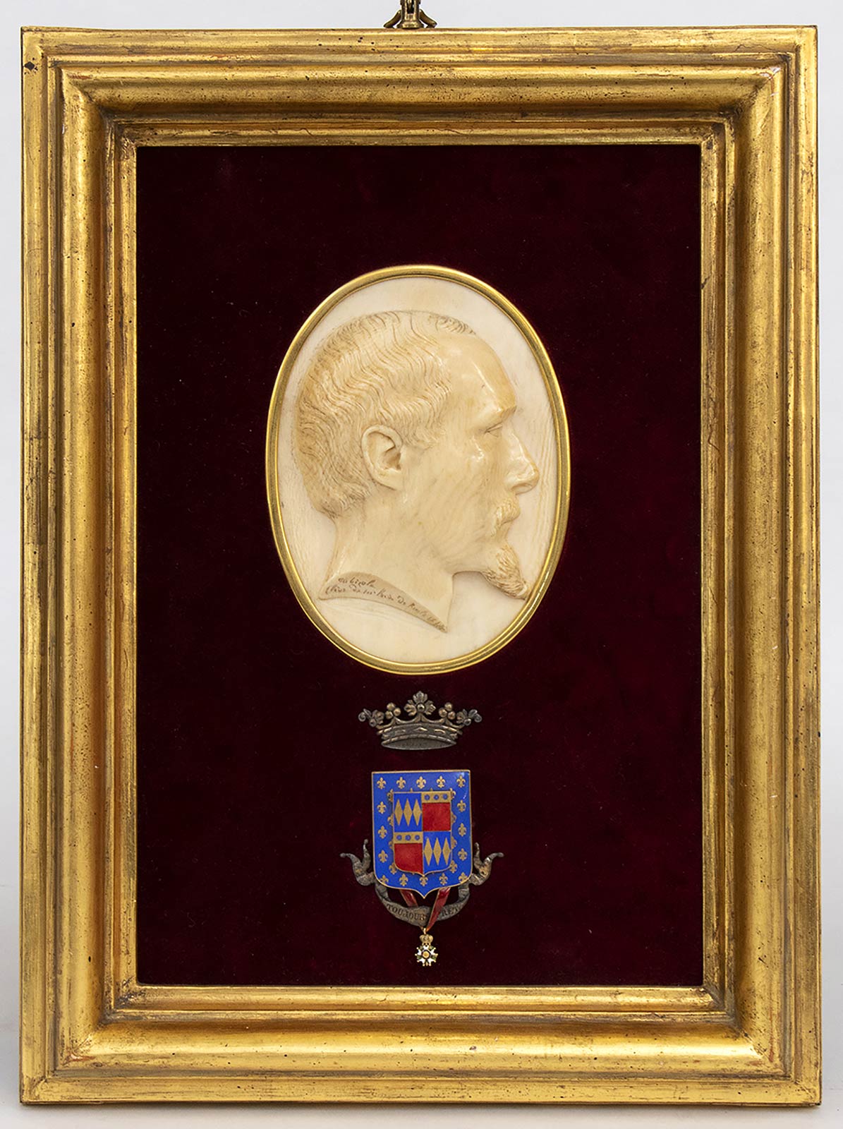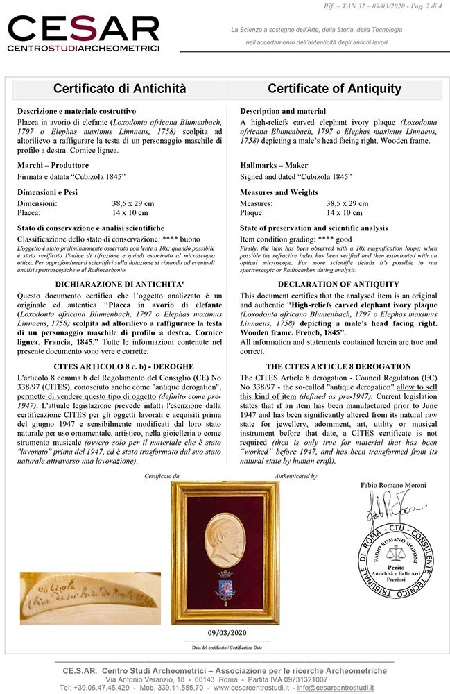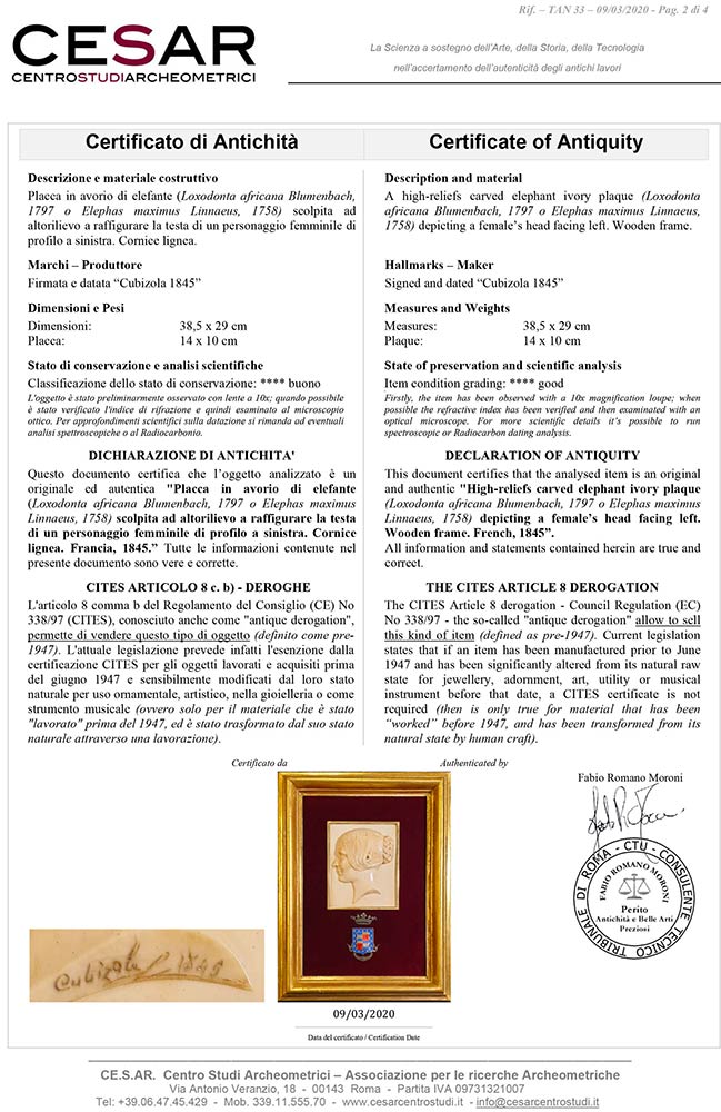 in avorio di elefante (Loxodonta africana Blumenbach, 1797 o Elephas maximus Linnaeus, 1758) scolpite ad altorilievo a raffigurare la testa di un personaggio maschile di profilo a destra e la testa di un personaggio femminile di profilo a sinistra. Cornici lignee. Dimensioni 38,5 x 29 cm, placche in avorio 14 x 10 cm. Certificati di Antichità Ce.S.Ar. (pre-1947).