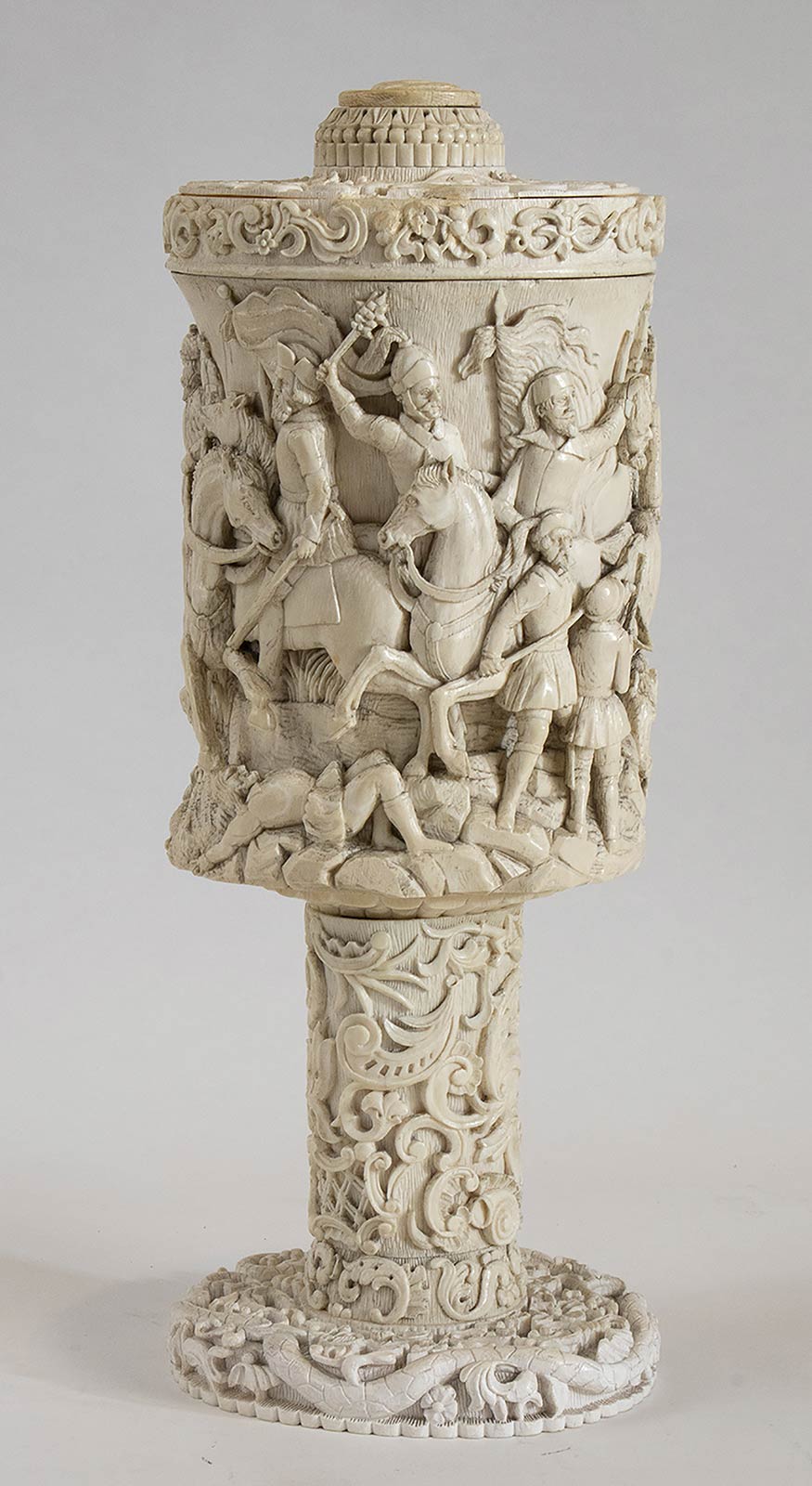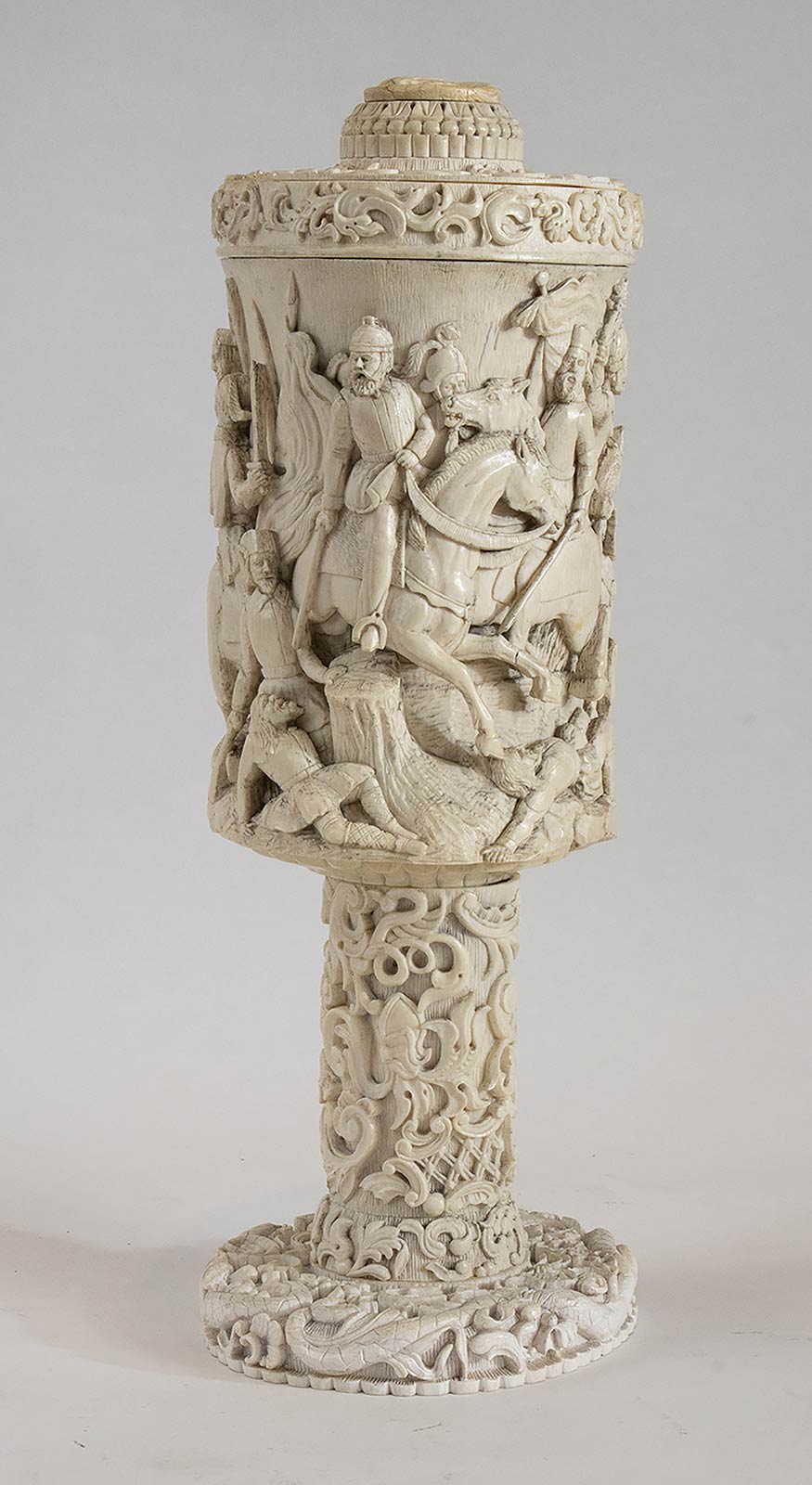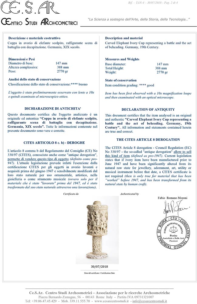in avorio di elefante scolpito (Loxodonta africana Blumenbach, 1797 o Elephas maximus Linnaeus, 1758), raffigurante scena di battaglia con decapitazione. Diametro di base 14,7 cm, altezza 38,8 cm. Peso 2770 gr. Stato di conservazione: **** buono. Certificato di Antichità Ce.S.Ar. (pre-1947).