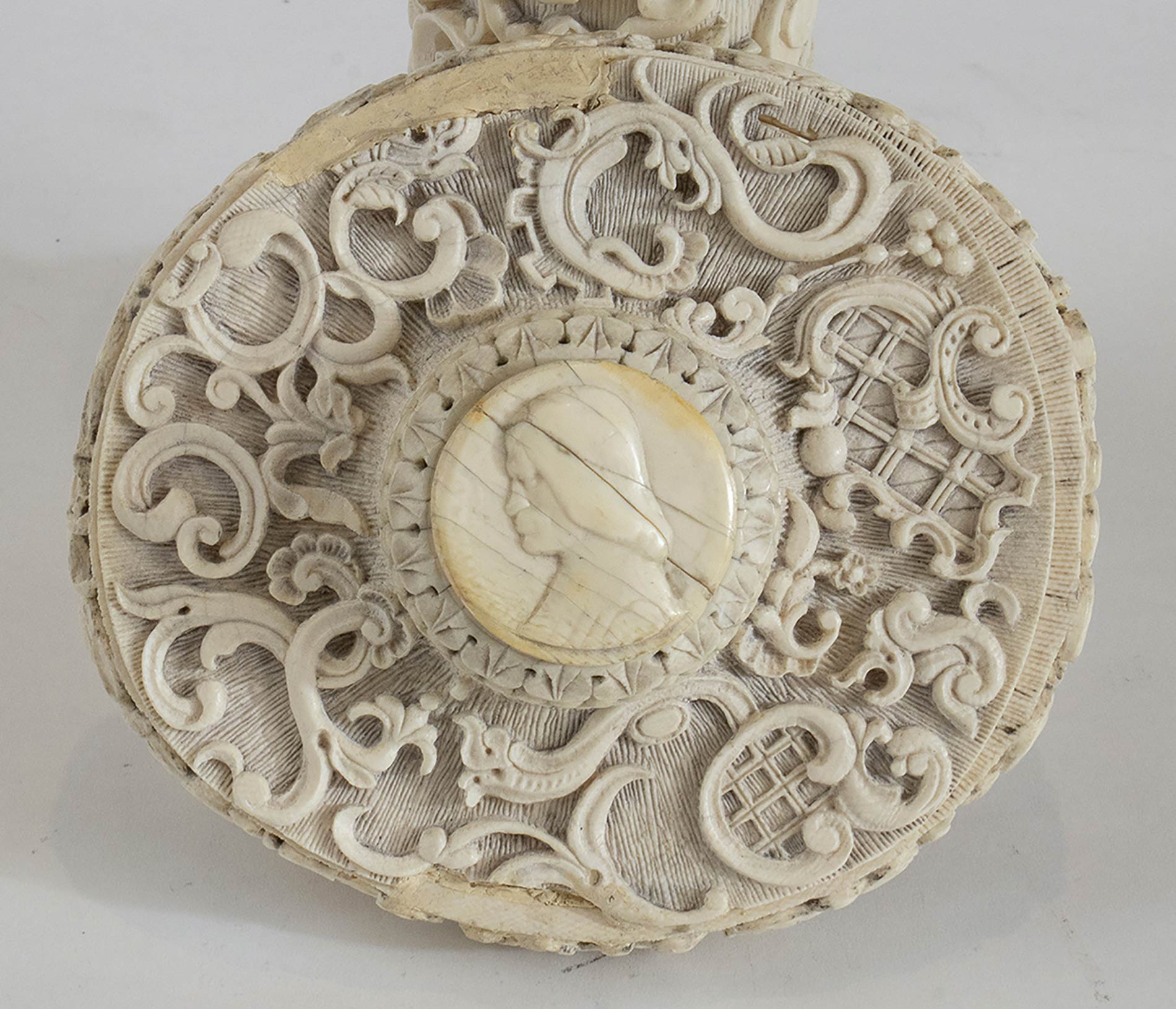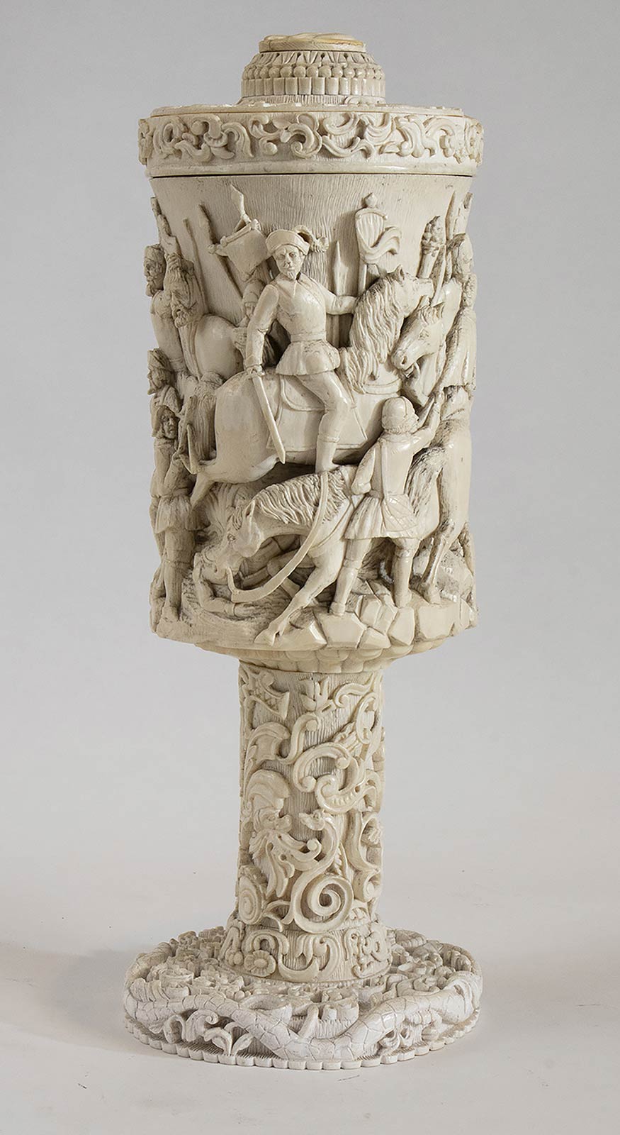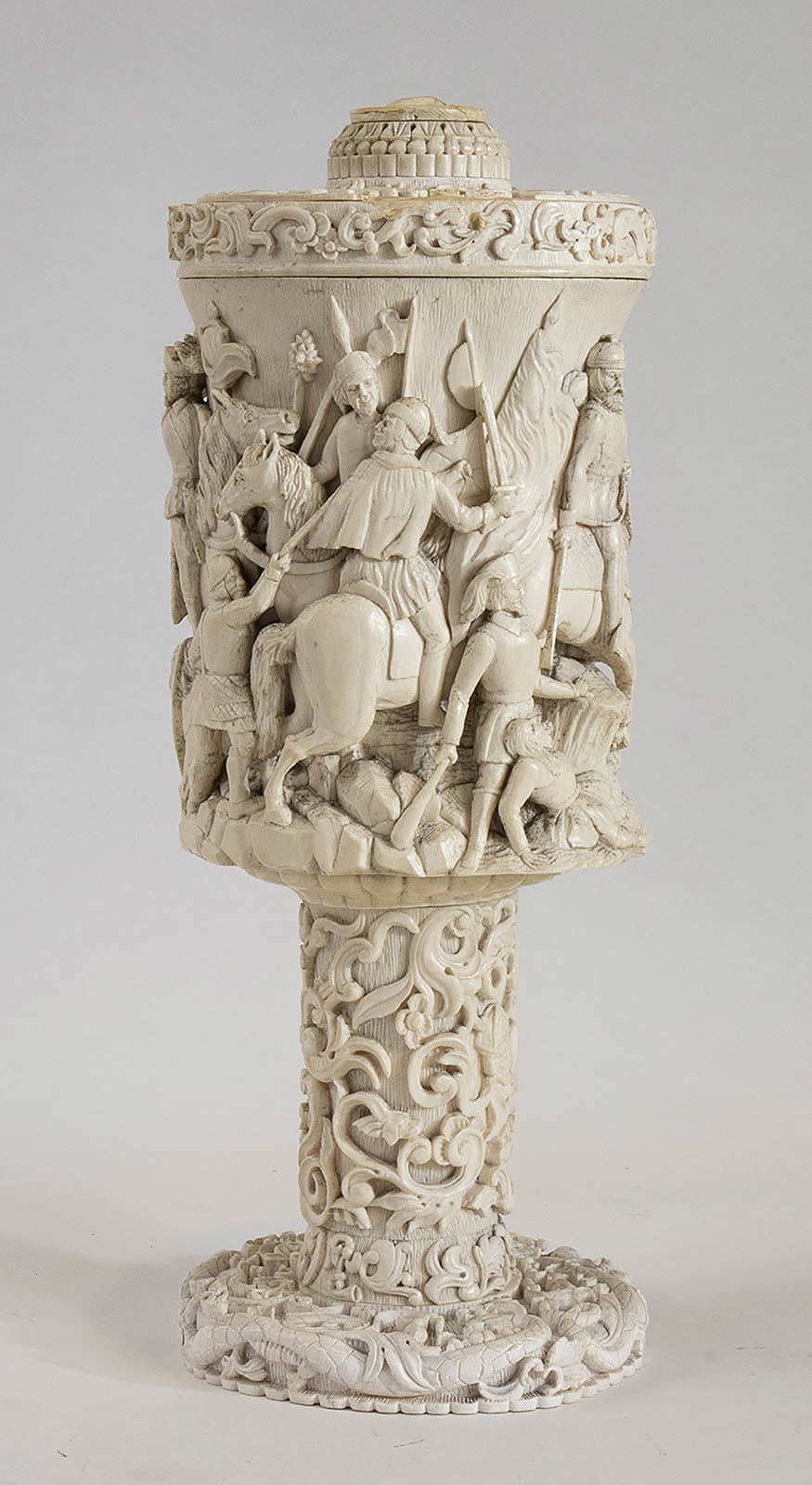 in avorio di elefante scolpito (Loxodonta africana Blumenbach, 1797 o Elephas maximus Linnaeus, 1758), raffigurante scena di battaglia con decapitazione. Diametro di base 14,7 cm, altezza 38,8 cm. Peso 2770 gr. Stato di conservazione: **** buono. Certificato di Antichità Ce.S.Ar. (pre-1947).