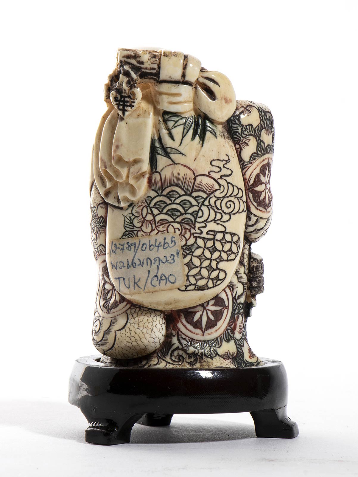 in avorio di elefante (Elephas maximus Linnaeus, 1758 o Loxodonta africana Blumenbach, 1797) policromo raffigurante un Buddha. Altezza scultura 17,5 cm, con base lignea 20 cm. Peso scultura 353 gr. Stato di conservazione: **** buono. Certificato di Antichità Ce.S.Ar. (pre-1947).