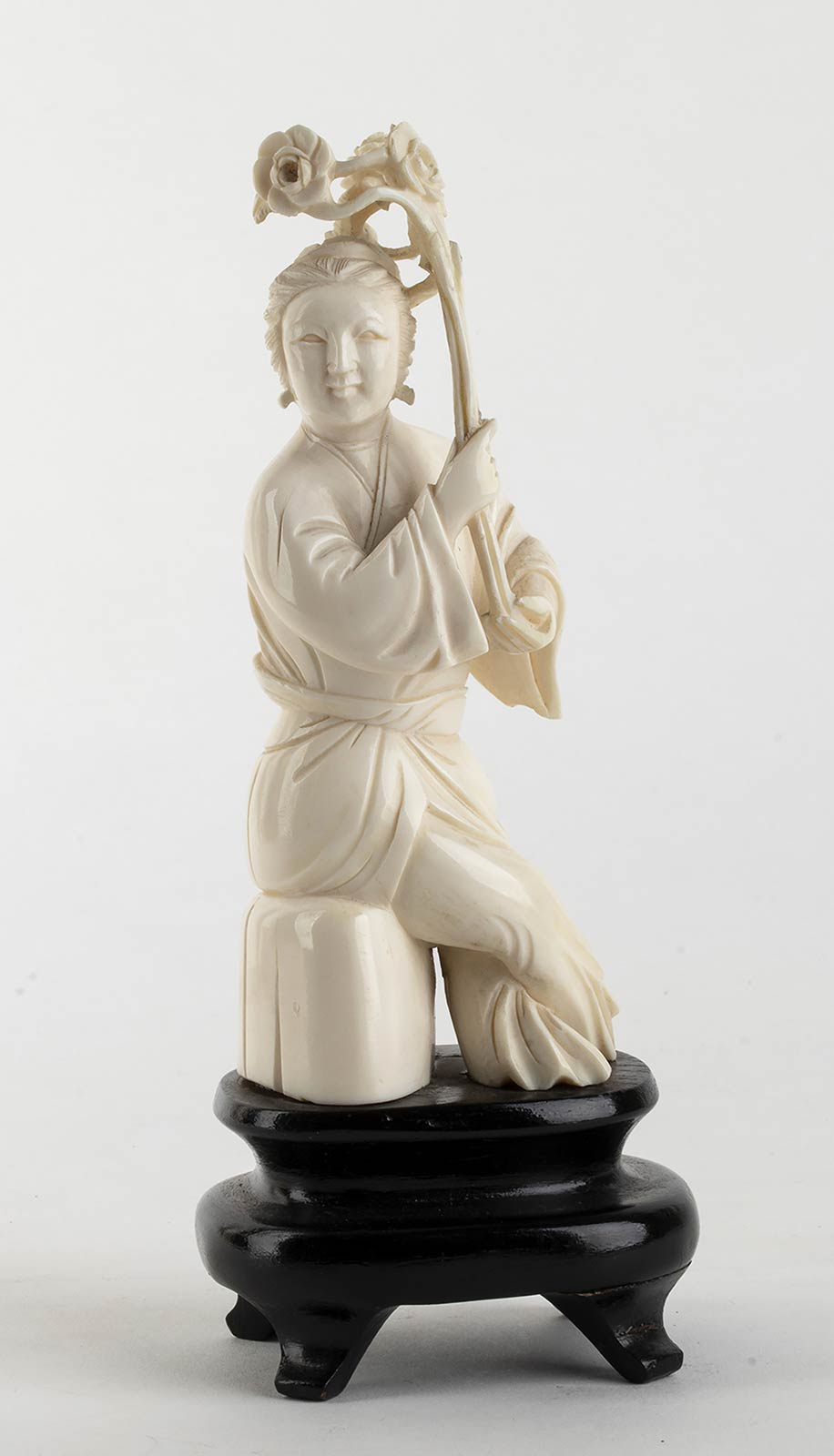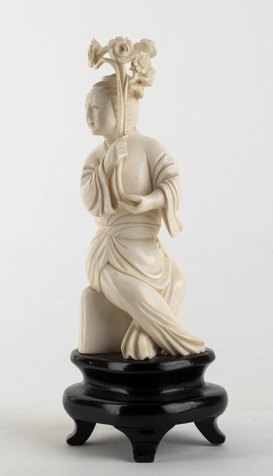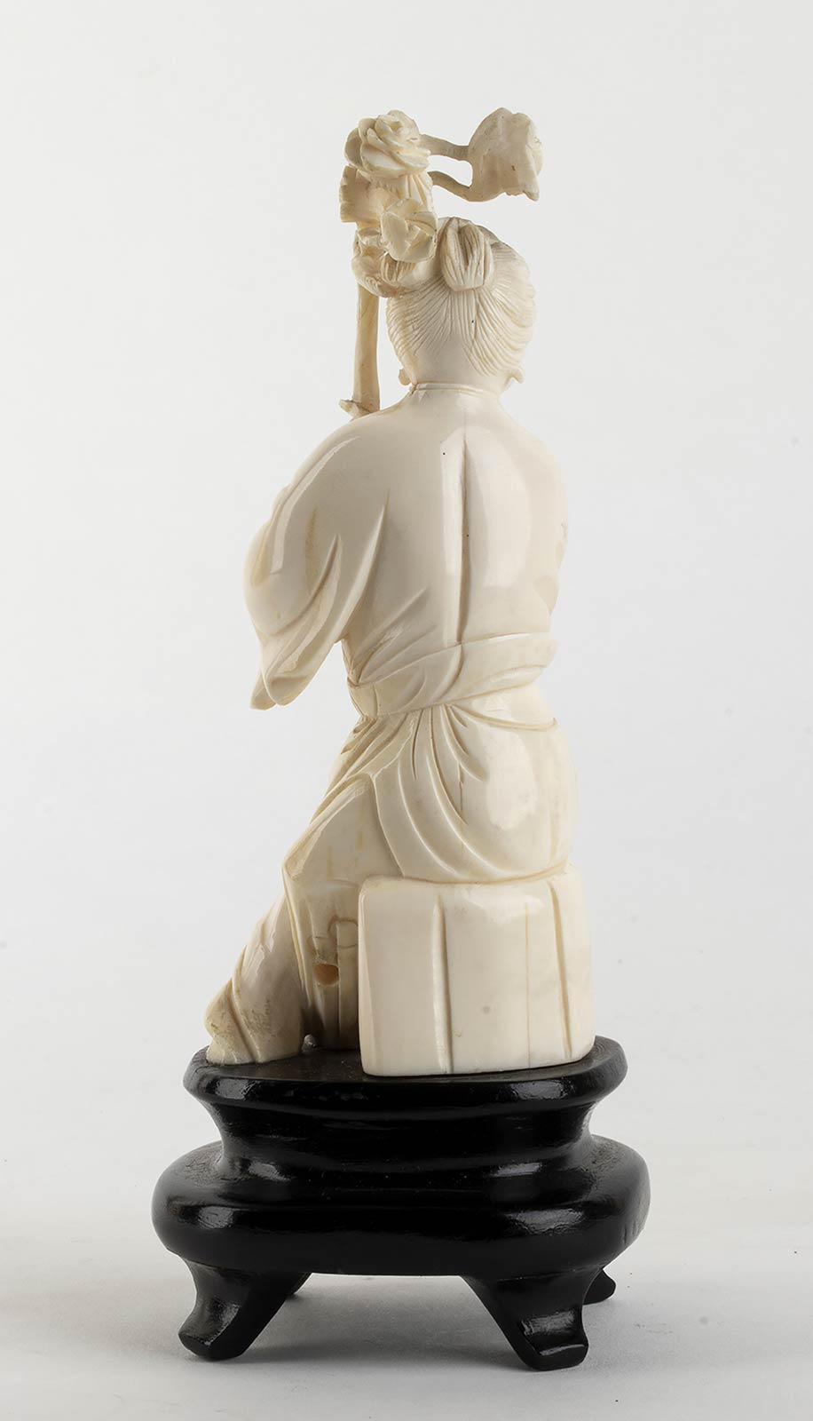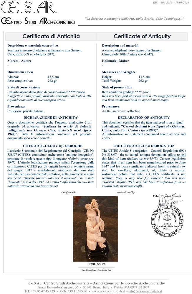 avorio di elefante scolpito (Elephas maximus Linnaeus, 1758 o Loxodonta africana Blumenbach, 1797). Altezza 13,5 cm. Peso 262 gr. Stato di conservazione: **** buono. Certificato di Antichità Ce.S.Ar. (pre-1947).