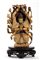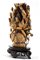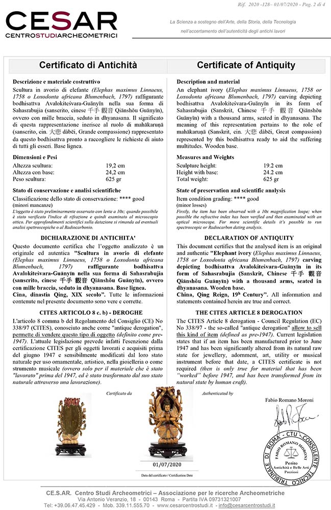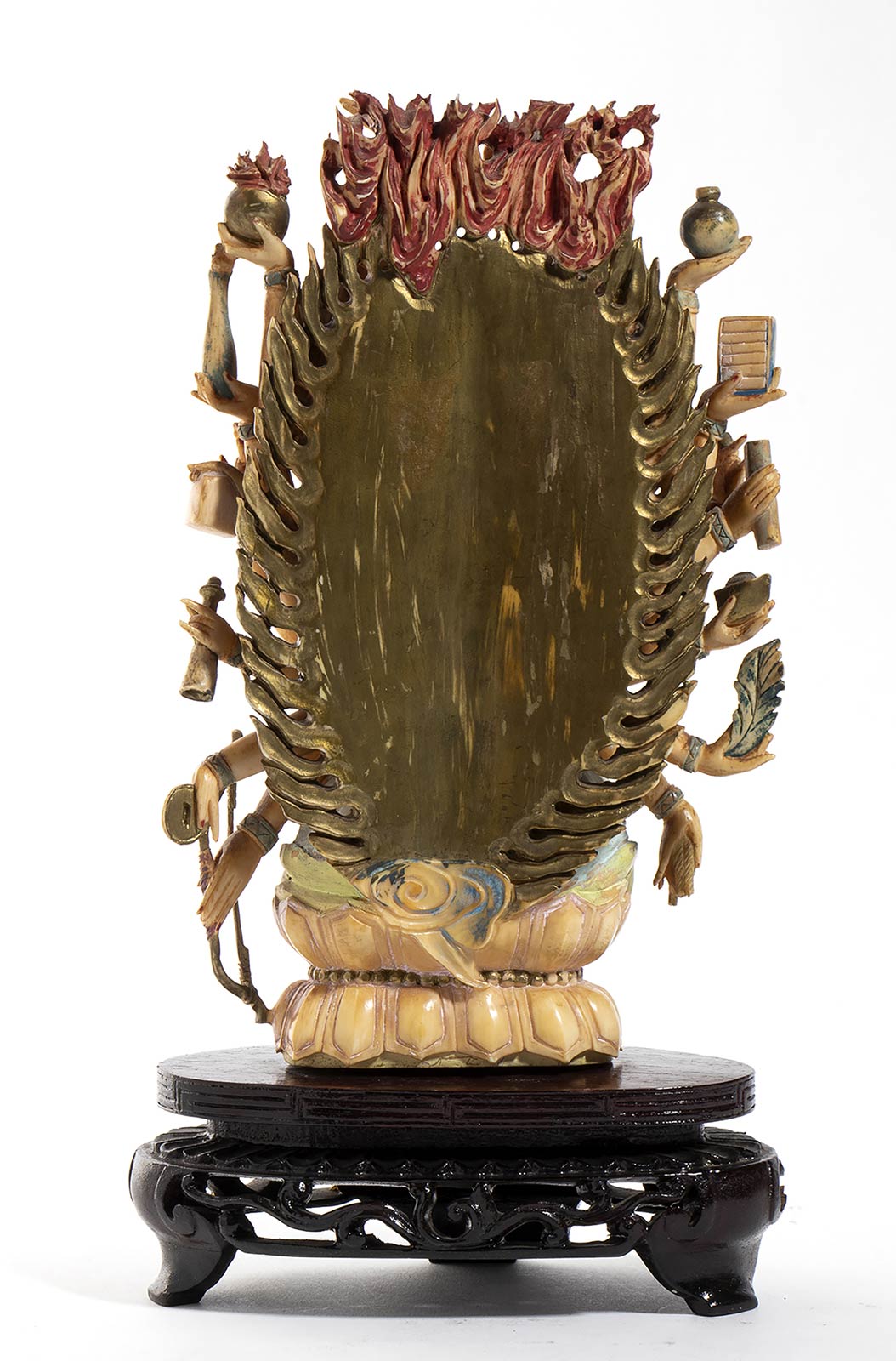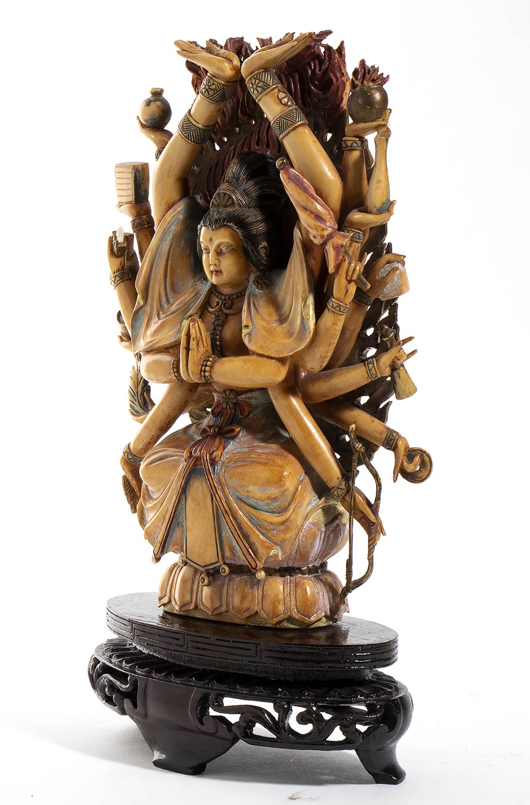 in avorio di elefante scolpito (Elephas maximus Linnaeus, 1758 o Loxodonta africana Blumenbach, 1797) raffigurante bodhisattva Avalokiteśvara-Guānyīn nella sua forma di Sahasrabujia (sanscrito, cinese 千手 觀音 Qiānshǒu Guānyīn), ovvero con mille braccia, seduto in dhyanasana. Il significato di questa rappresentazione inerisce al ruolo di mahākaruṇā (sanscrito, cin. 大悲 dàbēi, Grande compassione) rappresentato da questo bodhisattva pronto a raccogliere le richieste di aiuto di tutti gli esseri. Altezza scultura 19,2 cm, con base lignea 24,2 cm. Peso scultura 625 gr. Stato di conservazione: **** buono (minori mancanze). Certificato di Antichità Ce.S.Ar. (pre-1947).