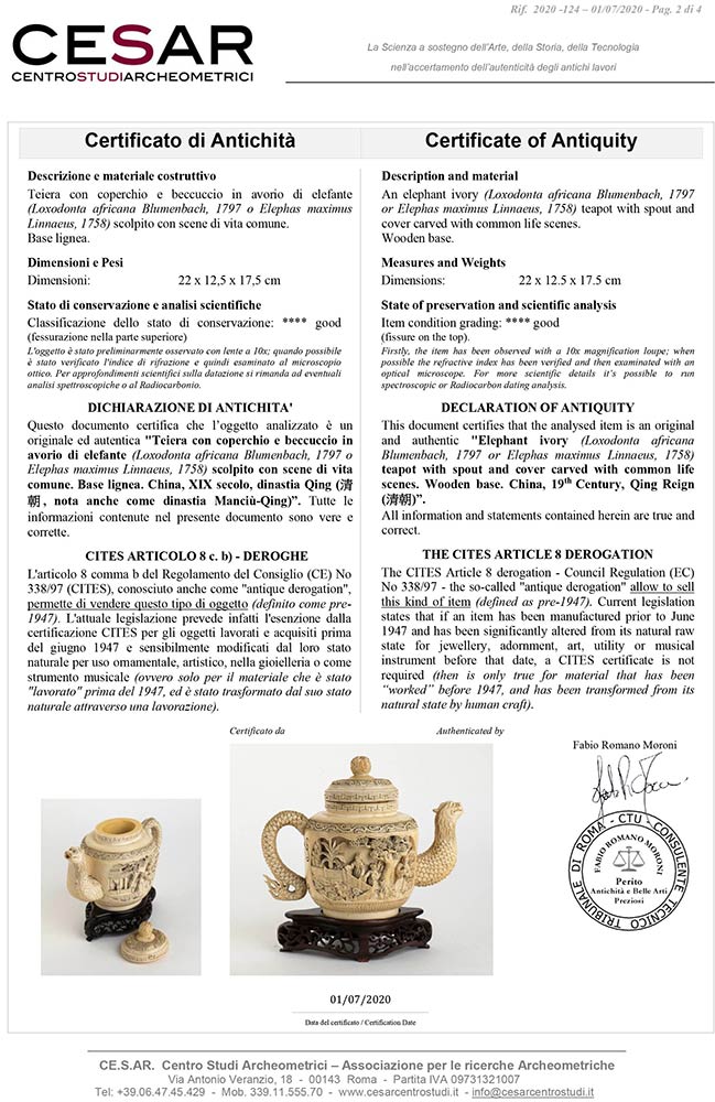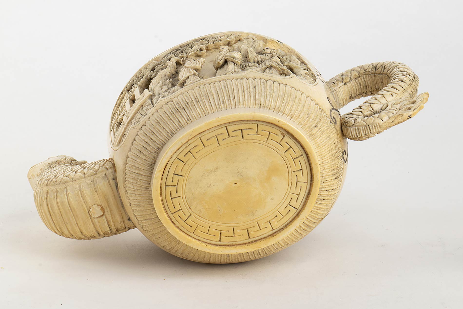 con coperchio e beccuccio in avorio di elefante (Loxodonta africana Blumenbach, 1797 o Elephas maximus Linnaeus, 1758) scolpita scene di vita comune. Base lignea. dimensioni 22 x 12,5 cm, altezza 17,5 cm. Stato di conservazione: **** buono (fessurazione nella parte superiore). Certificato di Antichità Ce.S.Ar. (pre-1947).