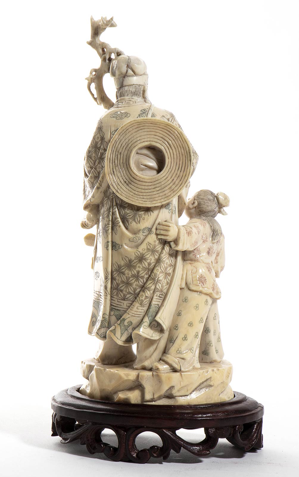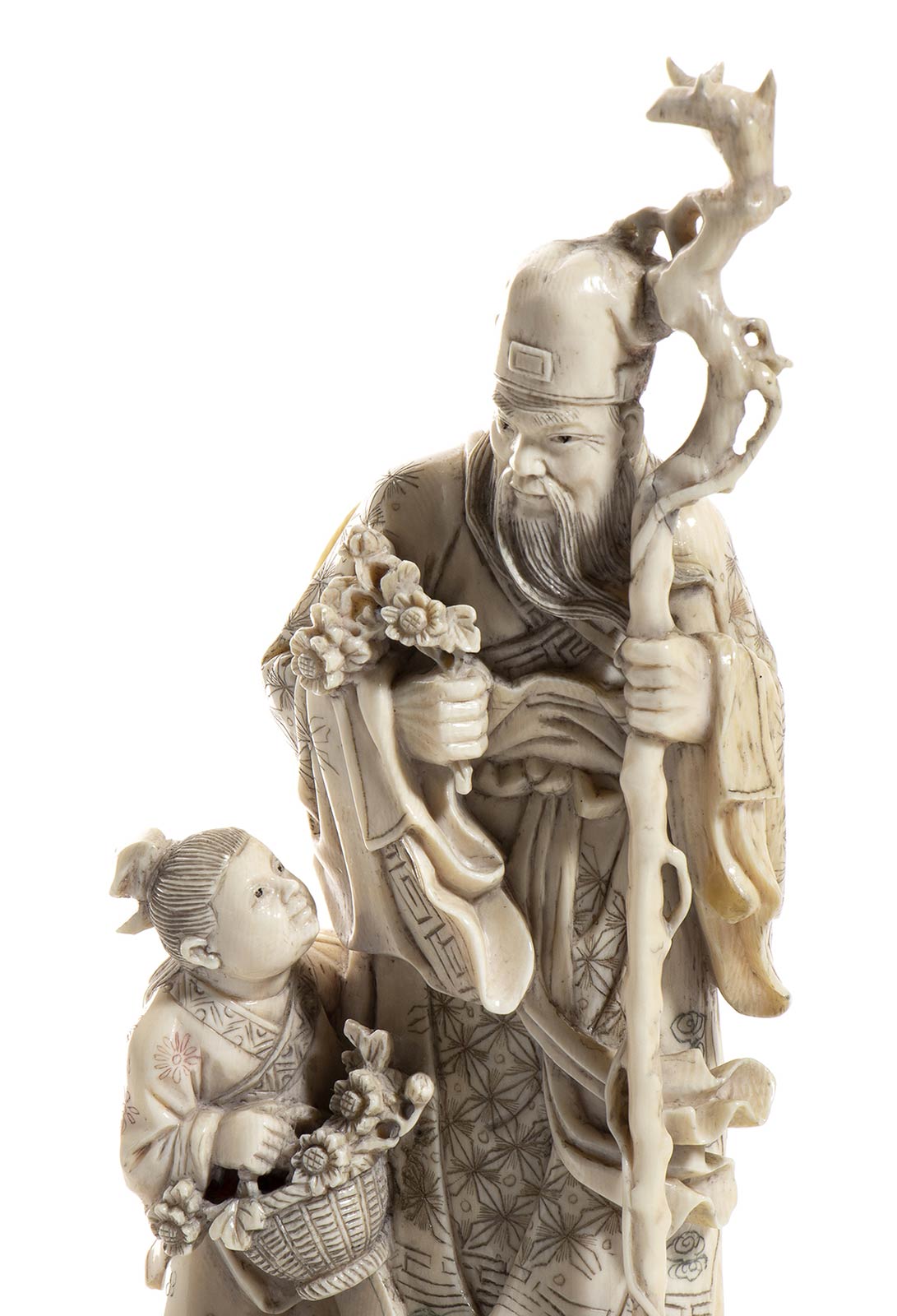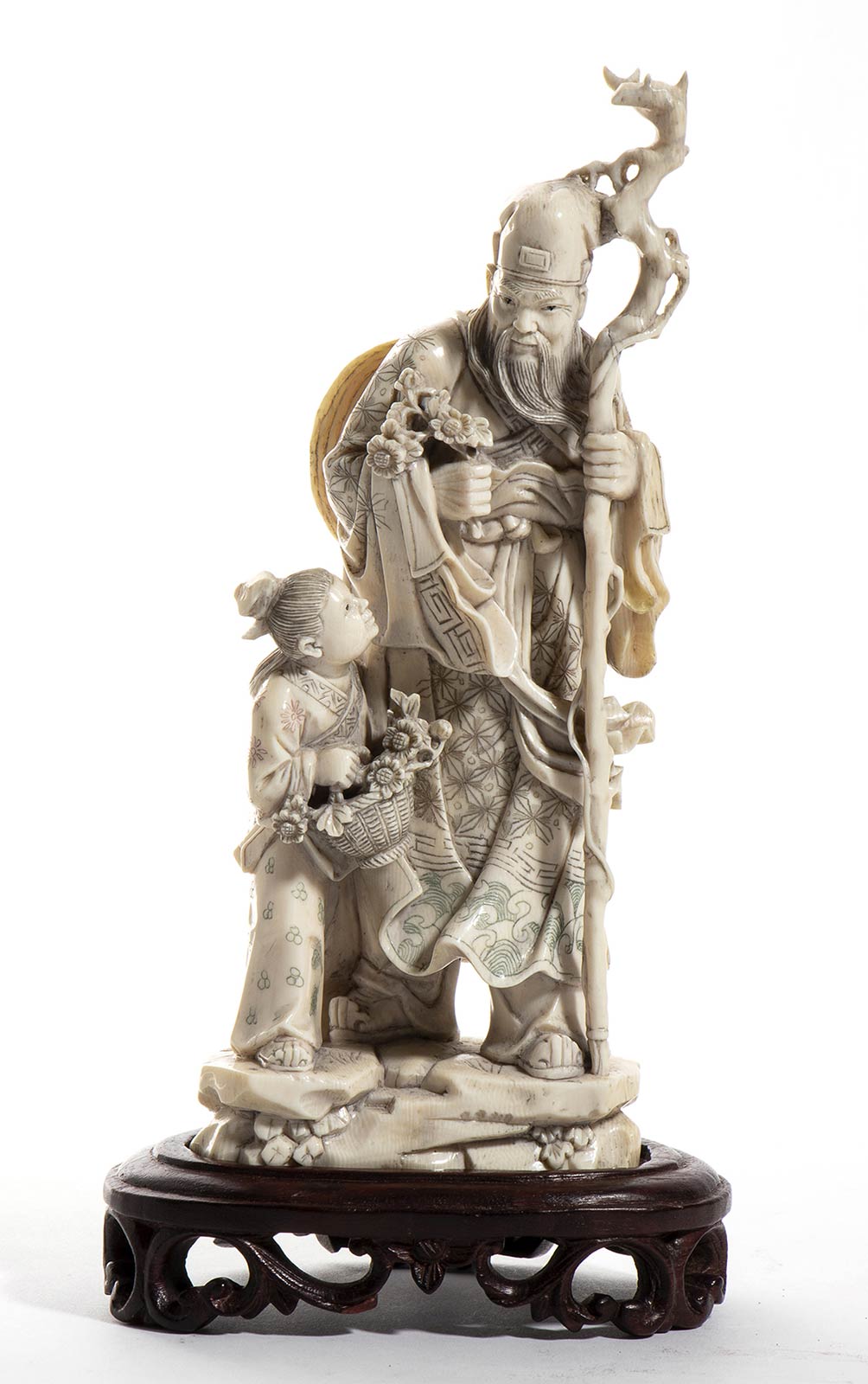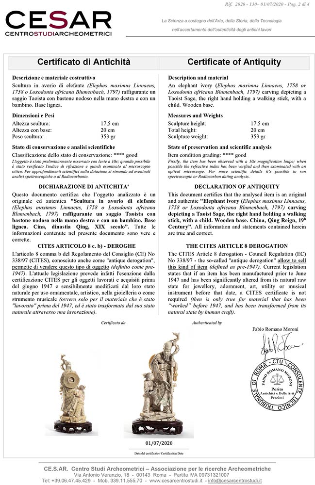 in avorio di elefante scolpito (Elephas maximus Linnaeus, 1758 o Loxodonta africana Blumenbach, 1797) raffigurante un saggio Taoista con bastone nodoso nella mano destra e con un bambino. Altezza scultura 17,5 cm, con base lignea 20 cm. Peso scultura 353 gr. Stato di conservazione: **** buono. Certificato di Antichità Ce.S.Ar. (pre-1947).