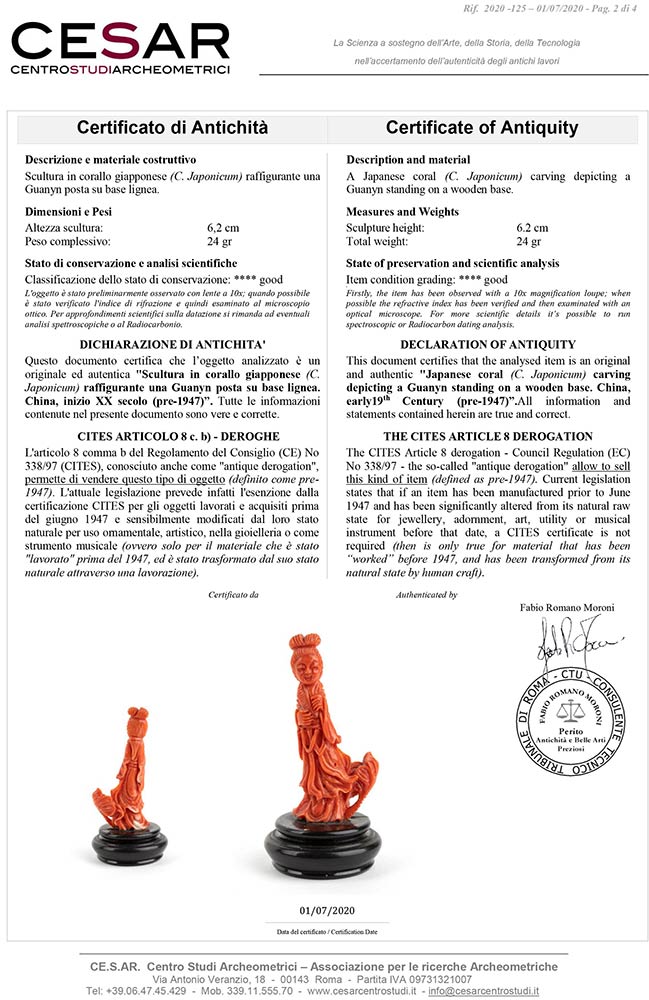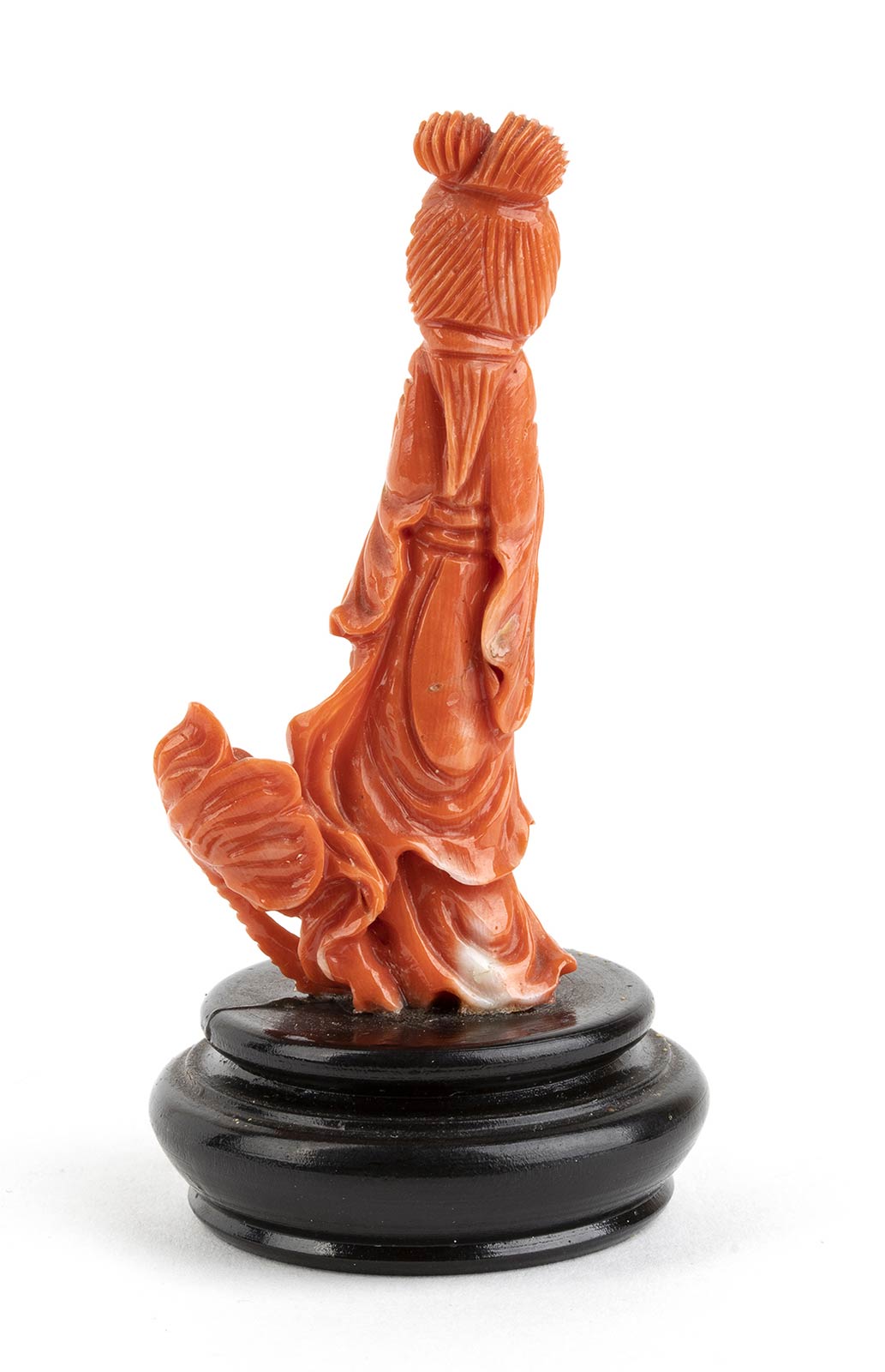 corallo giapponese (C. Japonicum) raffigurante una Guanyn su base lignea. Altezza scultura 6,2 cm. Peso totale 24 gr. Stato di conservazione: **** buono. Certificato di Antichità Ce.S.Ar. (pre-1947).
