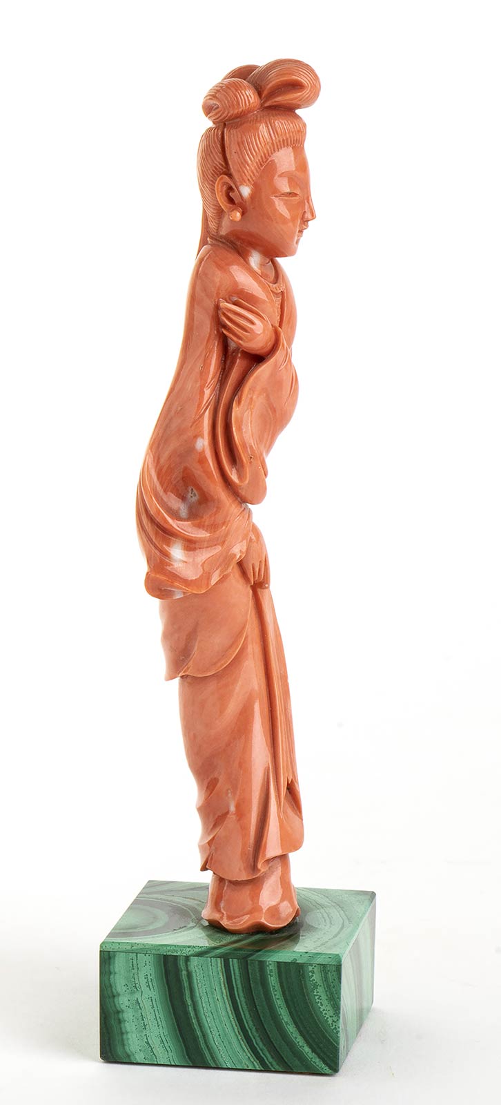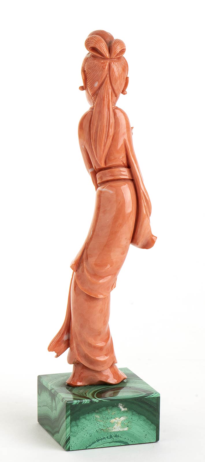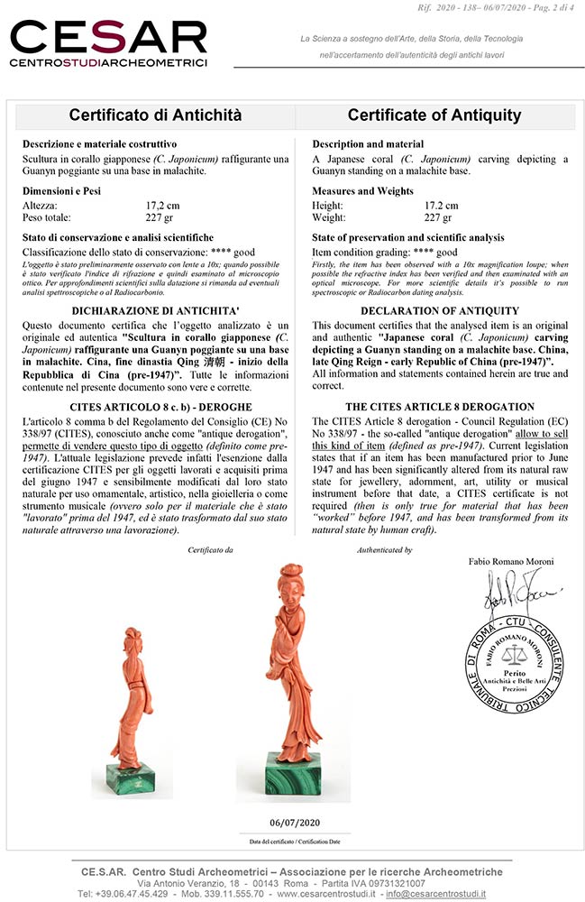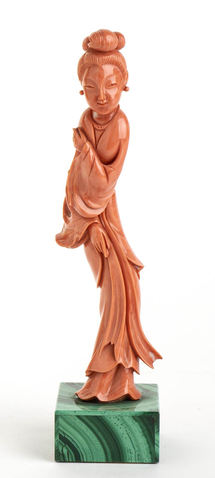 corallo giapponese (C. Japonicum) raffigurante una Guanyn con base in malachite. Altezza 17,2 cm. Peso totale 227 gr. Stato di conservazione: **** buono. Certificato di Antichità Ce.S.Ar. (pre-1947).