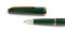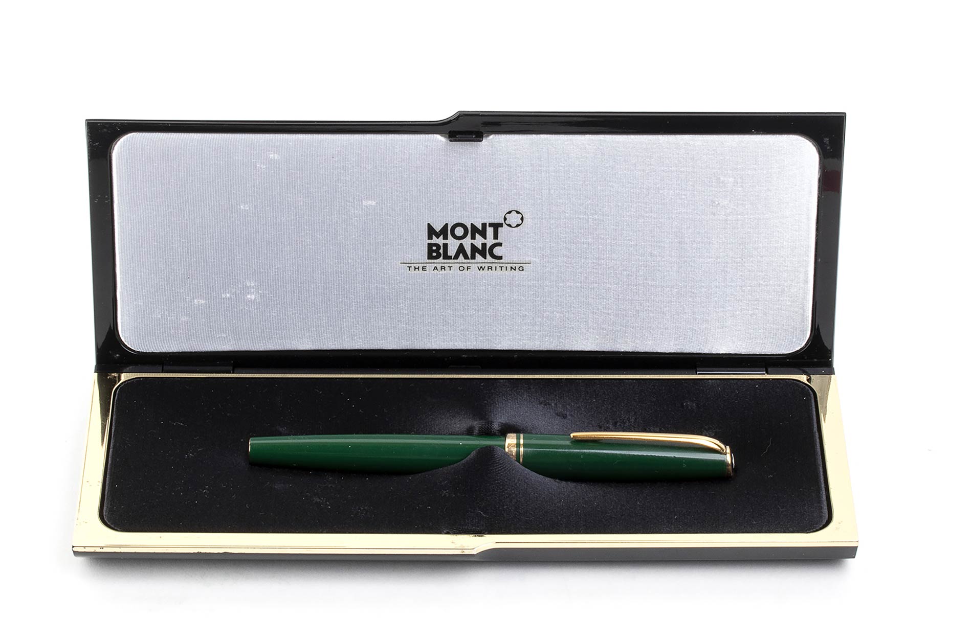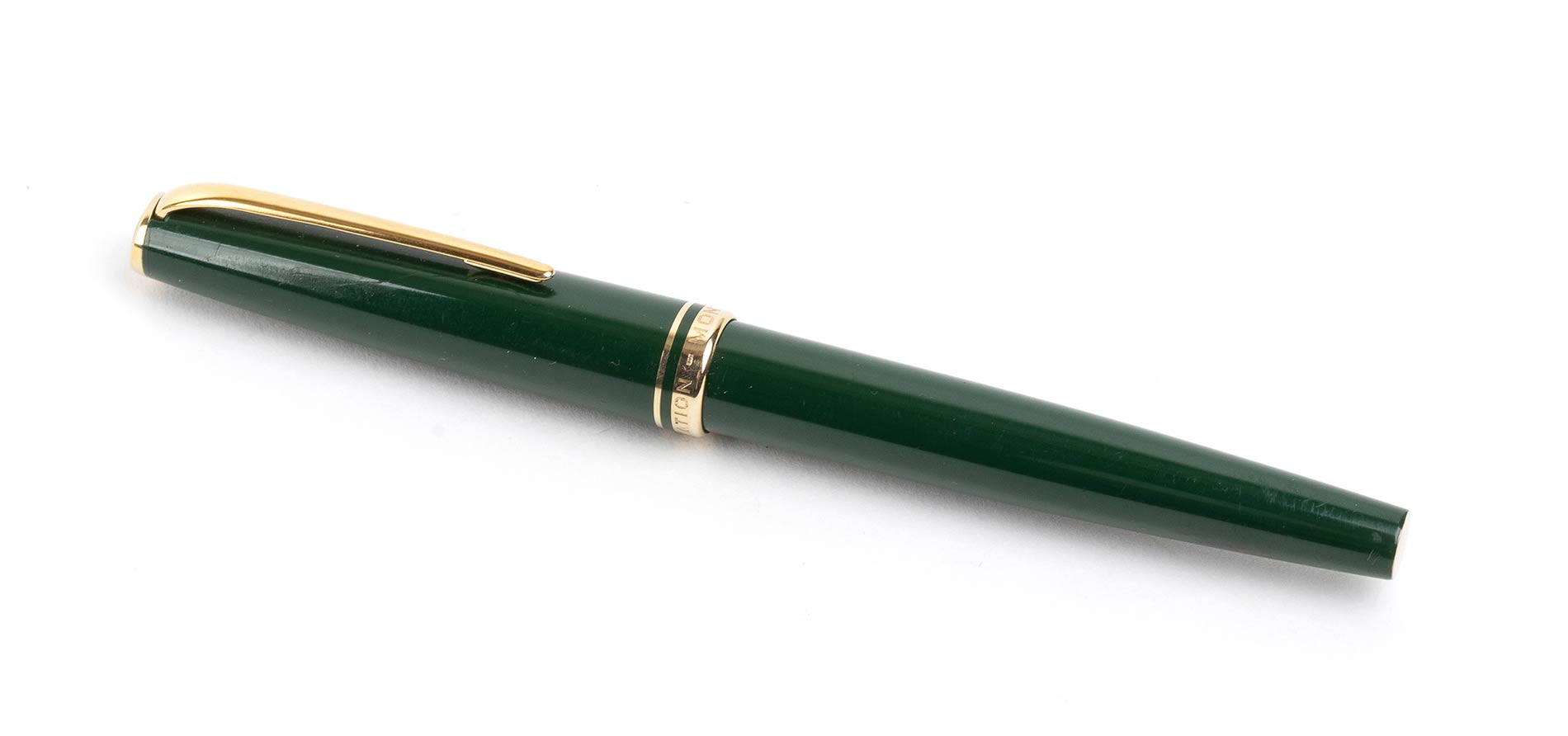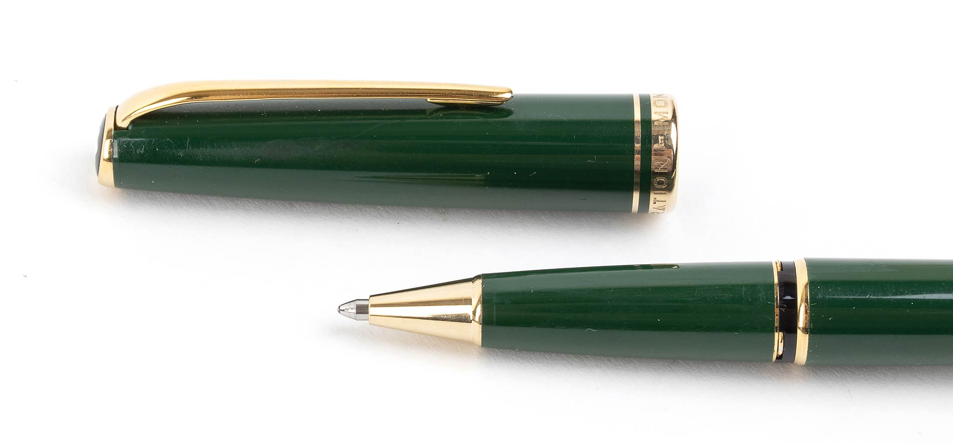 meccanismo a rotazione, corpo e cappuccio in resina verde con finiture placcate in oro. Lunghezza 13,5 cm. Stato di conservazione: *** discreto. Scatola Montblanc originale. La penna potrebbe necessitare del cambio del refill.