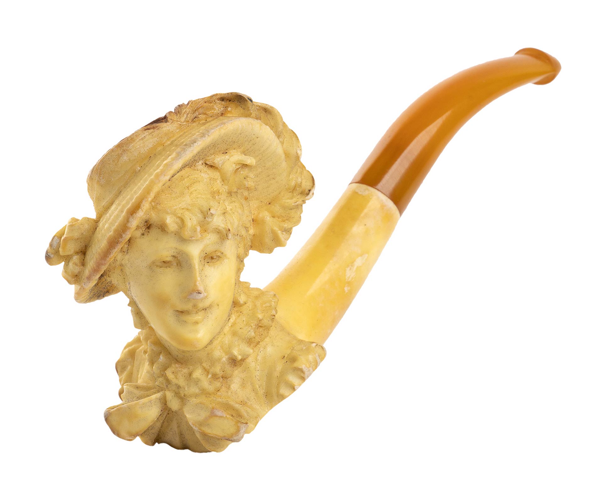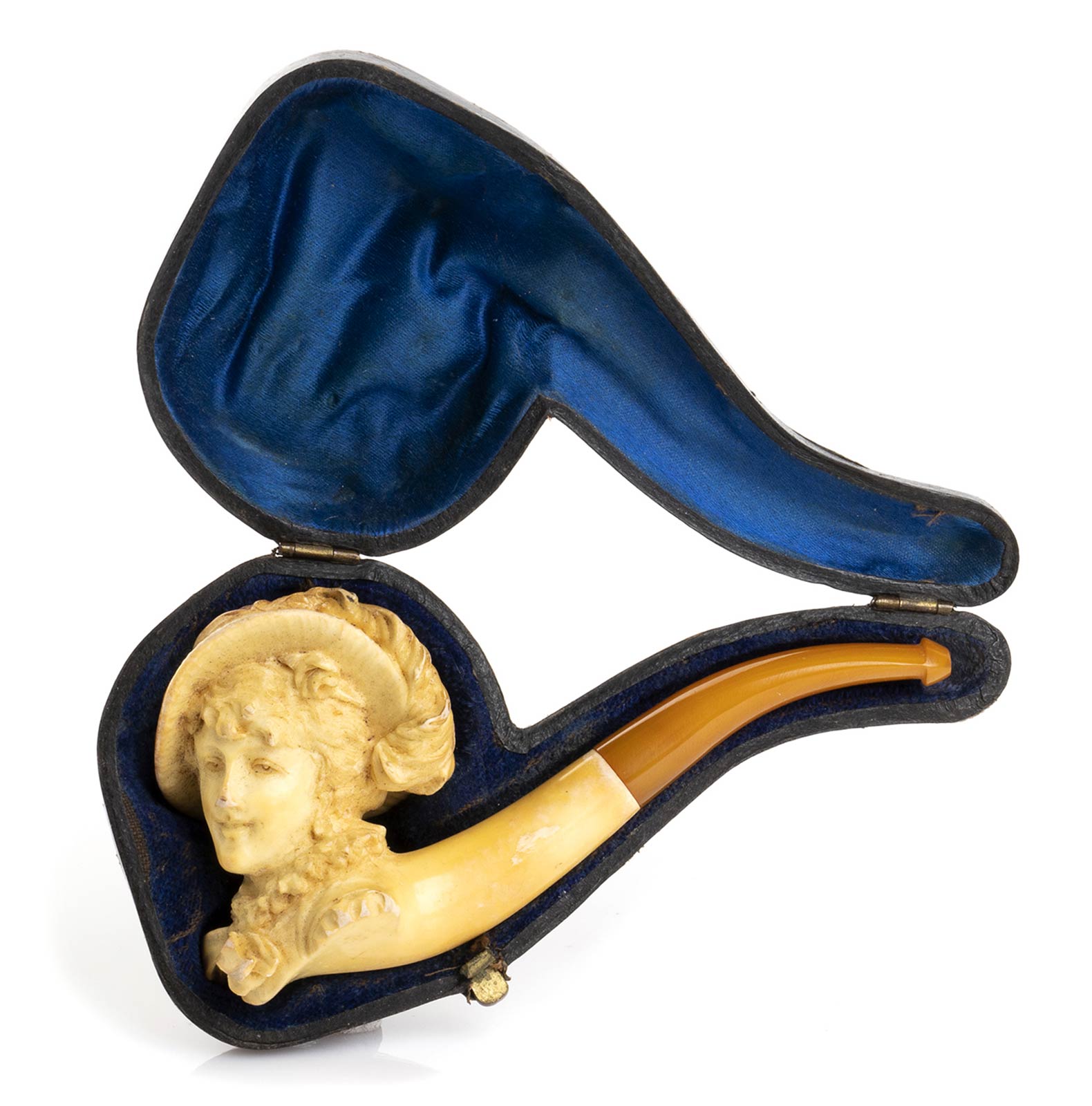 scolpita con il busto di un personaggio femminile, bocchino in ambra. Con custodia. Lunghezza 11 cm. Stato di conservazione: **** buono.