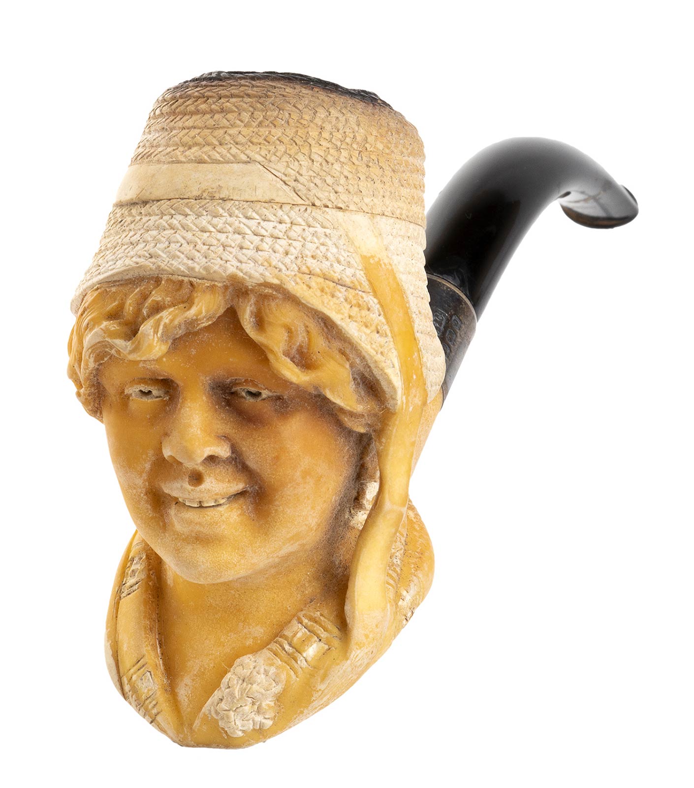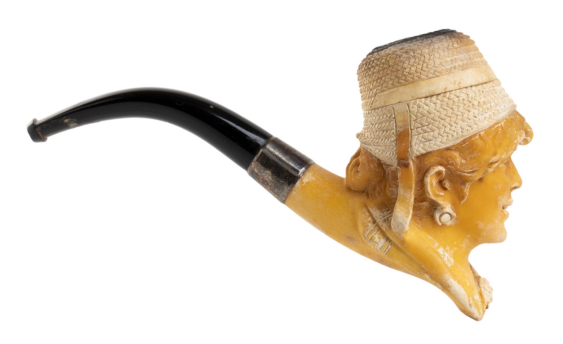 scolpita con un volto di donna con cappello. Collarino in argento 925/1000 punzonato Birmingham 1913-14. Con custodia. Lunghezza 12 cm. Stato di conservazione: **** buono.