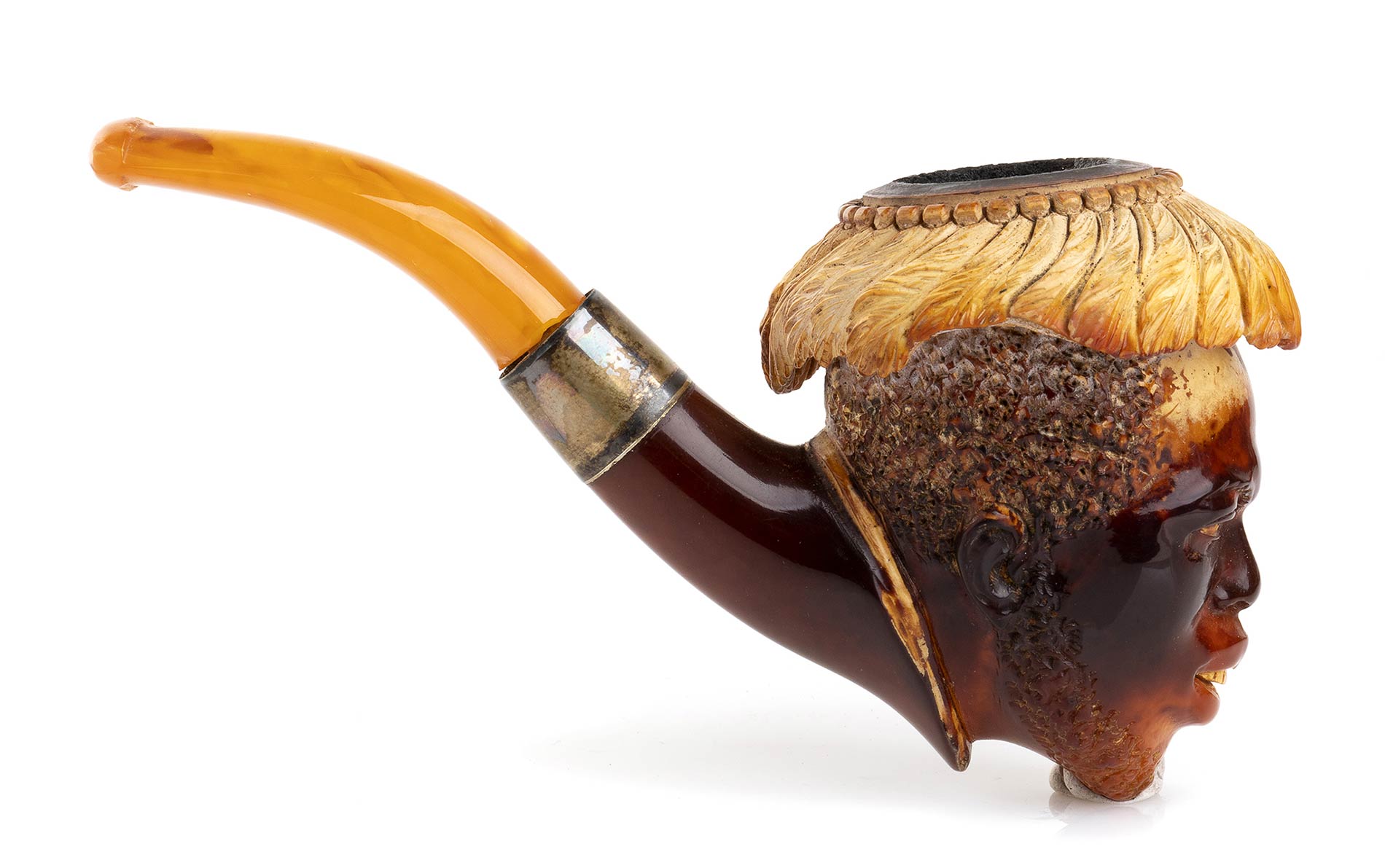 scolpita con la testa di un "moretto", bocchino in ambra. Con custodia. Lunghezza 12,5 cm. Stato di conservazione: **** buono.