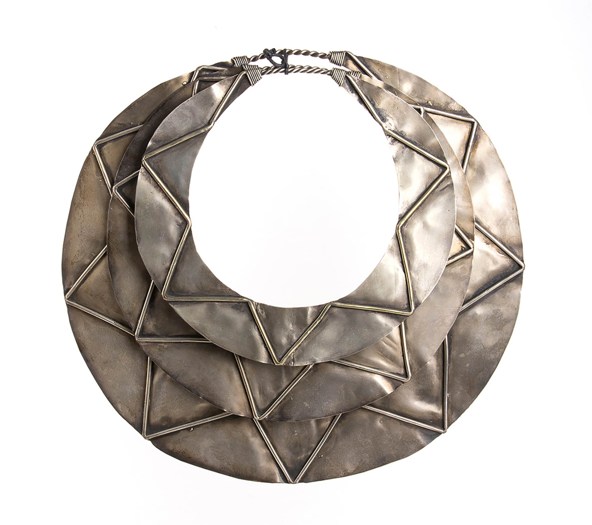 proveniente dal Villaggio HMong "Luang Pranbang" situato nel nord del Laos, è composta da tre semicerchi in lastra battuta rappresentanti il sole. Peso 690 gr. Lega in argento a basso titolo. Stato di conservazione: **** buono.