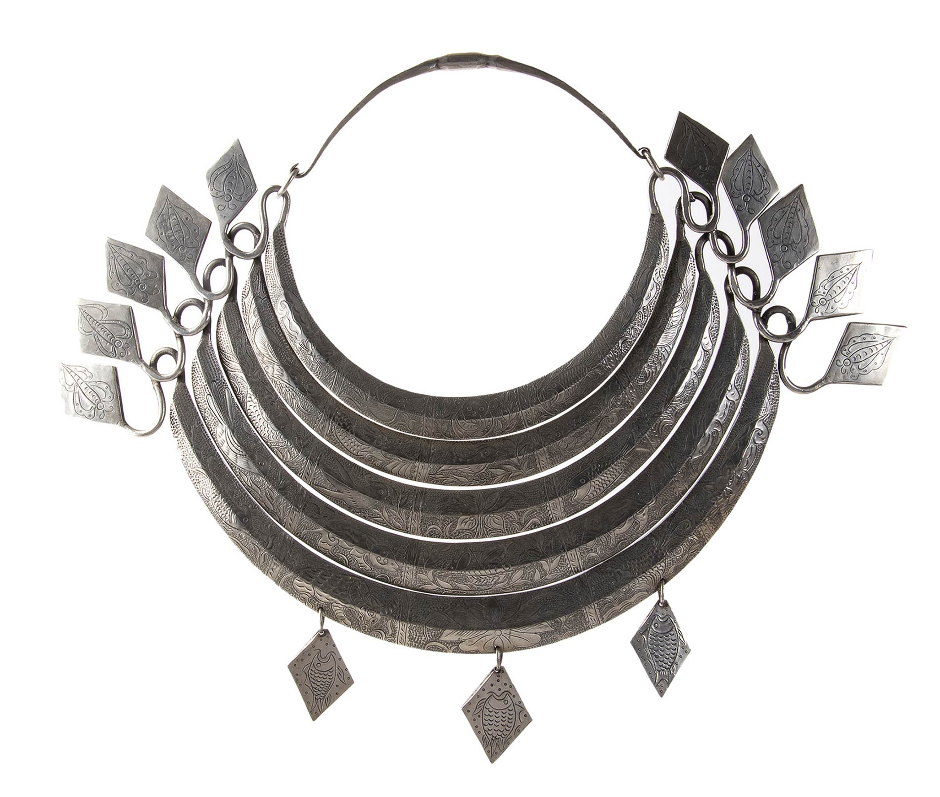 proveniente dal Villaggio HMong "Luang Pranbang" situato nel nord del Laos, è composta da cinque semicerchi a sottolineare l'importanza della famiglia di origine. Presenta decorazioni raffiguranti animali tipici del luogo (pesce, topo, drago, panda, gatto, fenice, cane, toro e maiale) ai cui lati si ripetono decorazioni con farfalle. Nel cerchio più importante, dal quale si dipartono tre pendenti con pesci, è presente un fiore di loto. Peso 1245 gr. Lega in argento a basso titolo. Stato di conservazione: **** buono.