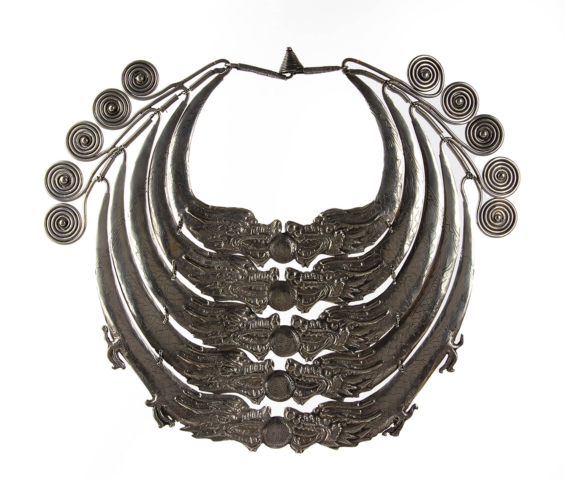 proveniente dal Villaggio HMong "Luang Pranbang" situato nel nord del Laos, è composta da cinque semicerchi a sottolineare l'importanza della famiglia di origine e presenta decorazioni che risentono dell'influenza Buddista di matrice Cinese. In essa sono rappresentati il simbolo del Tao contornato da coppie di draghi in equilibrio. Peso 2060 gr. Lega in argento a basso titolo. Stato di conservazione: ***** ottimo.