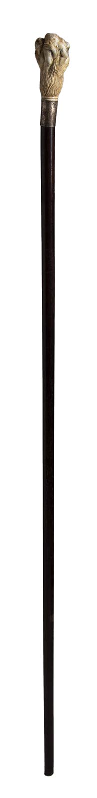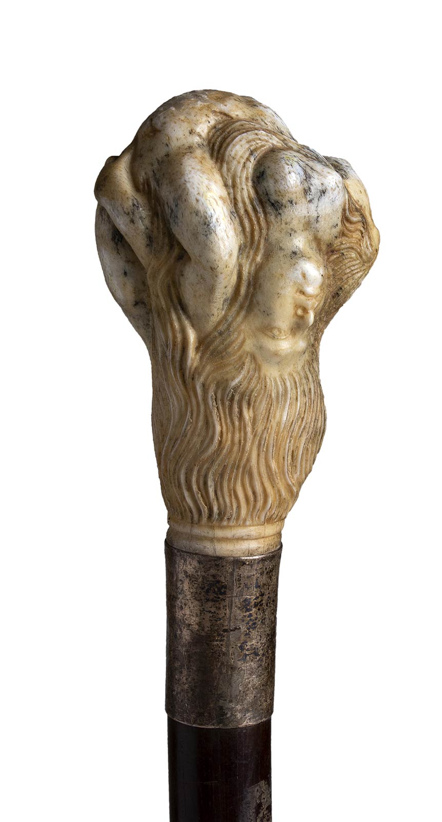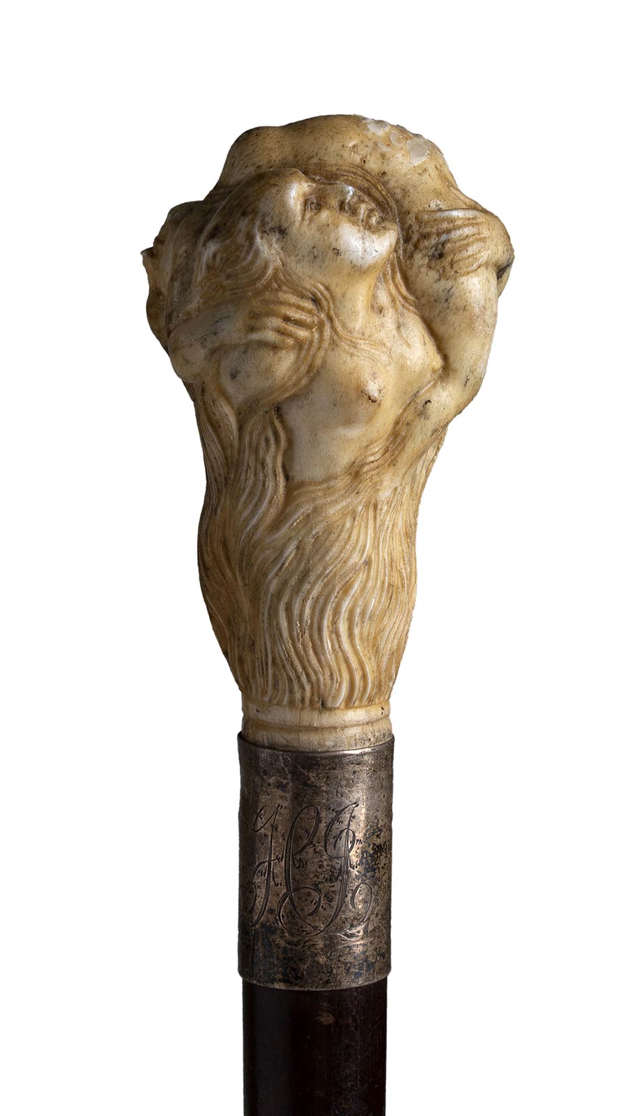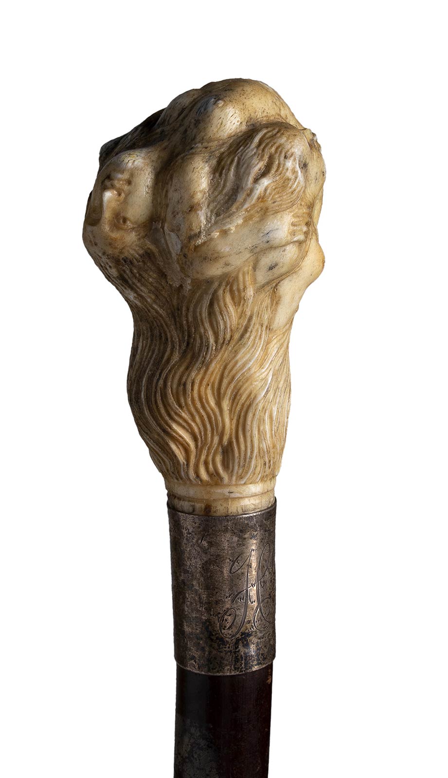 impugnatura verticale in osso scolpita con nudi femminili. Asta in mogano, collarino in argento 925/1000 punzonato Londra 1914-15 e puntale in metallo. Peso 299 gr, altezza 92,5 cm. Stato di conservazione: *** discreto (asta restaurata). Certificato di Antichità Ce.S.Ar. (pre-1947).