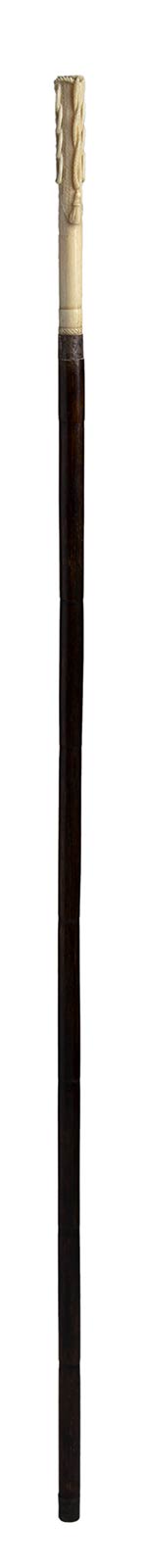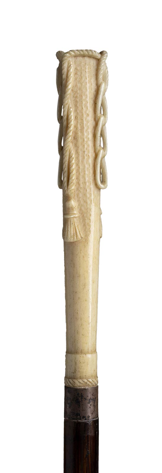 impugnatura verticale in avorio di elefante scolpita con corda e fiocchi. Asta in bamboo, collarino liscio in metallo e puntale in metallo. Peso 173 gr, altezza 90 cm. Stato di conservazione: **** buono. Certificato di Antichità Ce.S.Ar. (pre-1947).