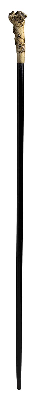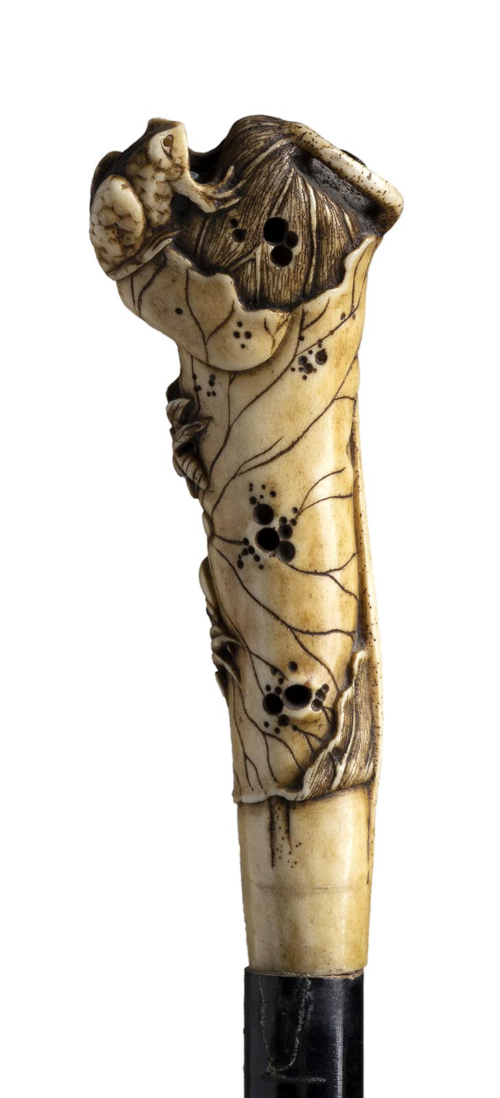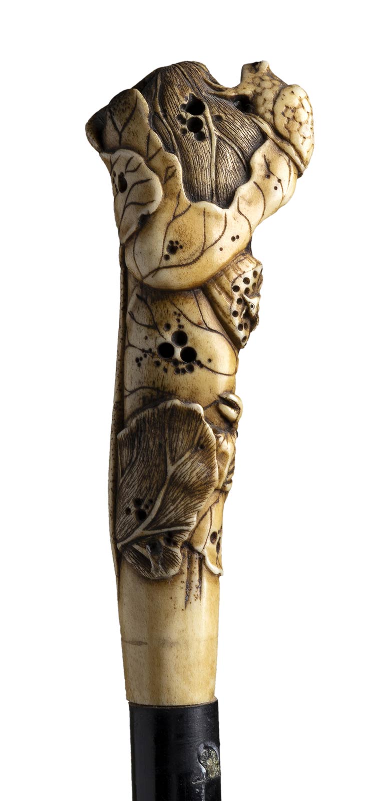 impugnatura giapponese verticale in osso scolpita con rana, granchio e farfalla. Asta in legno ebanizzato e puntale in legno. Peso 142 gr, altezza 91 cm. Stato di conservazione: **** buono.