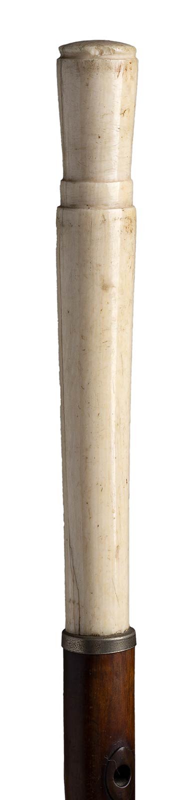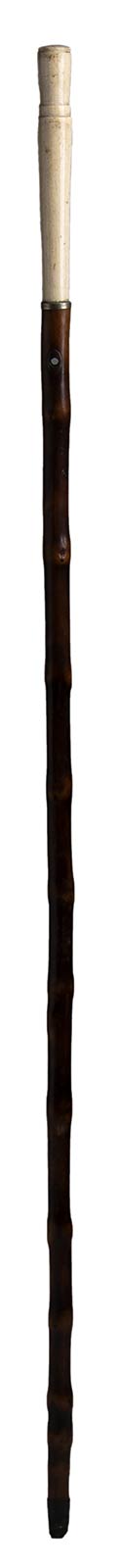 impugnatura cilindrica leggermente svasata in avorio di elefante. Asta in legno, collarino in metallo liscio e puntale in metallo. Peso 211 gr, altezza 92,5 cm. Stato di conservazione: **** buono. Certificato di Antichità Ce.S.Ar. (pre-1947).